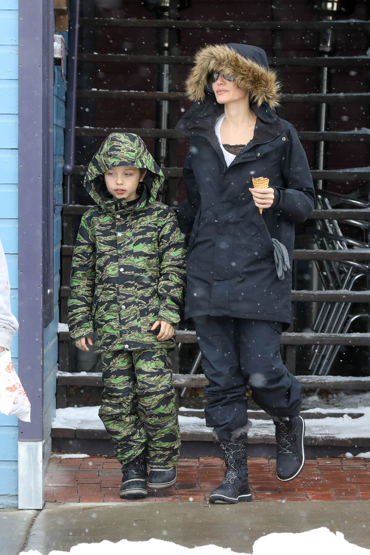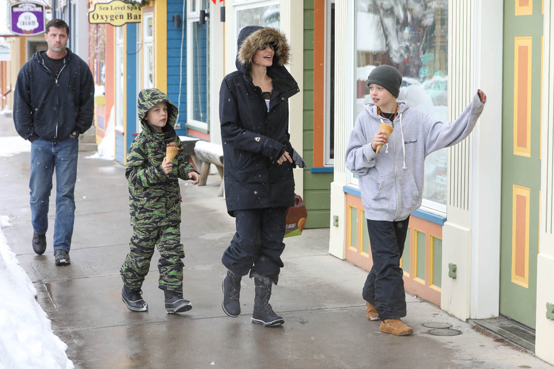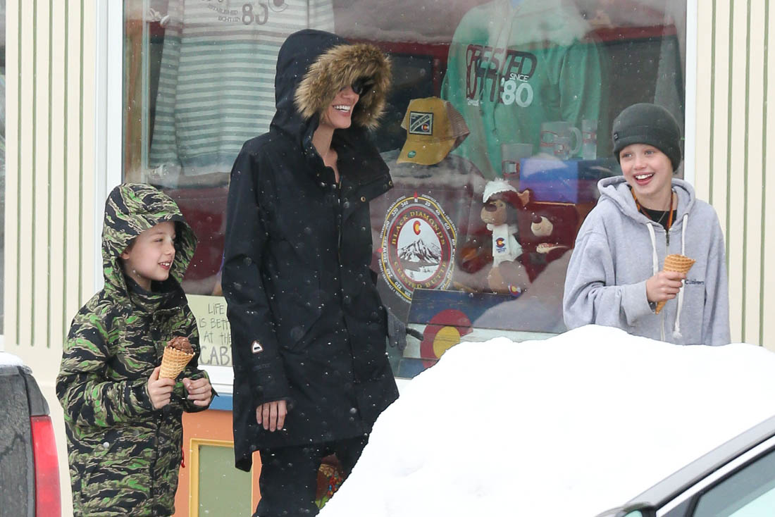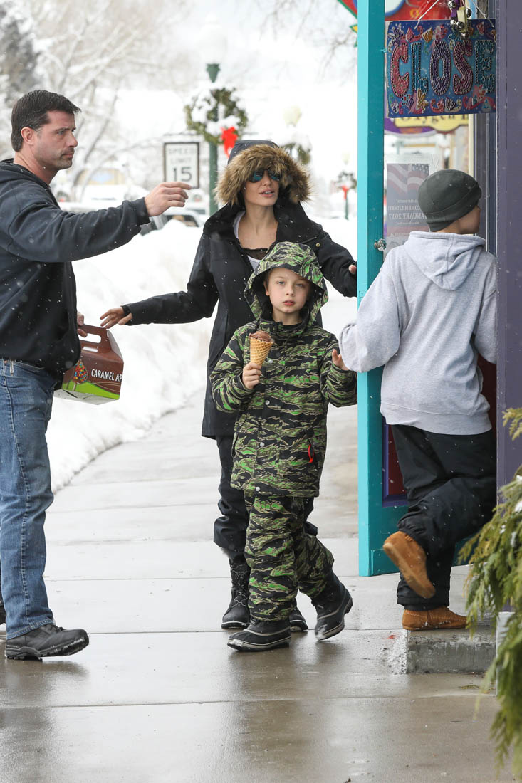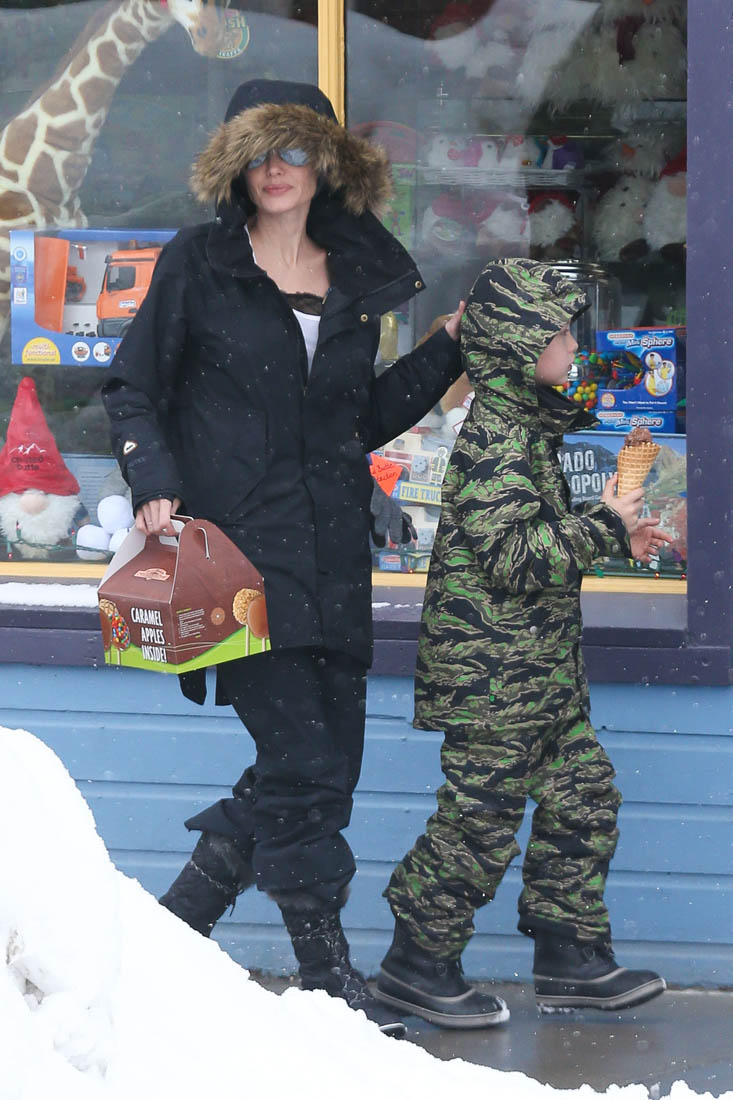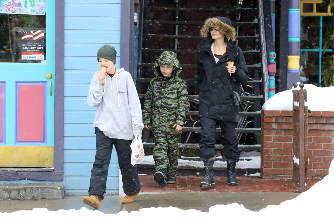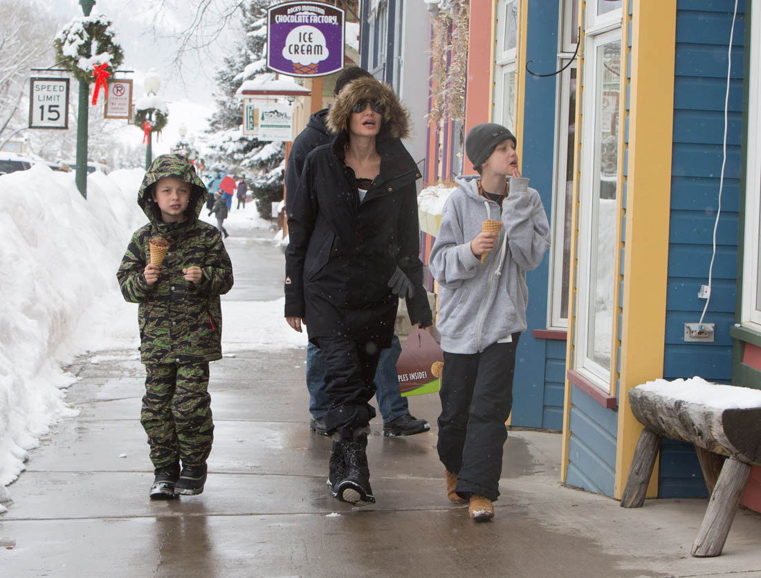 Angelina Jolie and the children were in Crested Butte, Colorado for NYE. Here she is with Shiloh and Knox out for ice cream. The Daily Mail has other photos of her with Vivienne and in some of the shots you can see that Mariane Pearl is with them. Mariane Pearl is a journalist and the widow of the late Daniel Pearl. Angelina Jolie played her in A Mighty Heart. Mariane wrote about their friendship for Glamour Magazine in 2014. So they’re on holiday together. And obviously they are still close.