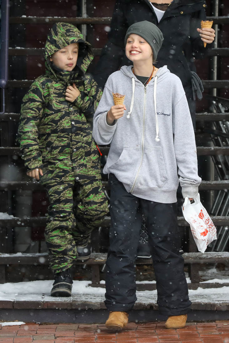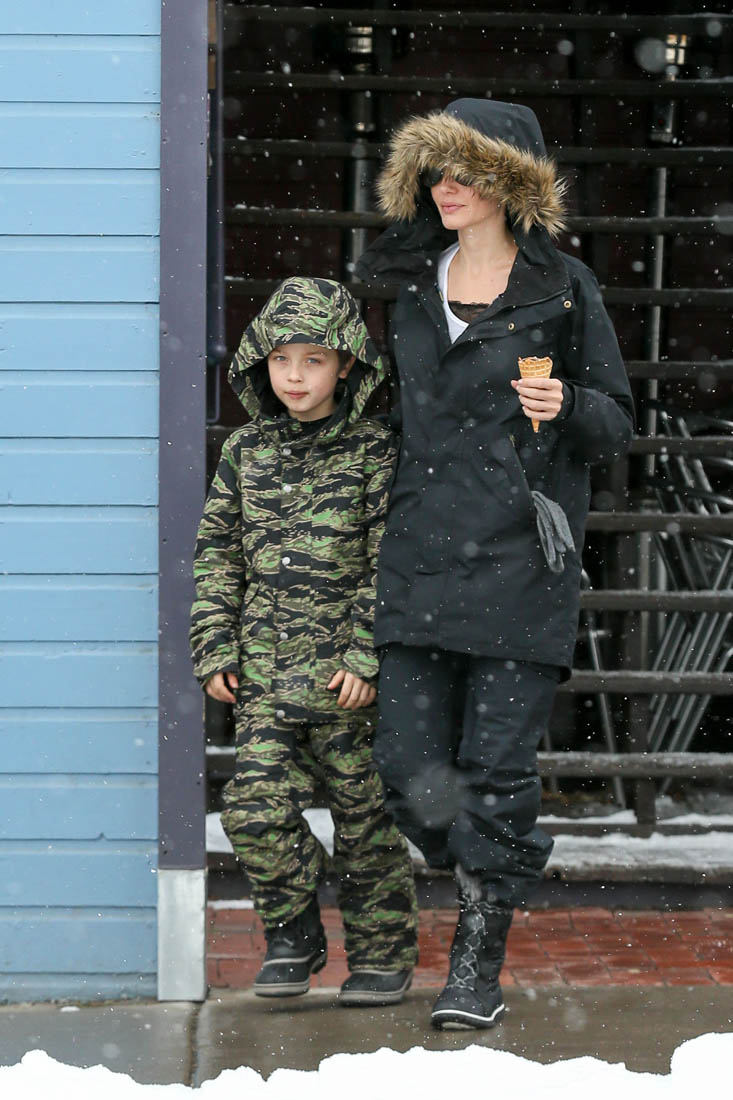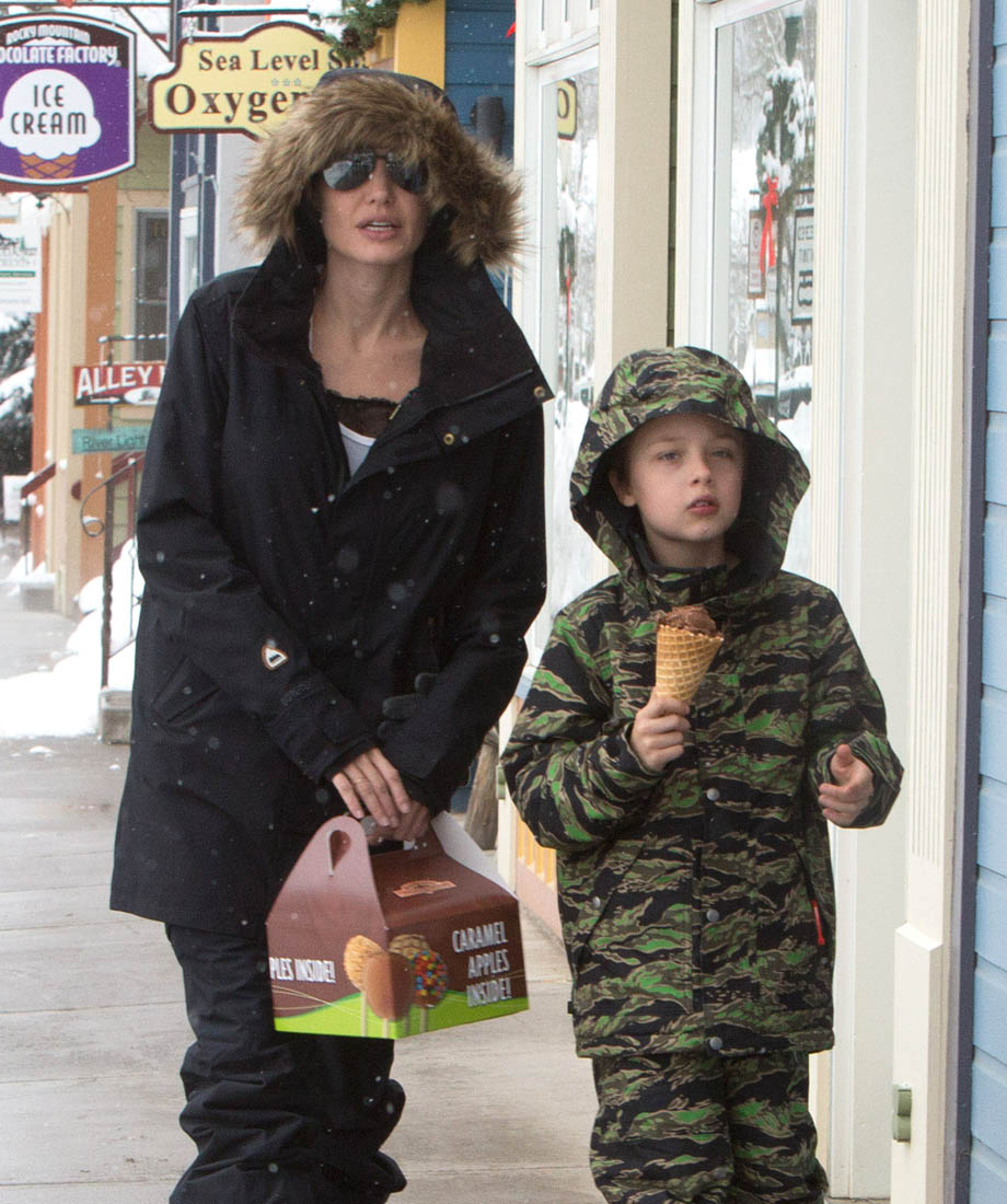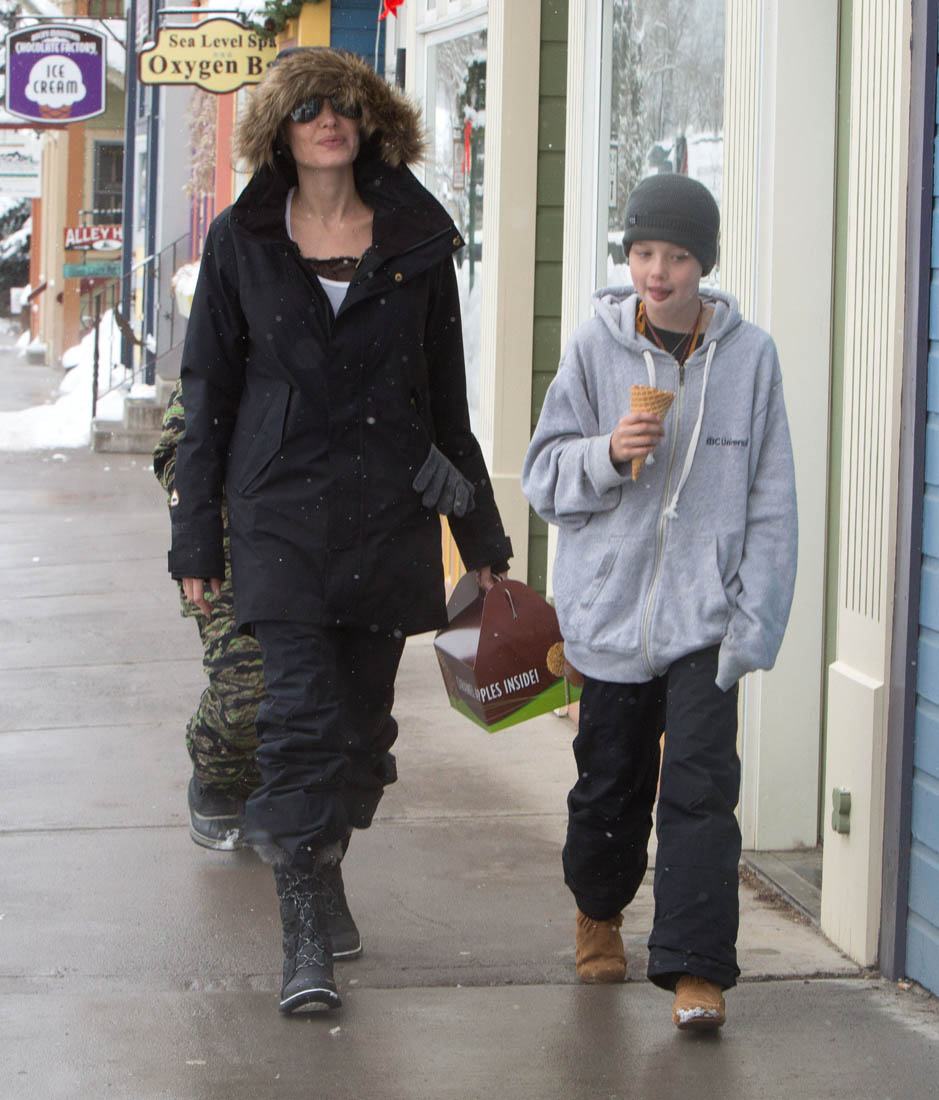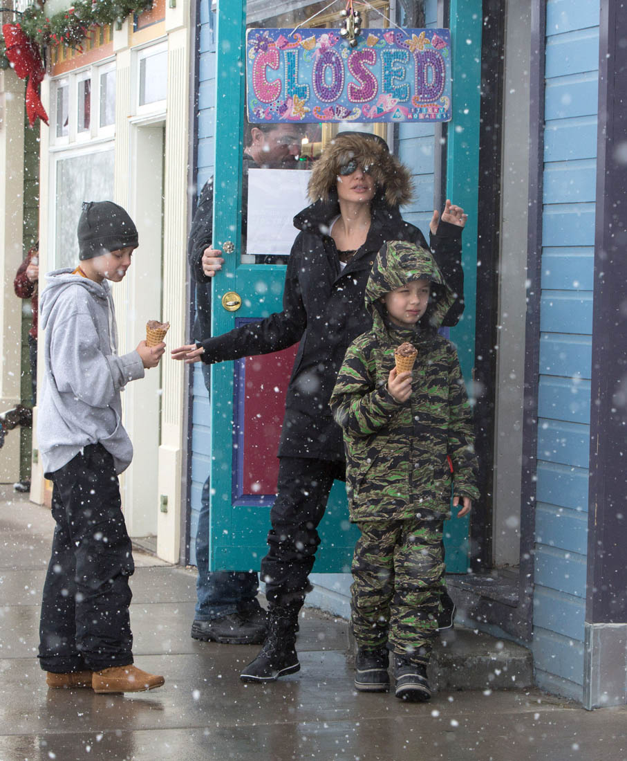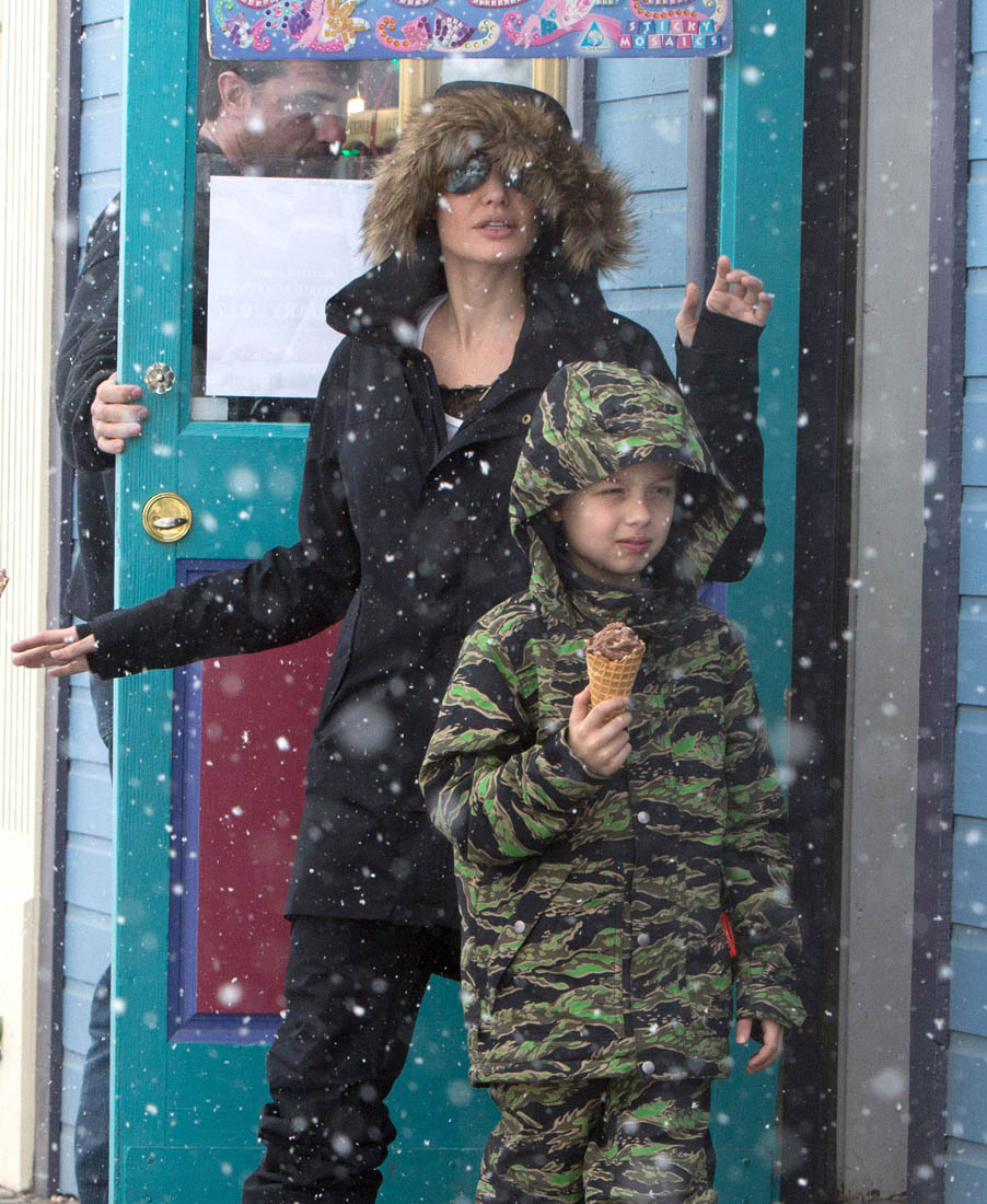 Angelina Jolie and the children were in Crested Butte, Colorado for NYE. Here she is with Shiloh and Knox out for ice cream. The Daily Mail has other photos of her with Vivienne and in some of the shots you can see that Mariane Pearl is with them. Mariane Pearl is a journalist and the widow of the late Daniel Pearl. Angelina Jolie played her in A Mighty Heart. Mariane wrote about their friendship for Glamour Magazine in 2014. So they’re on holiday together. And obviously they are still close.