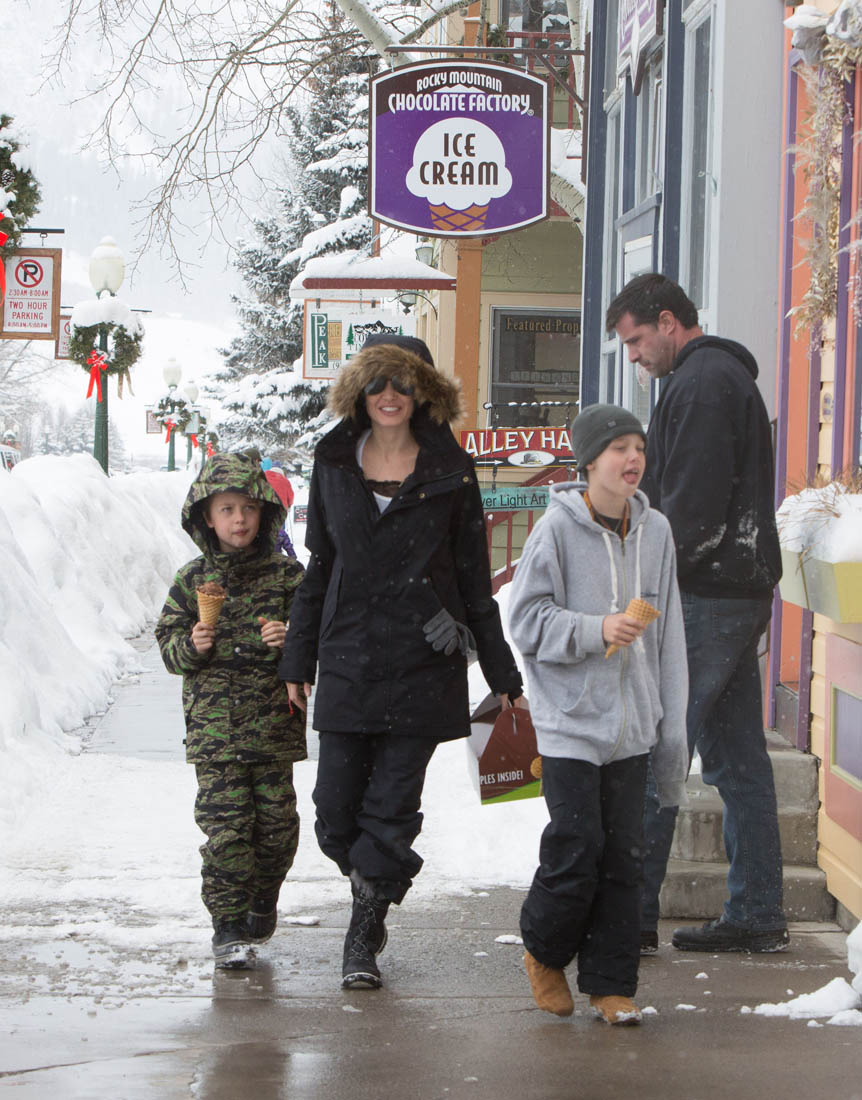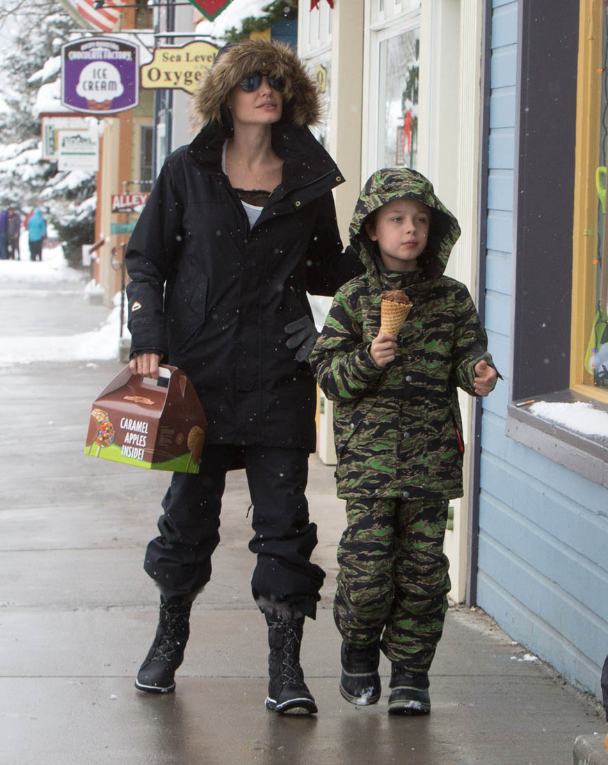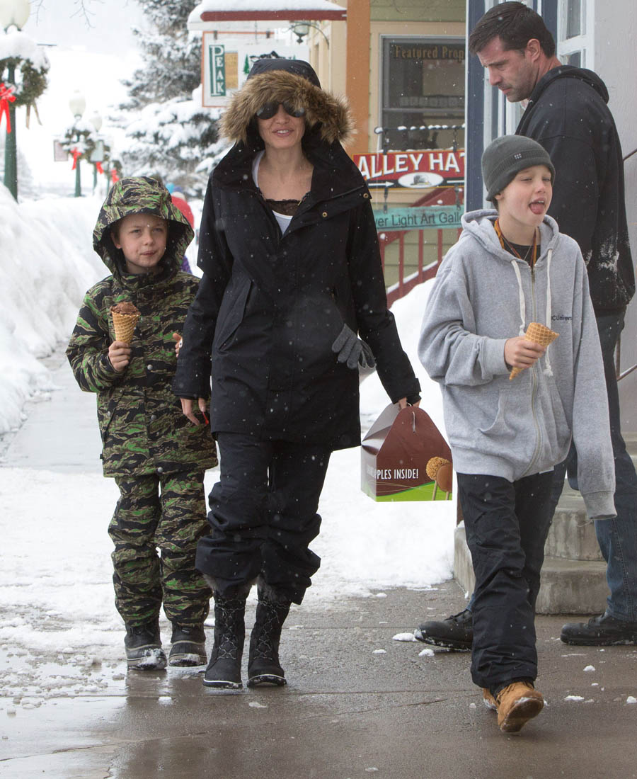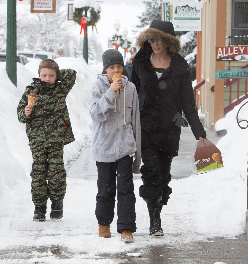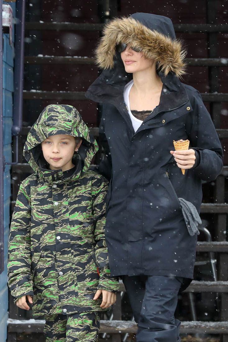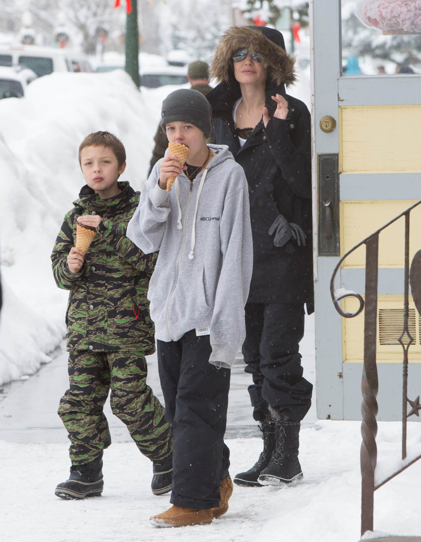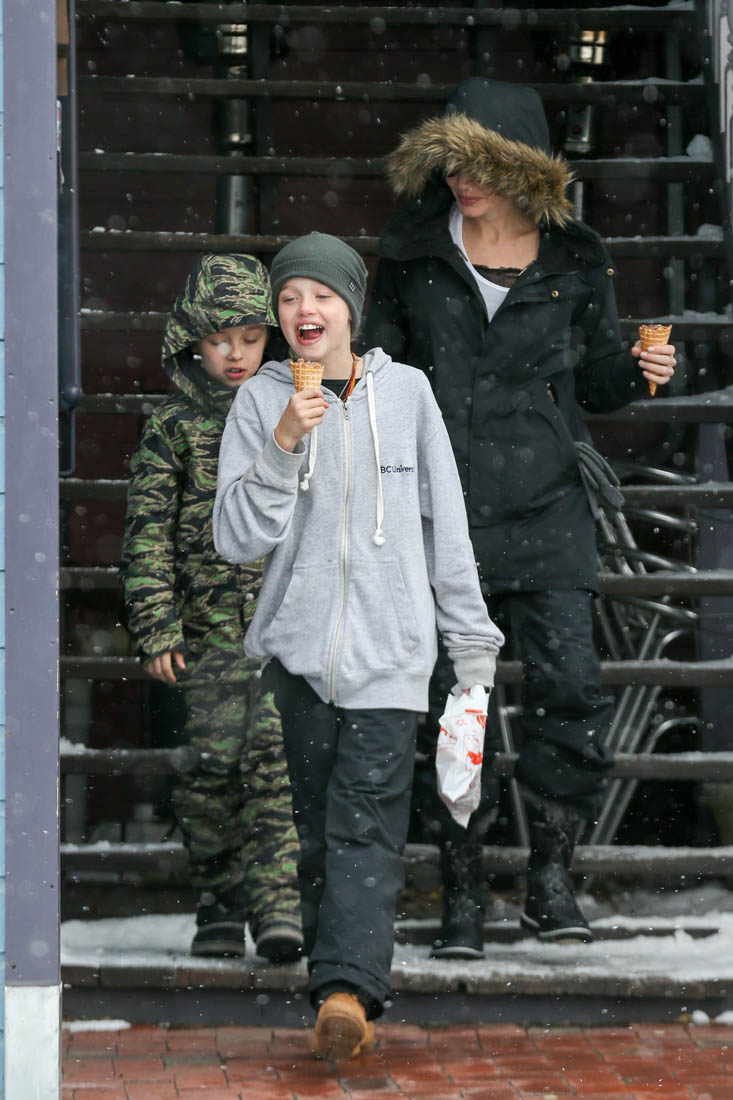 Angelina Jolie and the children were in Crested Butte, Colorado for NYE. Here she is with Shiloh and Knox out for ice cream. The Daily Mail has other photos of her with Vivienne and in some of the shots you can see that Mariane Pearl is with them. Mariane Pearl is a journalist and the widow of the late Daniel Pearl. Angelina Jolie played her in A Mighty Heart. Mariane wrote about their friendship for Glamour Magazine in 2014. So they’re on holiday together. And obviously they are still close.