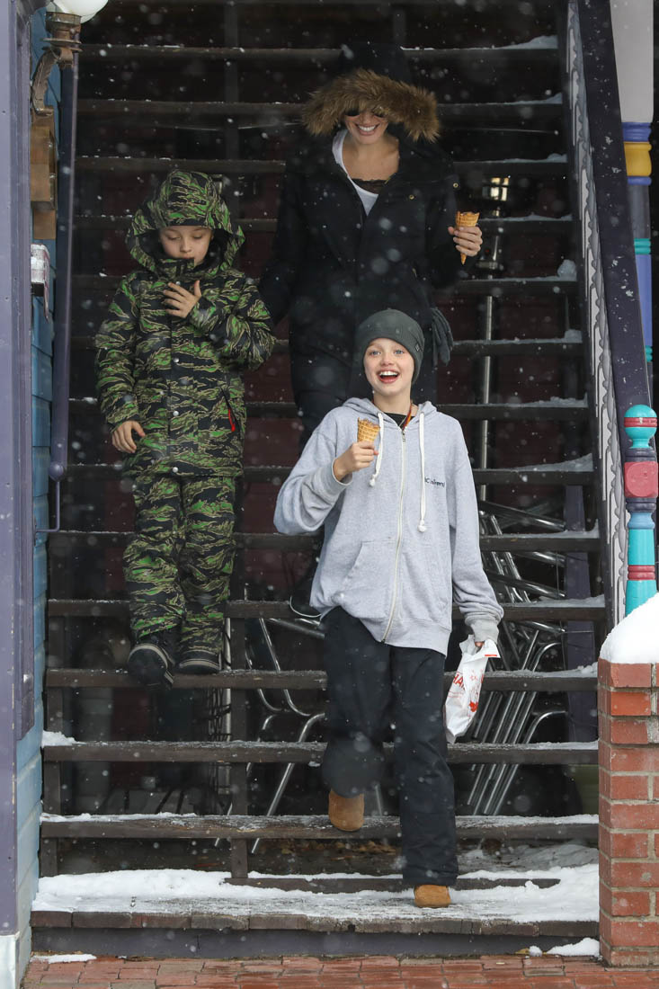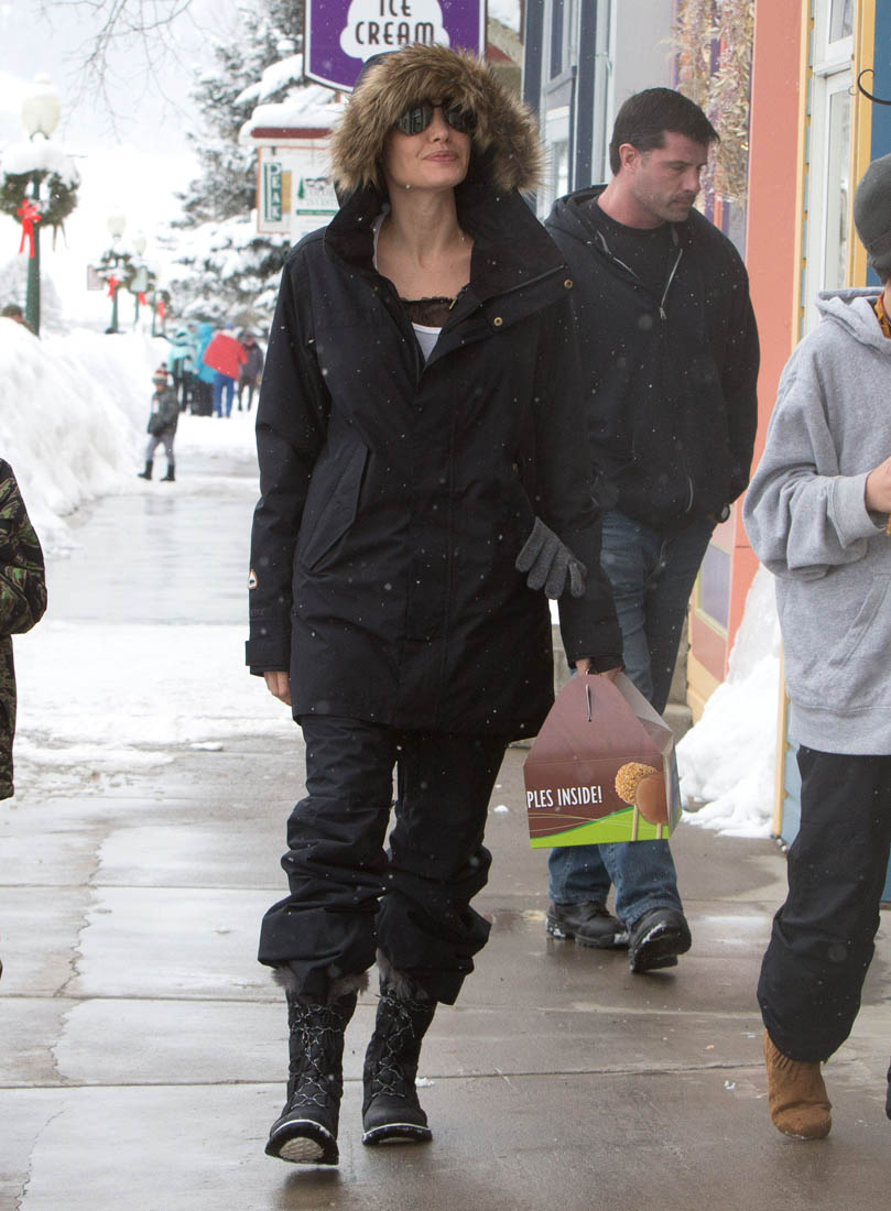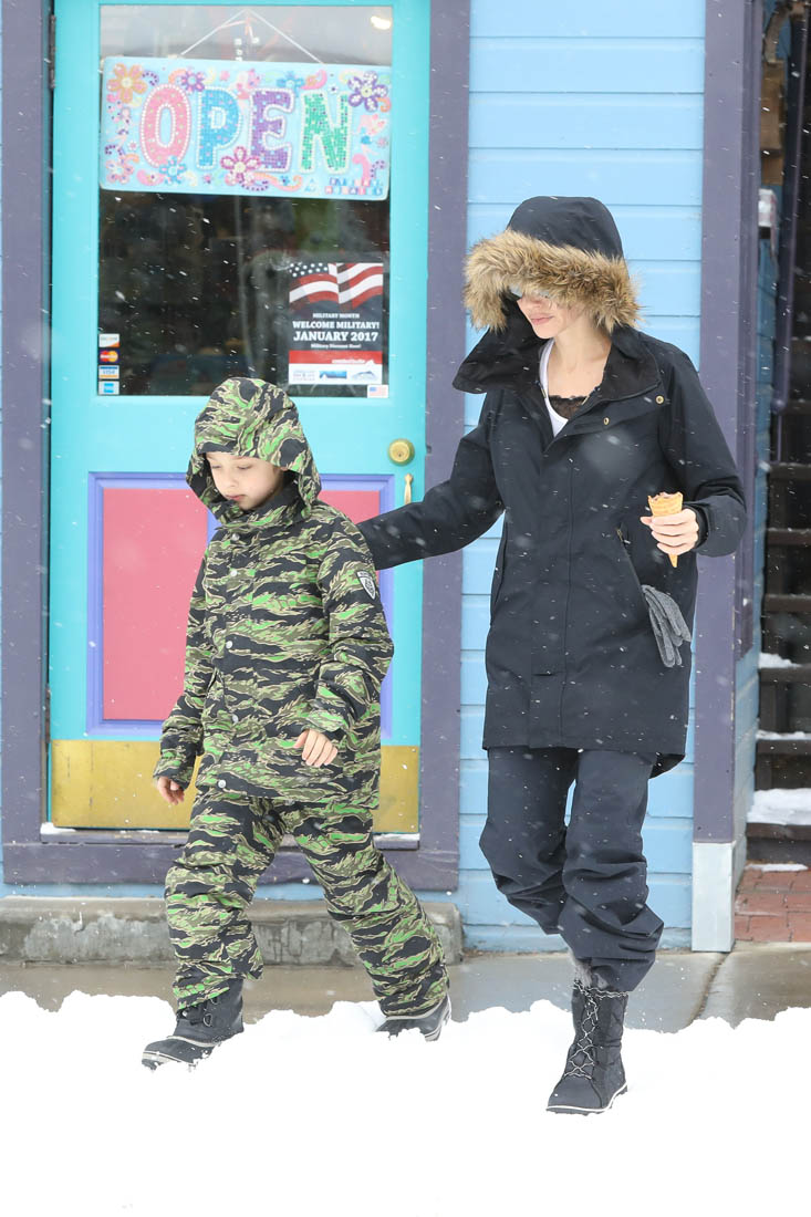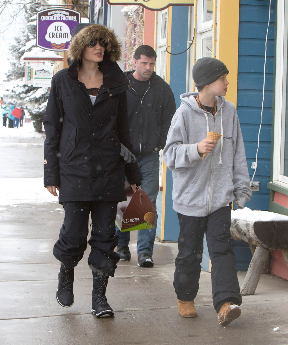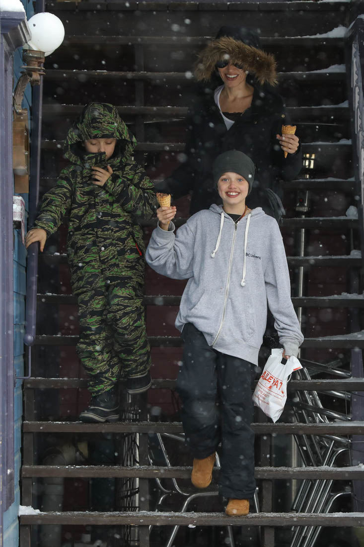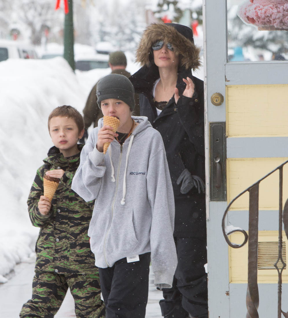 Angelina Jolie and the children were in Crested Butte, Colorado for NYE. Here she is with Shiloh and Knox out for ice cream. The Daily Mail has other photos of her with Vivienne and in some of the shots you can see that Mariane Pearl is with them. Mariane Pearl is a journalist and the widow of the late Daniel Pearl. Angelina Jolie played her in A Mighty Heart. Mariane wrote about their friendship for Glamour Magazine in 2014. So they’re on holiday together. And obviously they are still close.