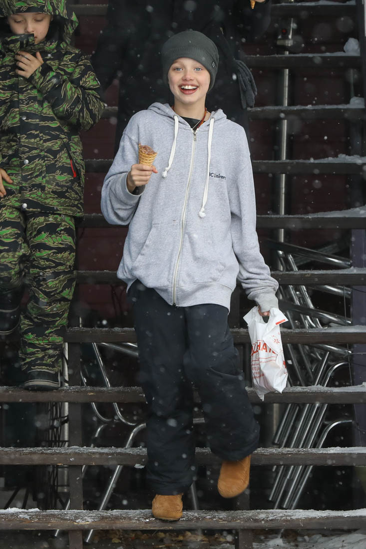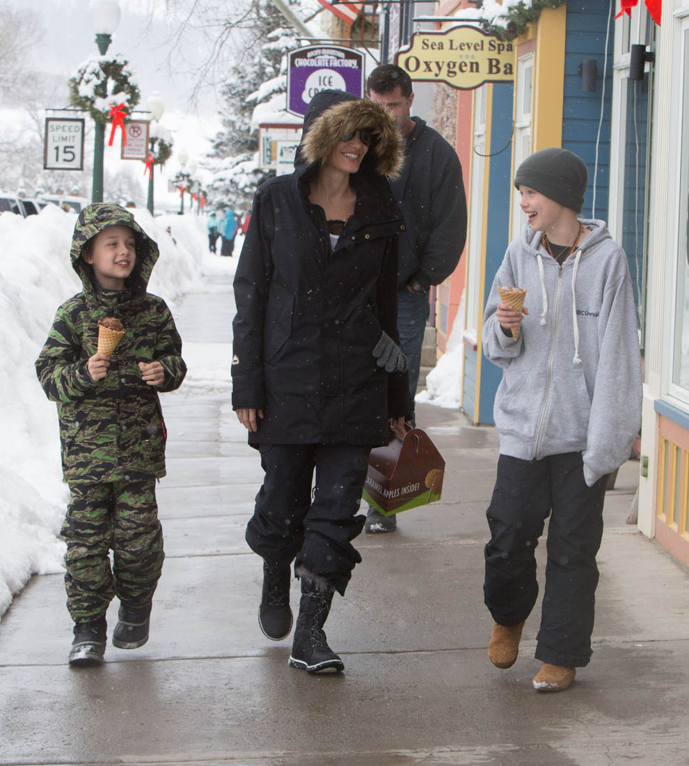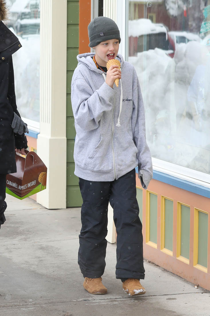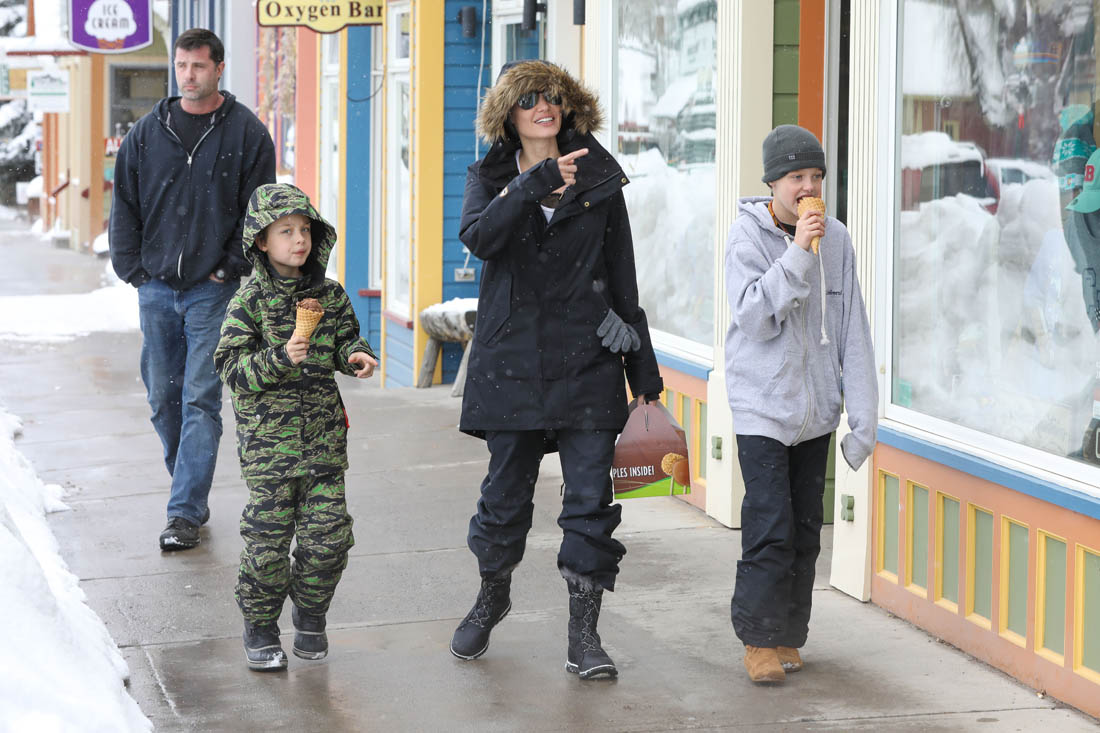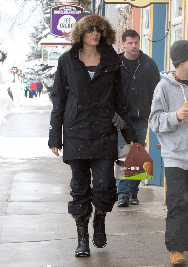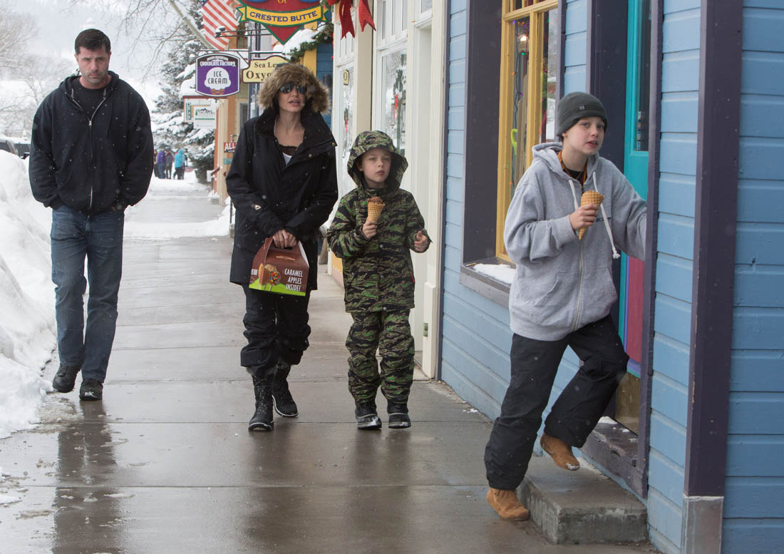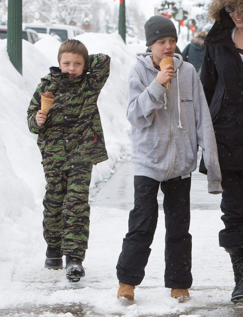 Angelina Jolie and the children were in Crested Butte, Colorado for NYE. Here she is with Shiloh and Knox out for ice cream. The Daily Mail has other photos of her with Vivienne and in some of the shots you can see that Mariane Pearl is with them. Mariane Pearl is a journalist and the widow of the late Daniel Pearl. Angelina Jolie played her in A Mighty Heart. Mariane wrote about their friendship for Glamour Magazine in 2014. So they’re on holiday together. And obviously they are still close.