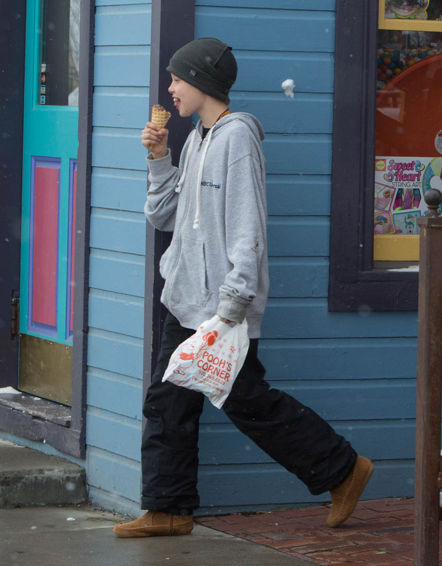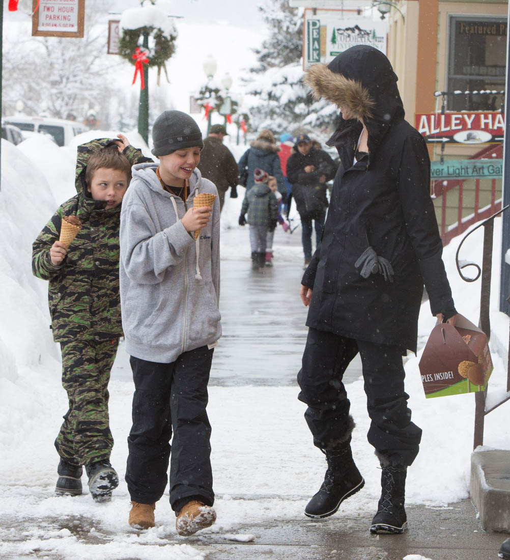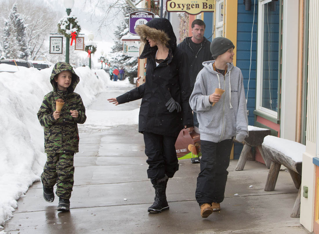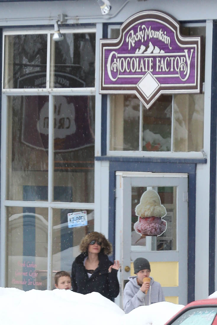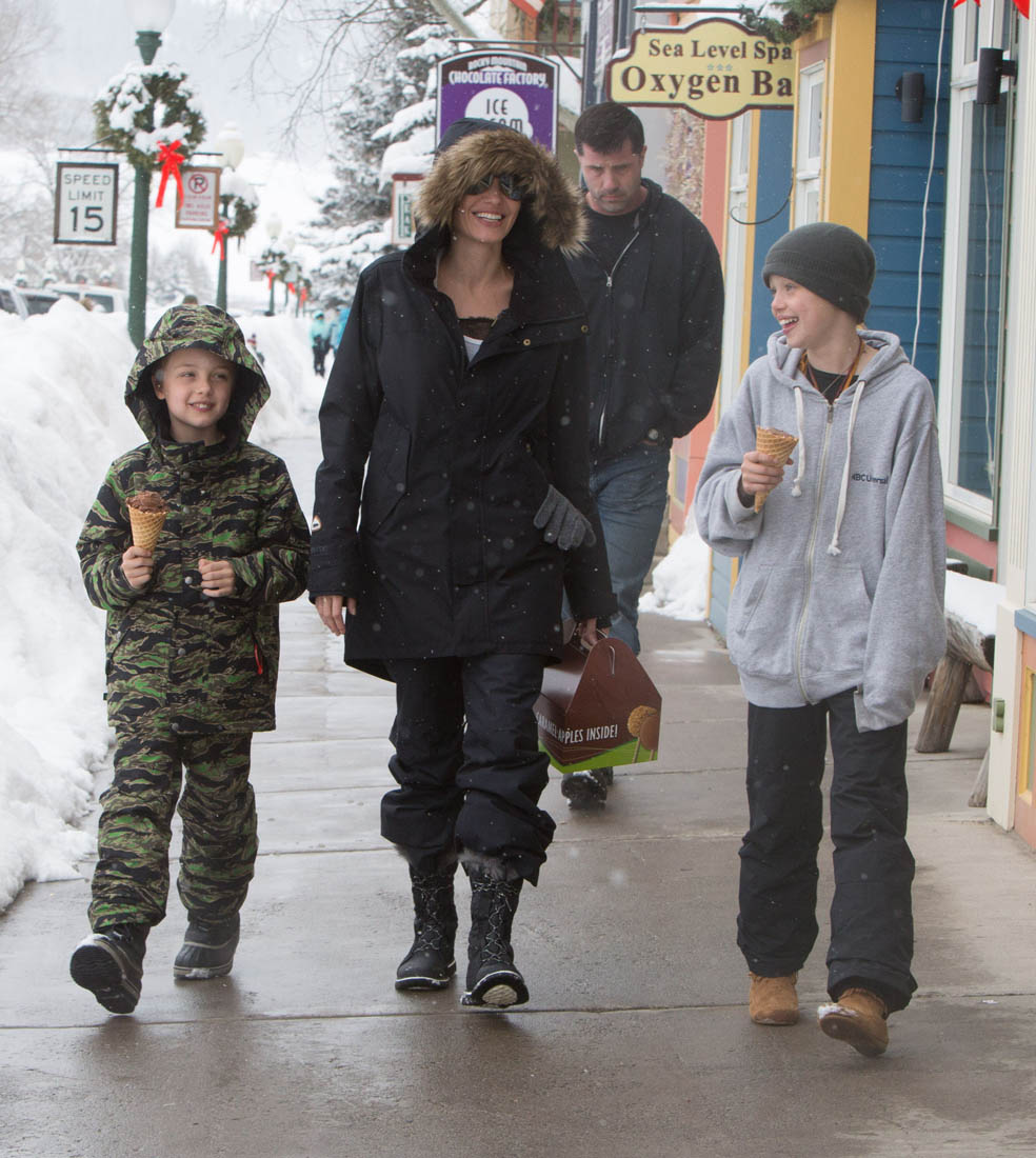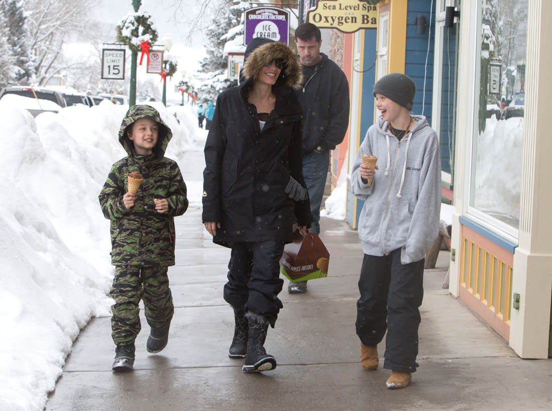 Angelina Jolie and the children were in Crested Butte, Colorado for NYE. Here she is with Shiloh and Knox out for ice cream. The Daily Mail has other photos of her with Vivienne and in some of the shots you can see that Mariane Pearl is with them. Mariane Pearl is a journalist and the widow of the late Daniel Pearl. Angelina Jolie played her in A Mighty Heart. Mariane wrote about their friendship for Glamour Magazine in 2014. So they’re on holiday together. And obviously they are still close.