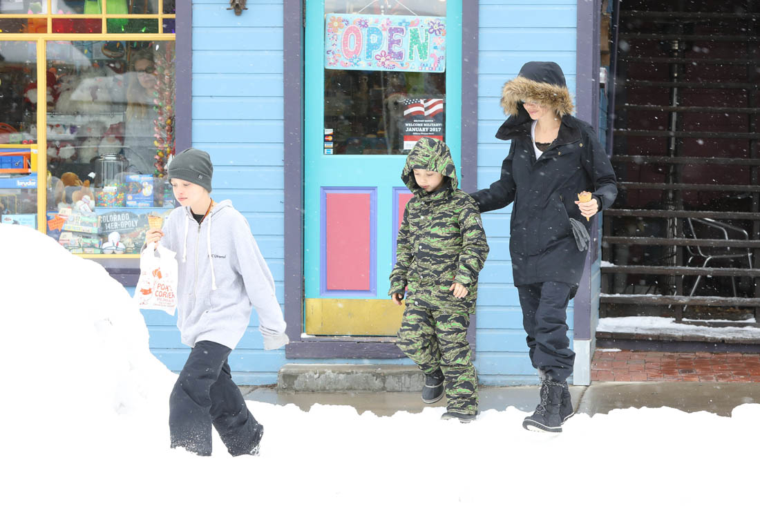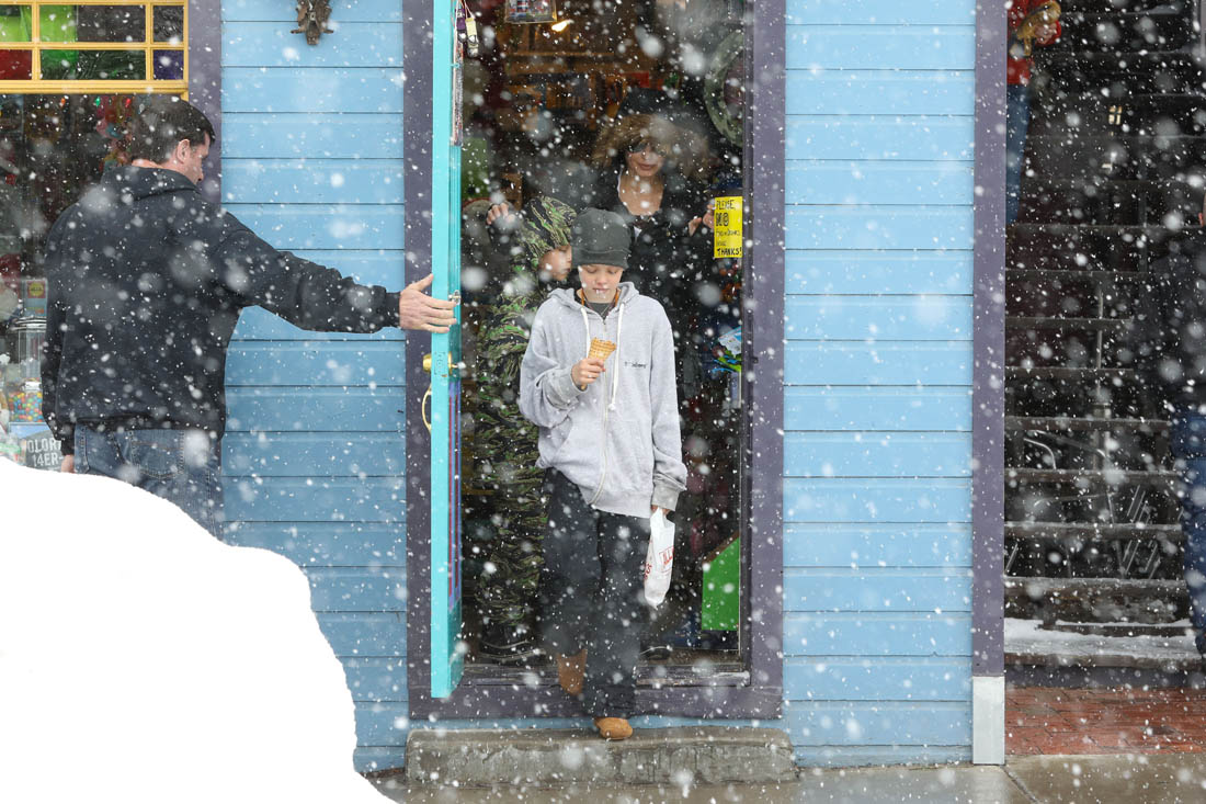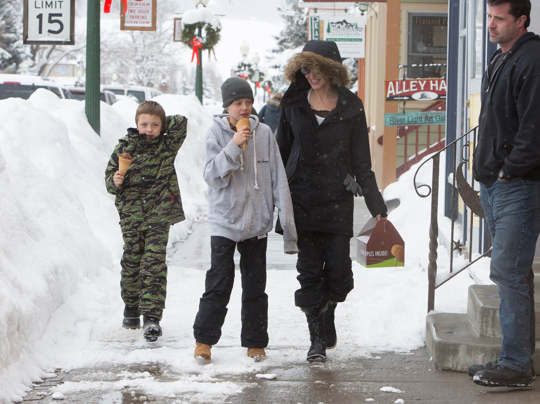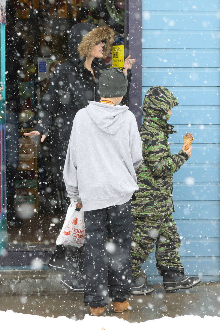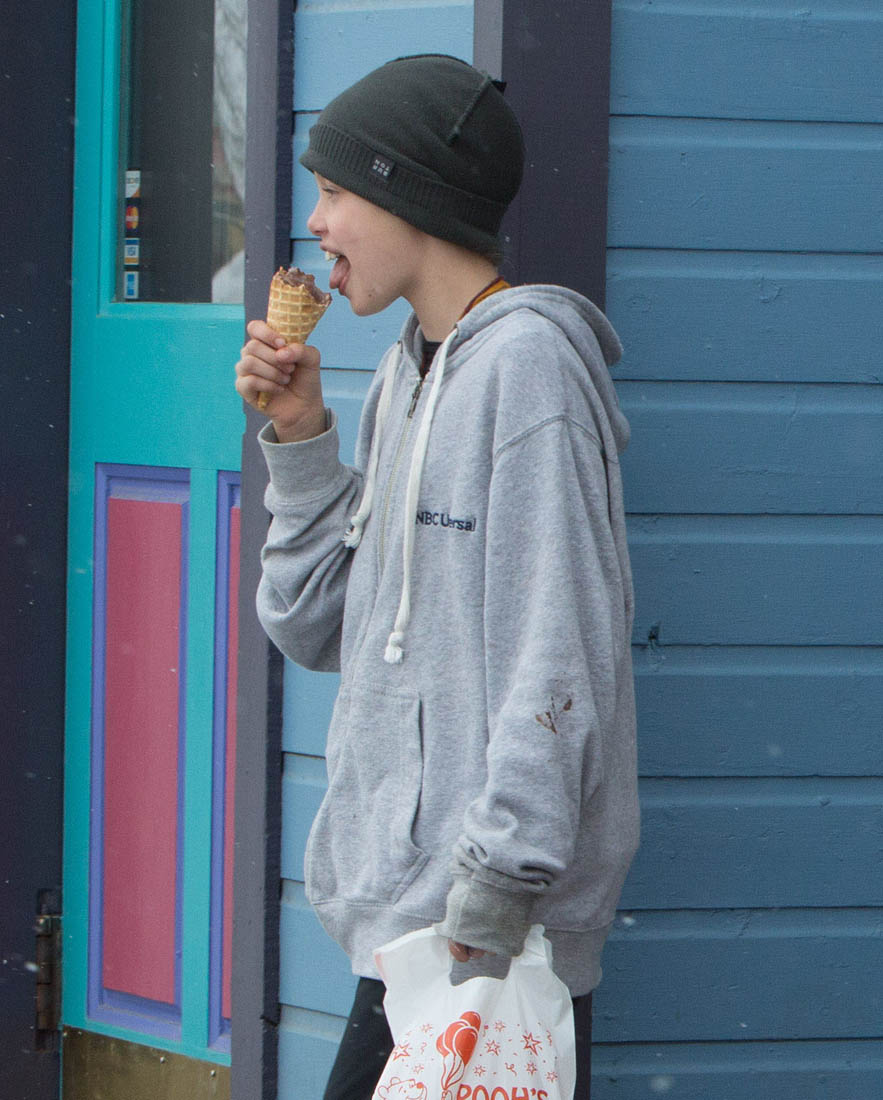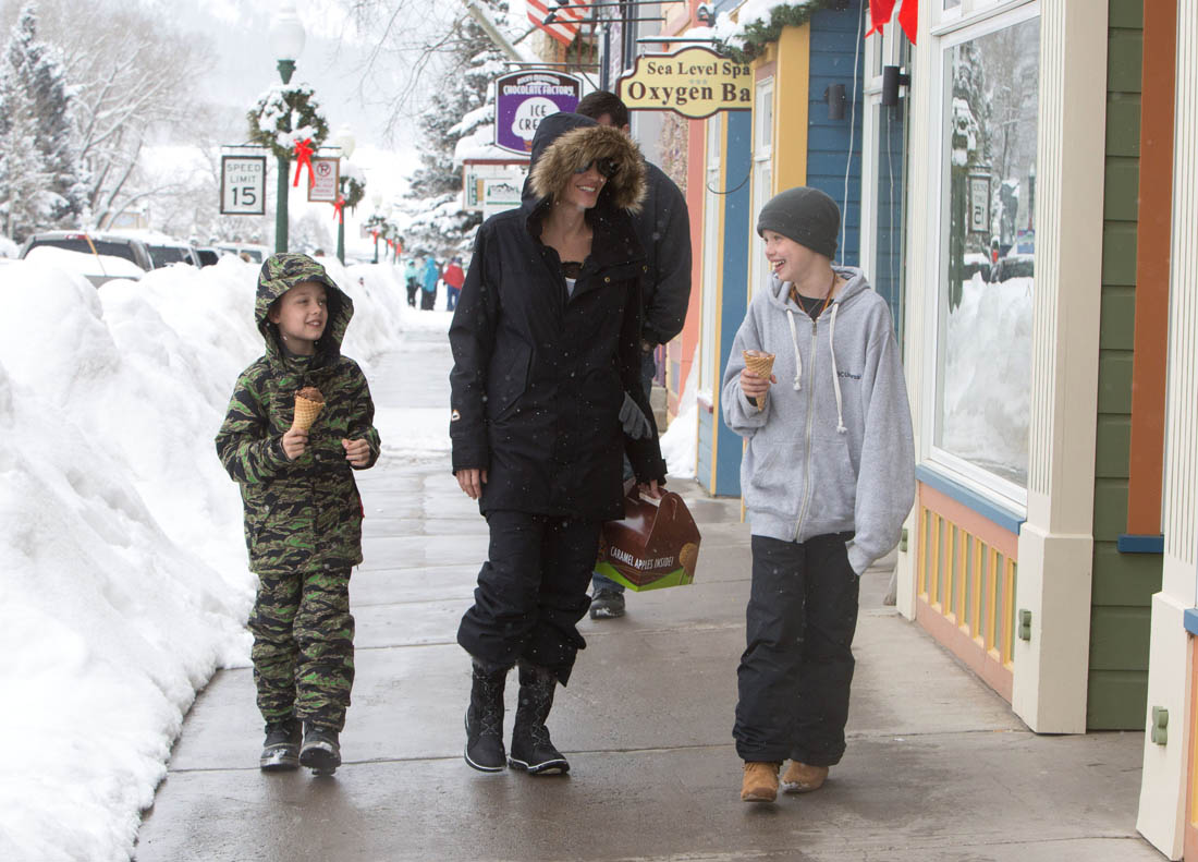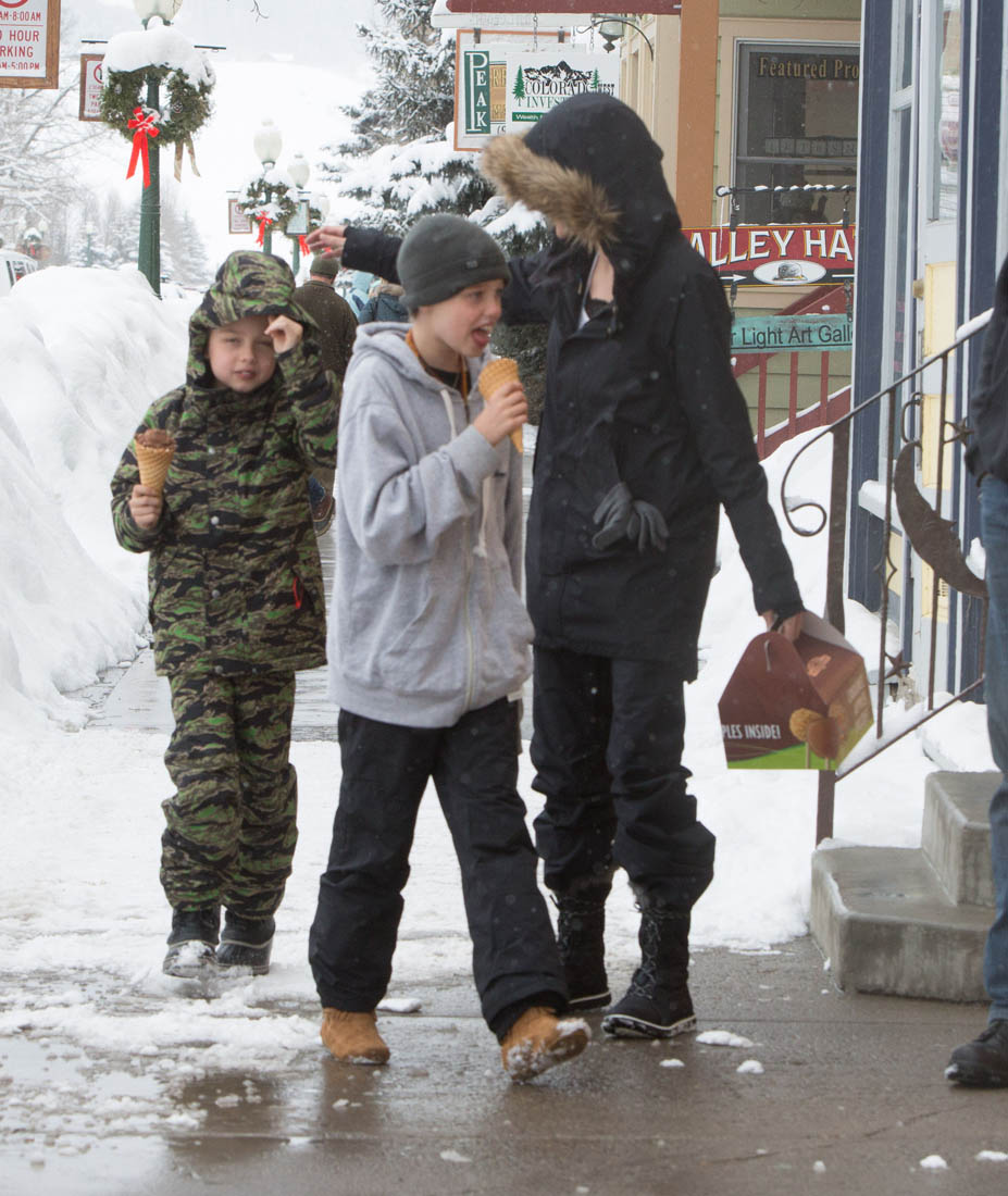 Angelina Jolie and the children were in Crested Butte, Colorado for NYE. Here she is with Shiloh and Knox out for ice cream. The Daily Mail has other photos of her with Vivienne and in some of the shots you can see that Mariane Pearl is with them. Mariane Pearl is a journalist and the widow of the late Daniel Pearl. Angelina Jolie played her in A Mighty Heart. Mariane wrote about their friendship for Glamour Magazine in 2014. So they’re on holiday together. And obviously they are still close.