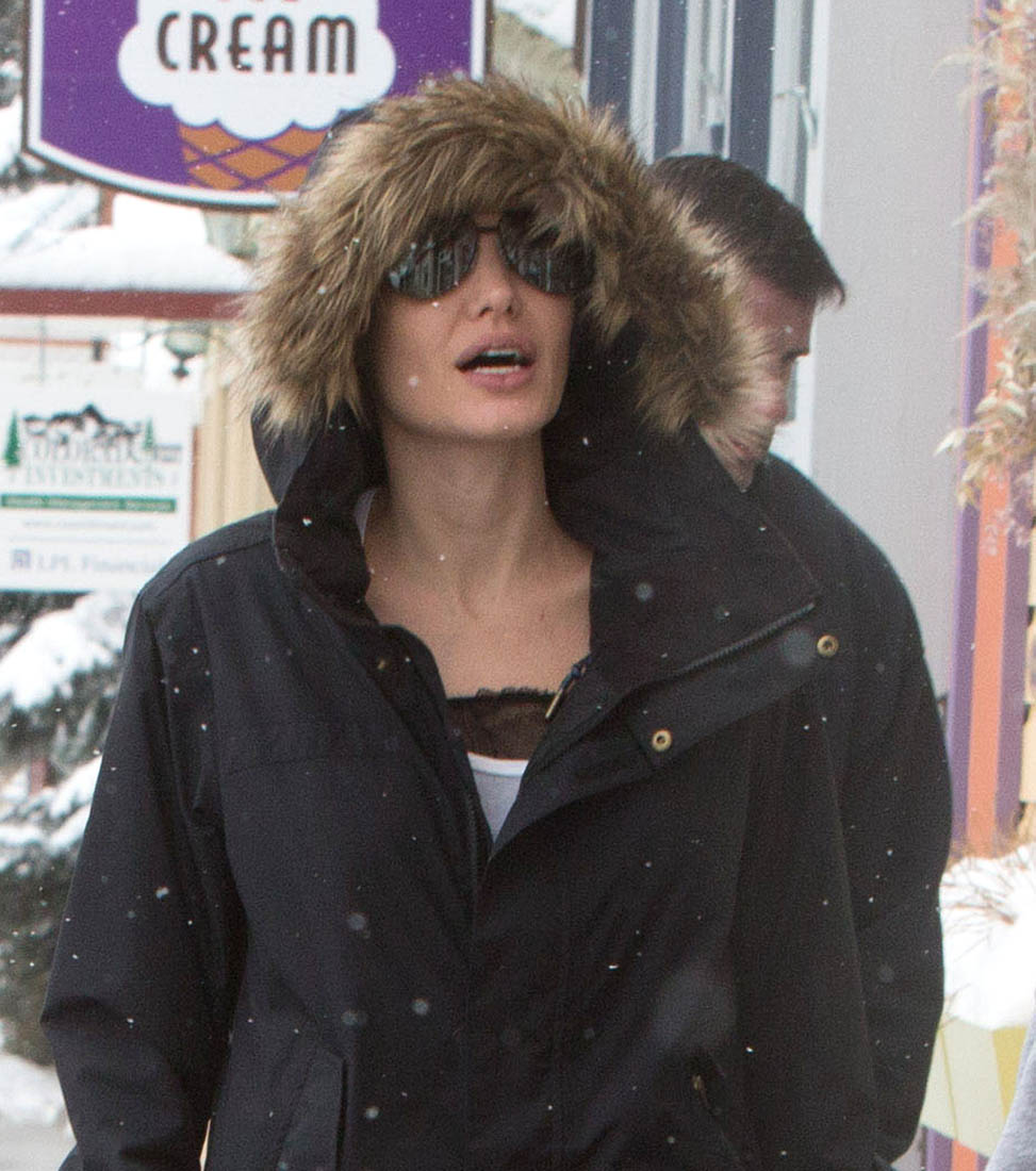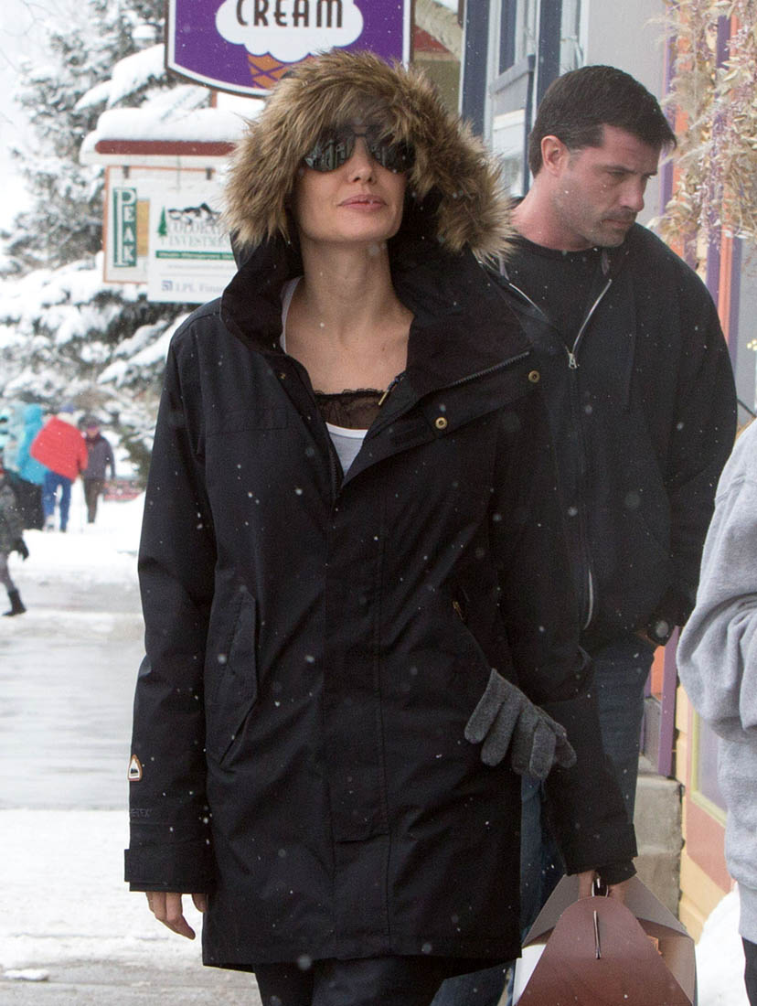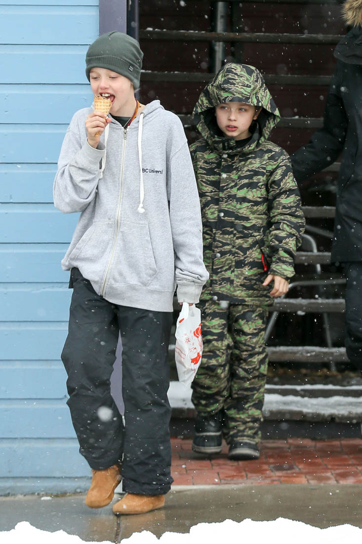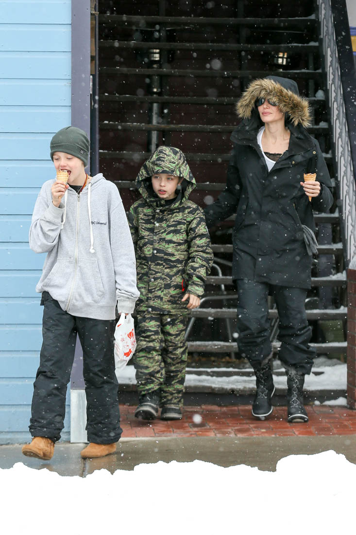 These are the first good quality paparazzi images of Angelina since she and Brad Pitt broke up. And it’s not like the paps hang out regularly in Crested Butte, Colorado. At least 3 different agencies were able to get photos of Angelina with her children though. Which, as we know, with Angelina, there’s more often than not a plan behind the picture. I wonder if it’s kind of a f-ck you. Because for weeks now Brad Pitt’s sources have been leaking to the entertainment outlets about how sadface he is because that bitch he married won’t let him see the kids – and that’s not even subtext, it’s about as obvi-text as possible. What he’s doing is crying at the ocean, the way Jennifer Aniston used to get papped looking out onto the ocean after their divorce, searching for answers in the waves, going to the “water’s edge and scream(ing)”. God that Vanity Fair article gave us some great quotes, didn’t it? “Billy Idol called – he wants his look back” is another one. And now here we are, Brad in the pity party Jennifer Aniston role, making sure that we know, that the world knows, that he is lonely and miserable. Meanwhile his estranged wife looks super cute in ski gear, catching snowflakes on her eyelashes, surrounded by their happy, smiling kids. Strategically sound, or will it be a mistake?