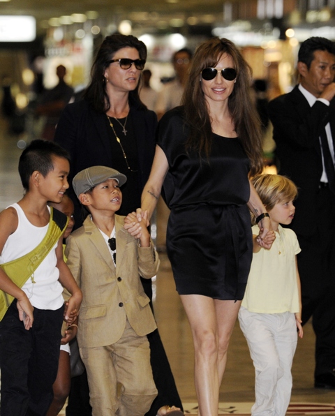 After getting mobbed in Russia, Angelina took off for Japan, arriving in Tokyo today with four of the six Pitt kids, putting on a display of family happiness that you will undoubtedly see on every blog and website through the morning, especially since The Chosen One Shiloh came along in her signature "Montenegro" steeze. Her cute is matched by her brother Pax. That suit is killing me, as is the photo of the Jolie supposedly (according to the paps) giving Maddox sh-t for messing around with his brother ... Just Like Us! Or, rather, you!