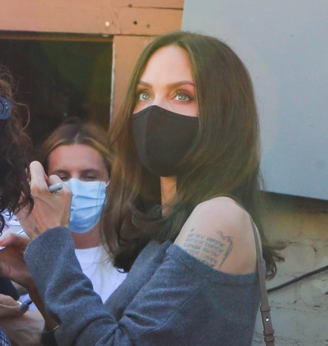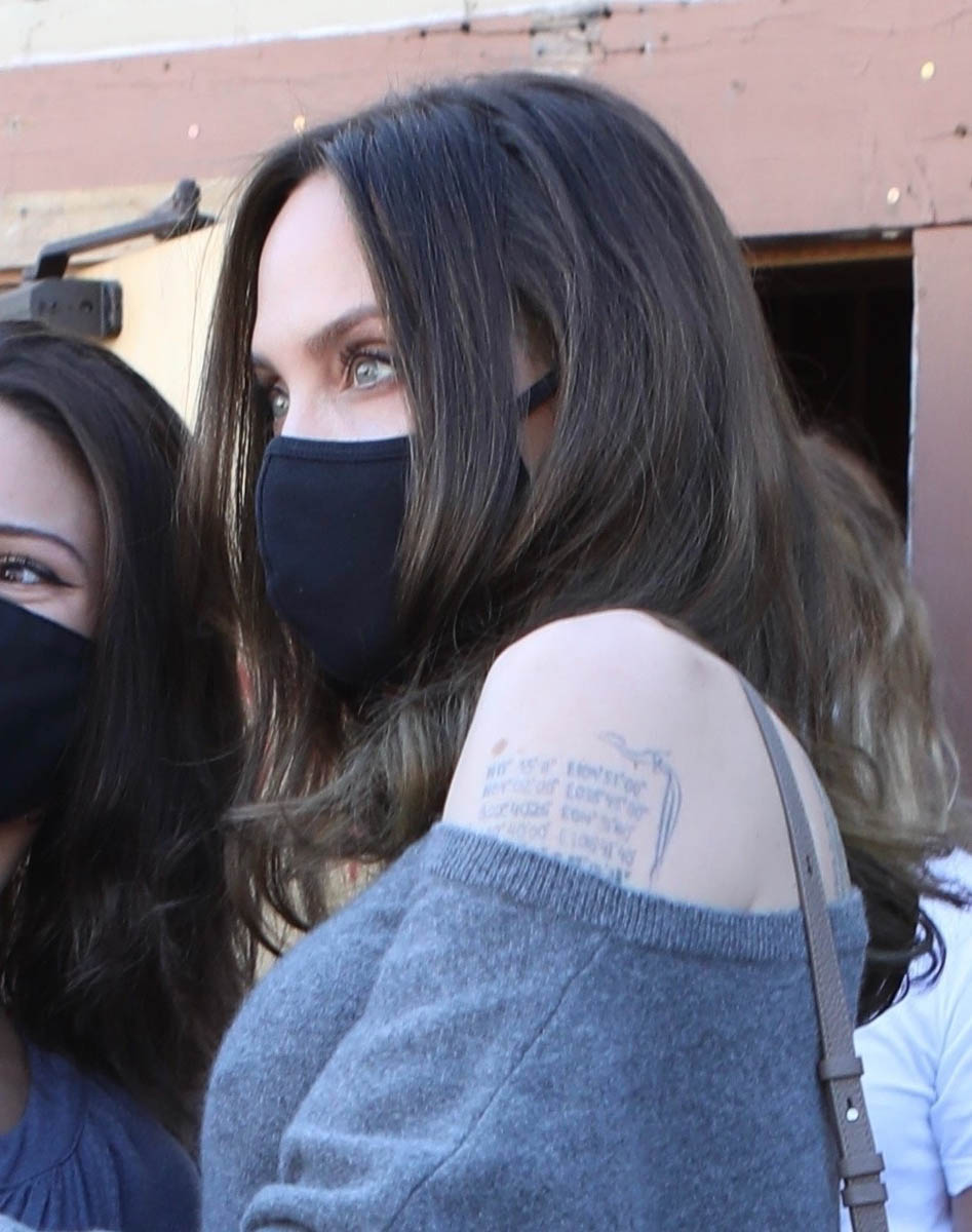 Angelina was out yesterday but for non-romantic reasons. Here she is at a book signing for Know Your Rights and Claim Them. I love this grey sweater on her, this off-the-shoulder slouch is really pretty with her hair and the skirt. And she’s one of those people with one of those faces whose beauty is not obscured by a mask. Right?
