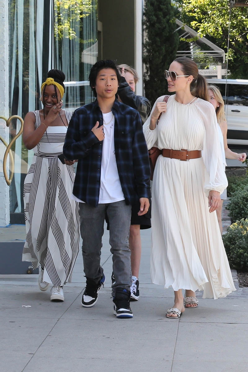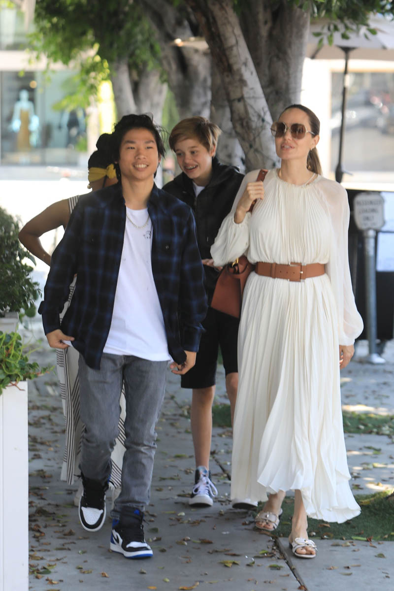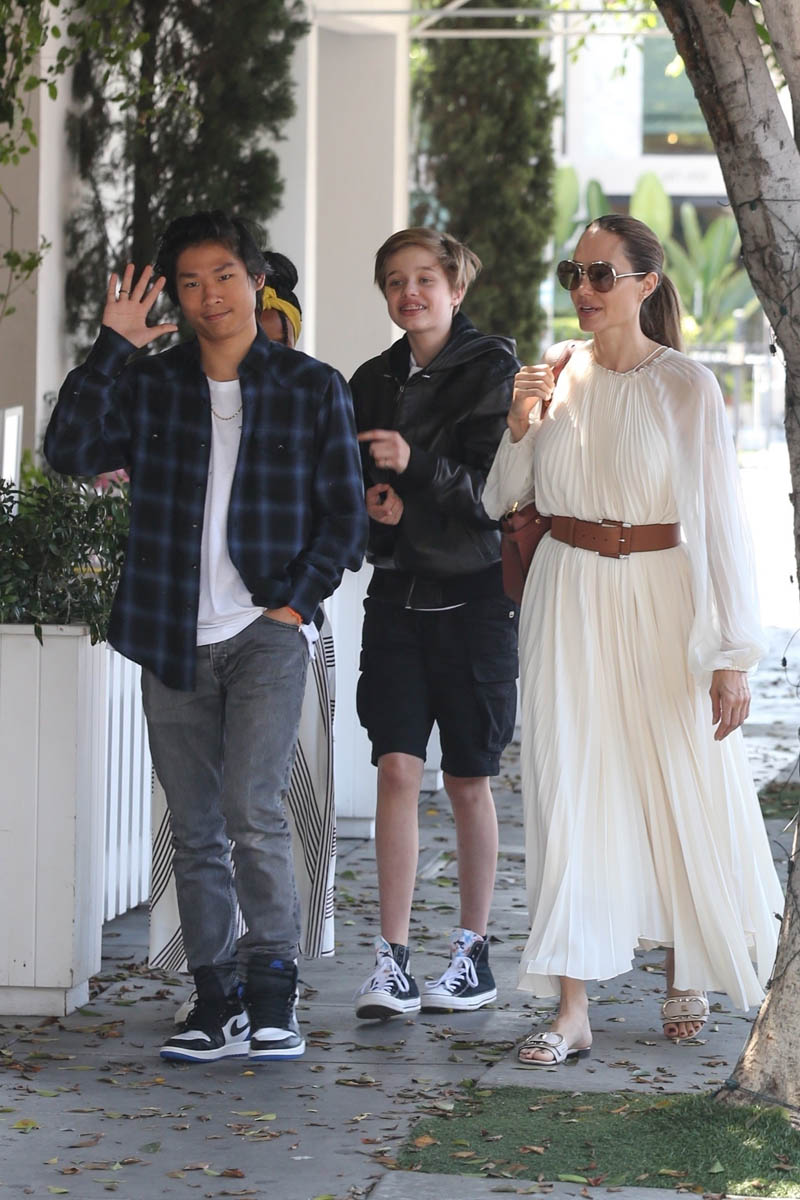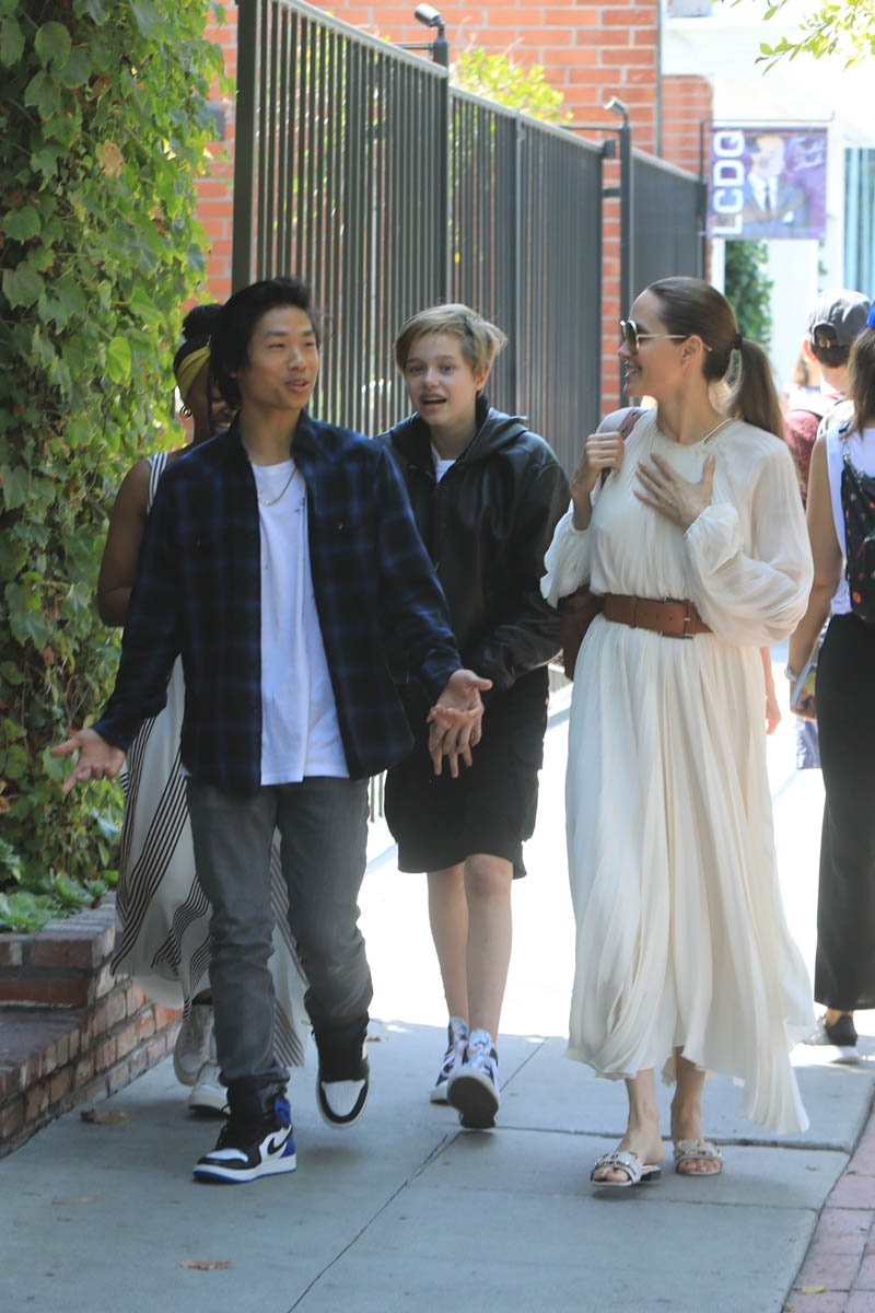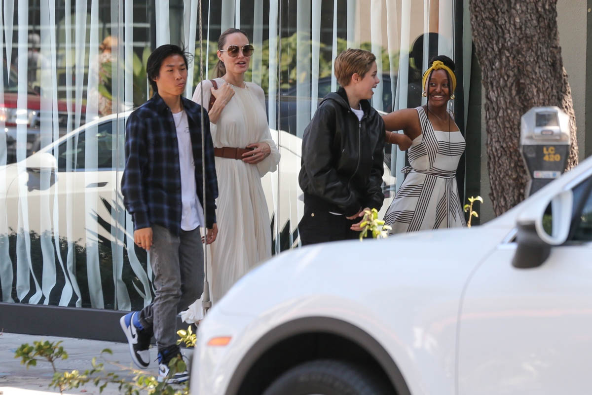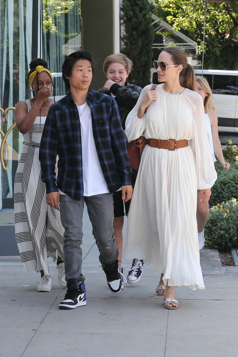 Here she is, Labour Day weekend, hanging out with Pax, Zahara, and Shiloh in LA. They look like they’re having a great time, joking around with each other, laughing with and at each other after lunch. Apparently Angelina, Z, and Shiloh also went to a day party afterwards.