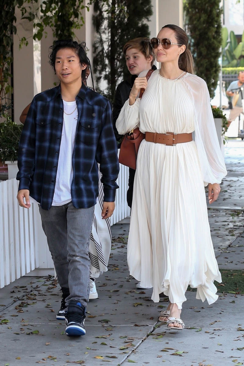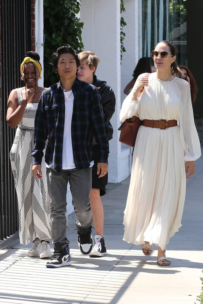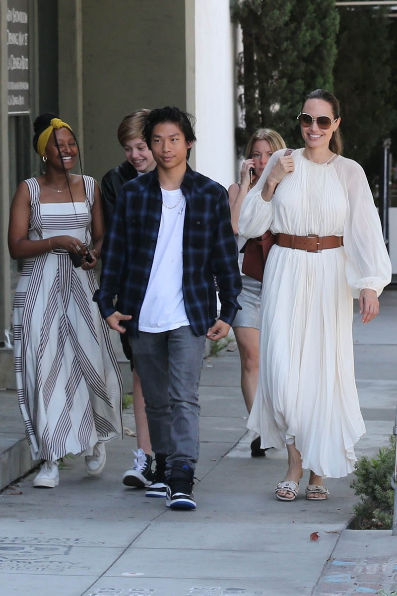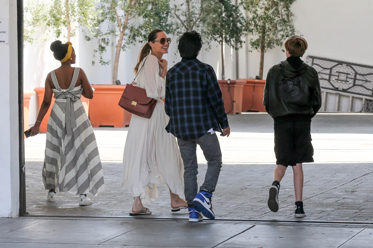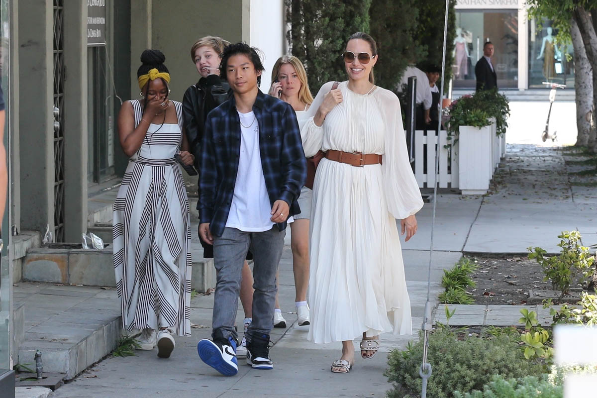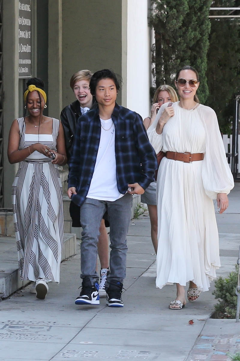 Here she is, Labour Day weekend, hanging out with Pax, Zahara, and Shiloh in LA. They look like they’re having a great time, joking around with each other, laughing with and at each other after lunch. Apparently Angelina, Z, and Shiloh also went to a day party afterwards.