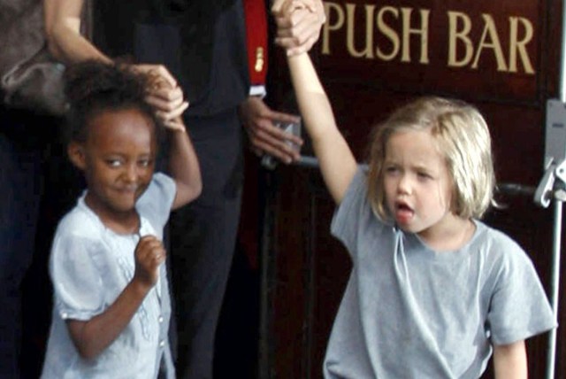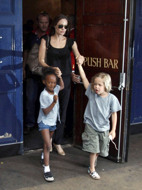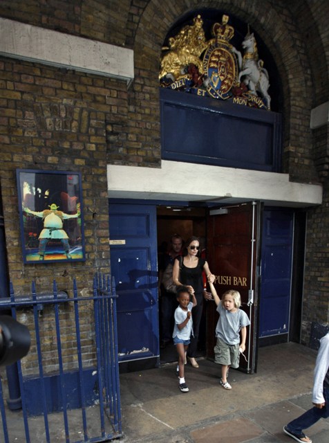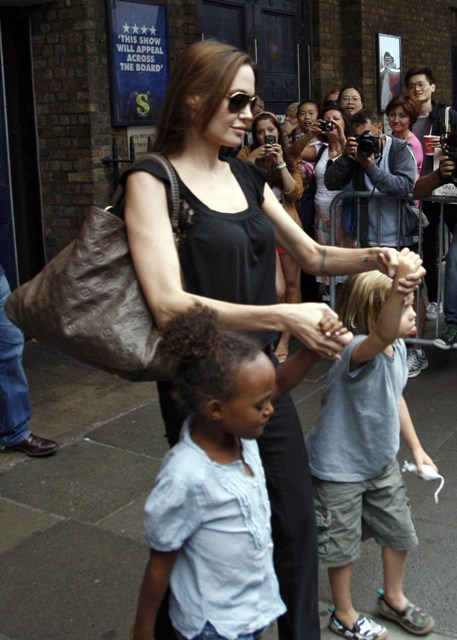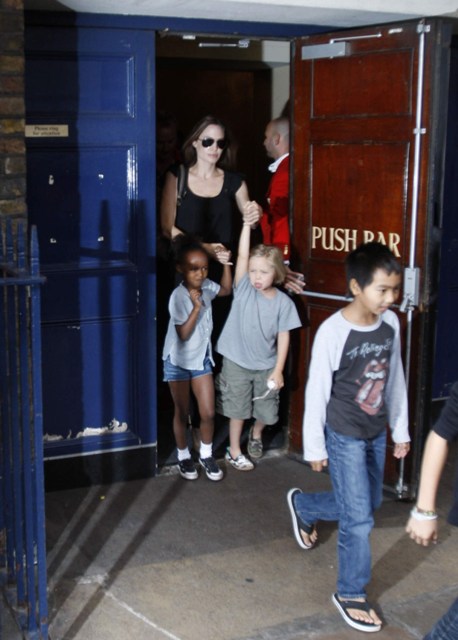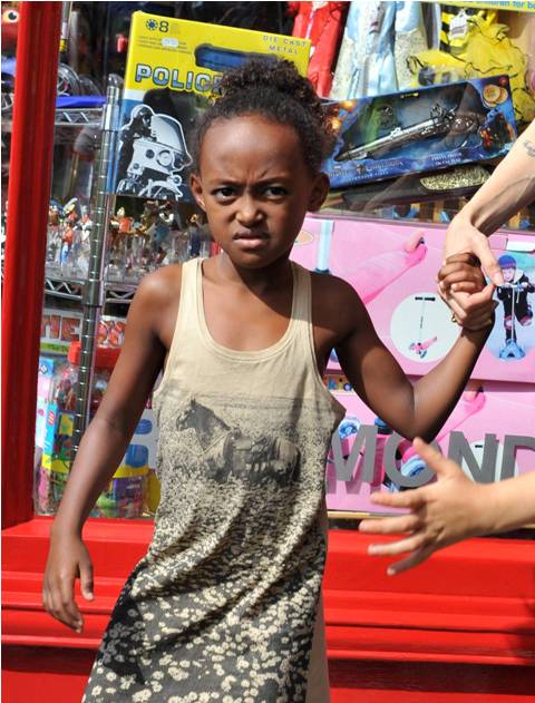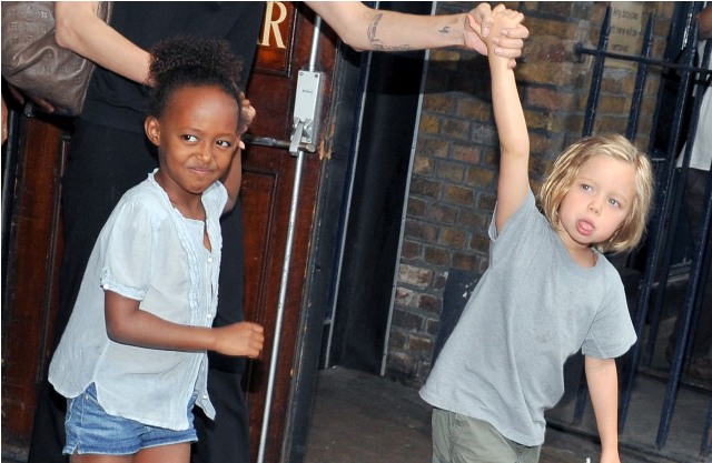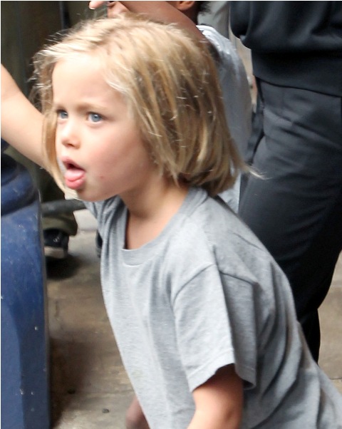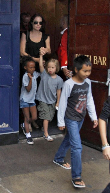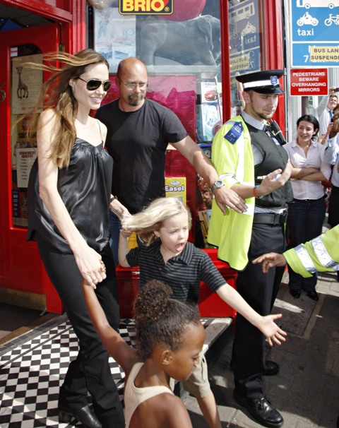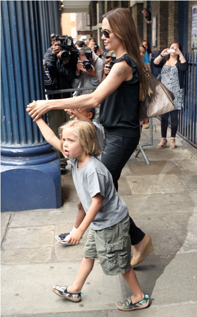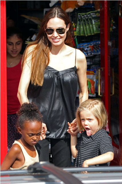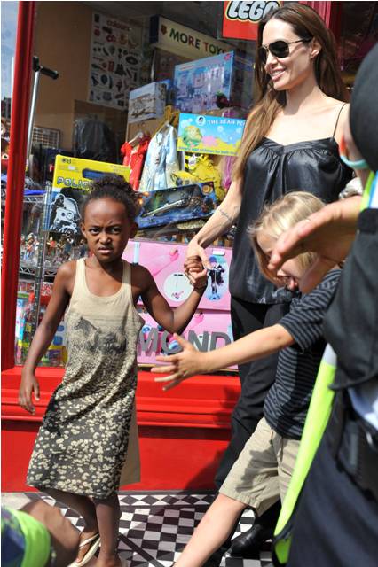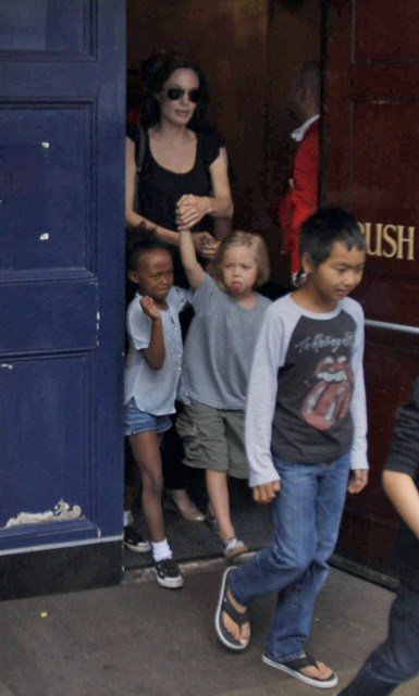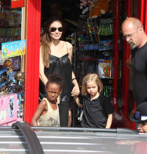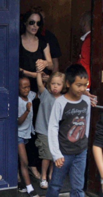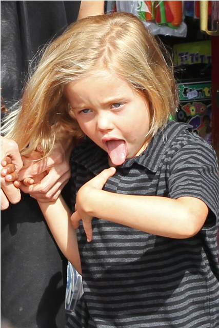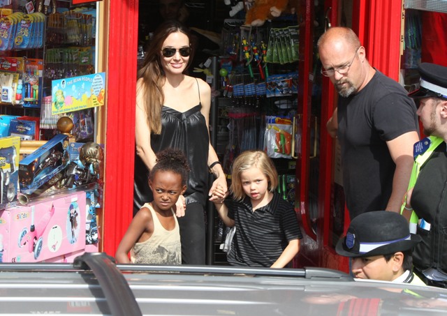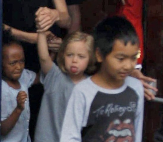 The Brange had their kids out all weekend in England. Something about a puppet show, then there was a bike ride, they hit up a performance of Shrek, and today the Jolie and her girls Miss Zahara and Shiloh dropped in on a toy store. As you can see, The Chosen One is going through a tongue phase. Sticking it out at people. The photographers? Her mother meanwhile just needs to hustle them into the car. Get in the car. Let me clench smile my way to the car. I’ve heard from many moms out there who know the expression. When you’re managing multiple children and just need to make it behind closed doors, hoping that nothing more than a scowl or a sticking out of a tongue goes down in public.