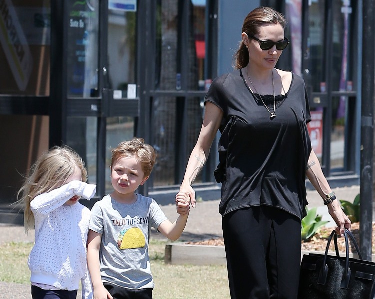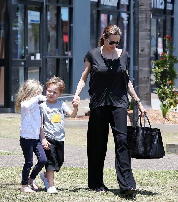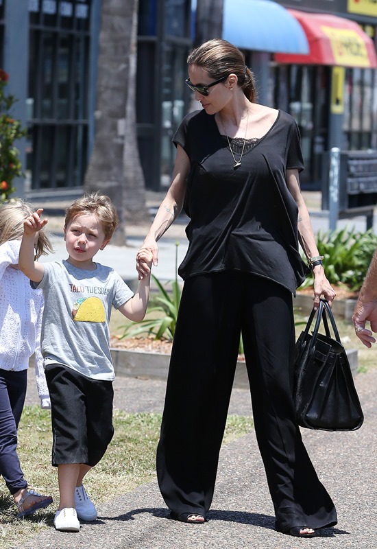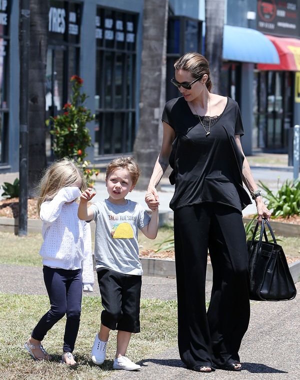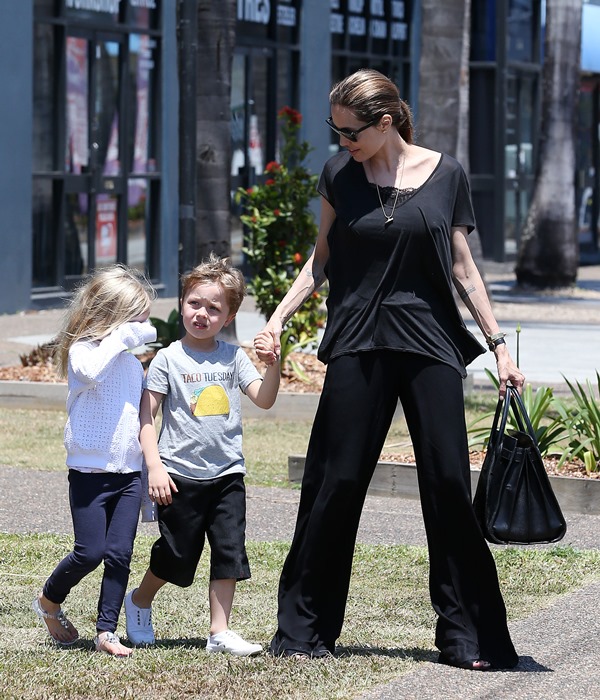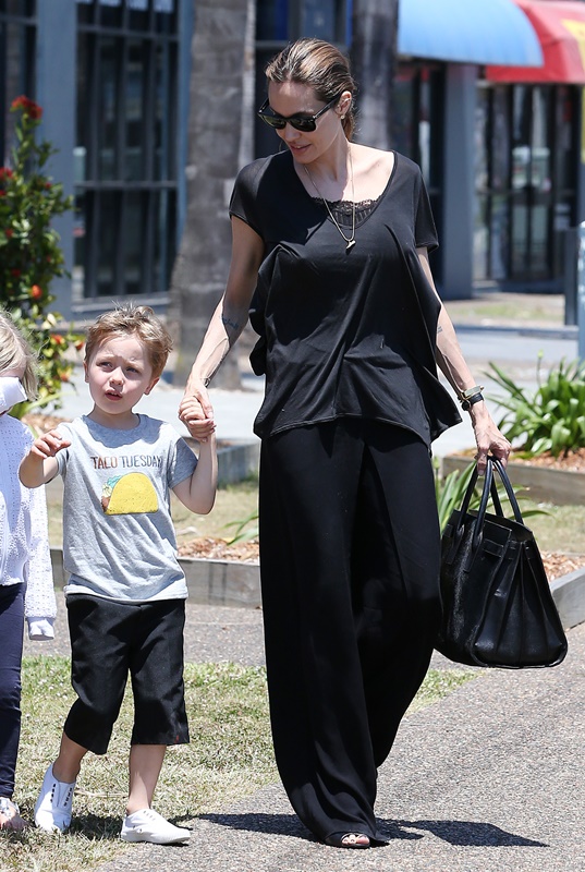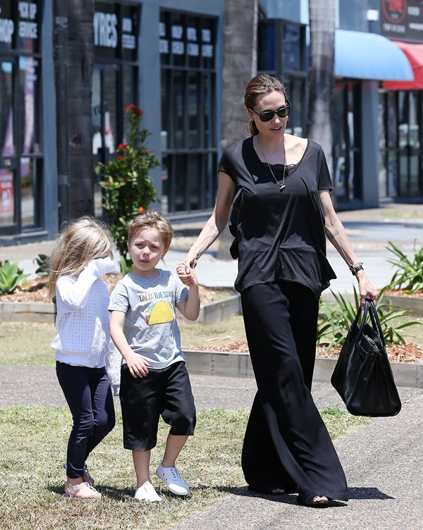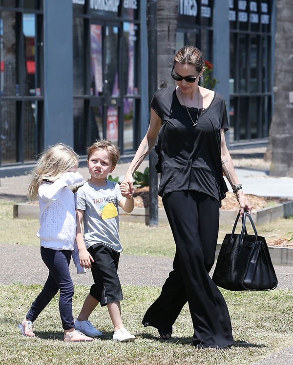Angelina Jolie took her kids out shopping the other day in Queensland, Australia where she’s directing her next film Unbroken. I don’t understand these pants. Like, I’m all for an elastic waistband but these…these are not sweatpants. The material is too nice. These are more like…palazzo pants. Dress pants. Right? I don’t get it. Do you get it?