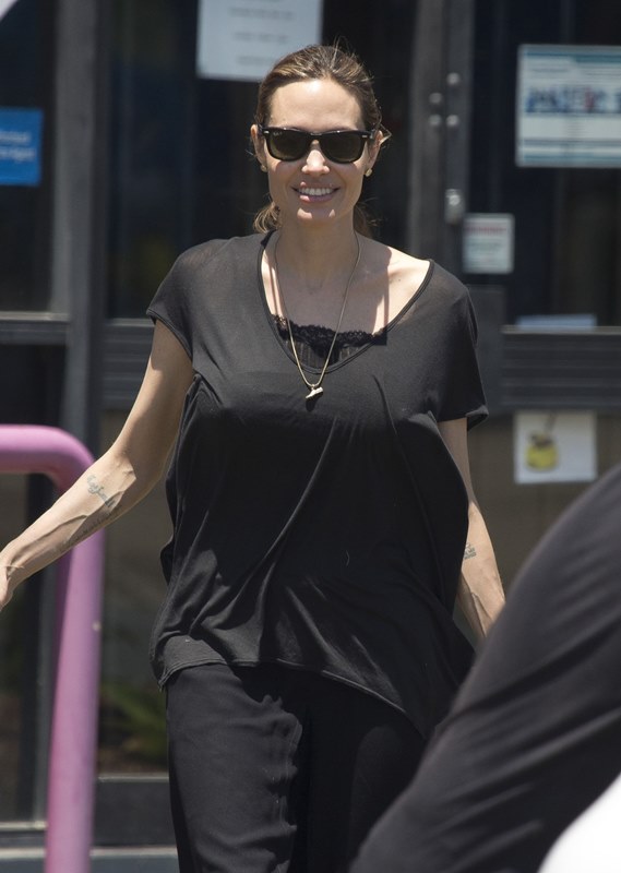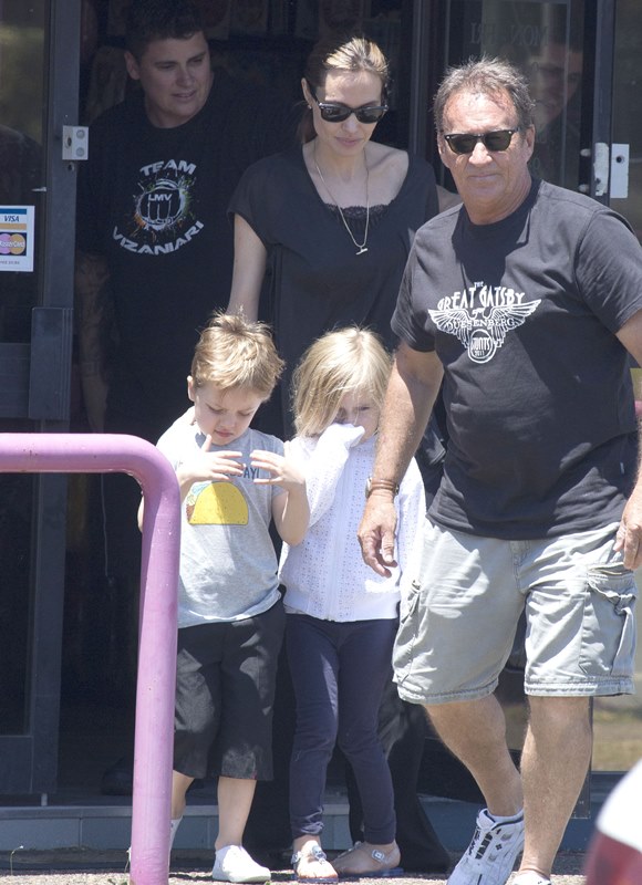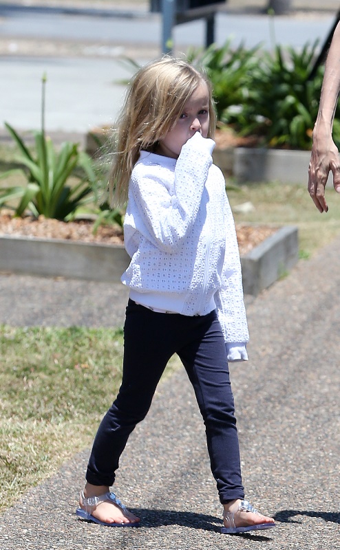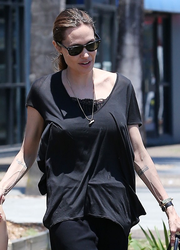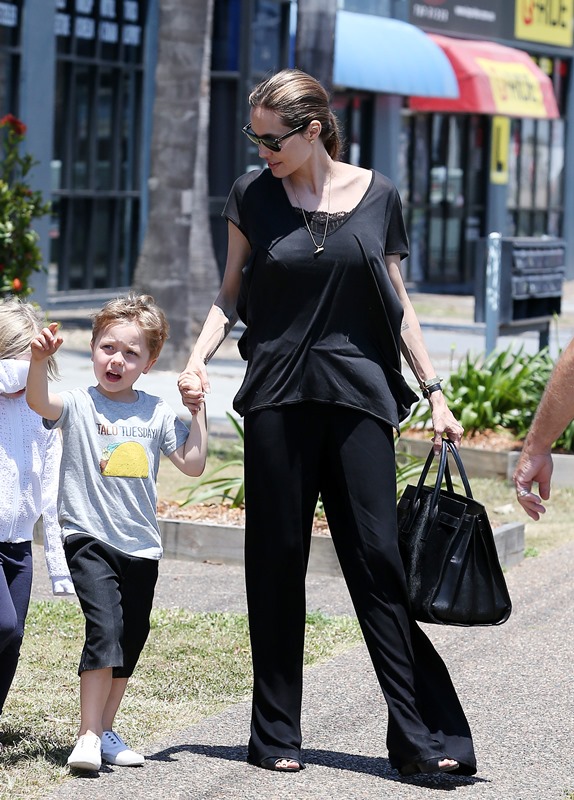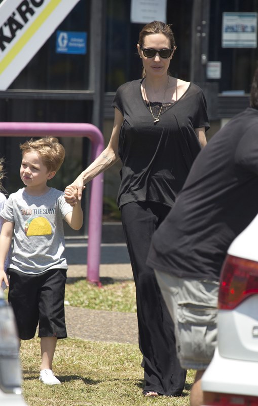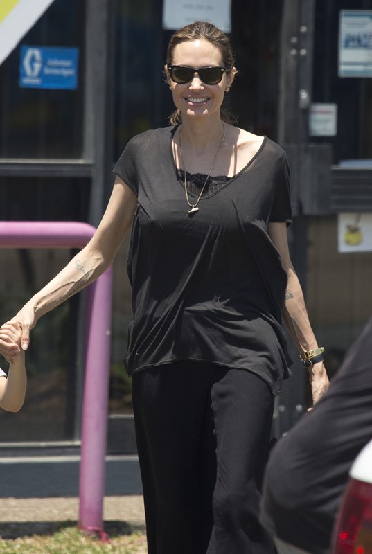 Angelina Jolie took her kids out shopping the other day in Queensland, Australia where she’s directing her next film Unbroken. I don’t understand these pants. Like, I’m all for an elastic waistband but these…these are not sweatpants. The material is too nice. These are more like…palazzo pants. Dress pants. Right? I don’t get it. Do you get it?
