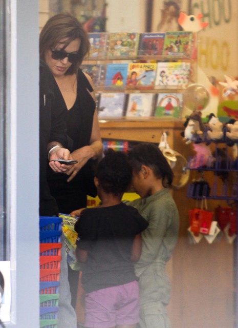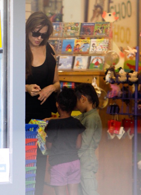Brad Pitt is shooting Moneyball in Oakland. Yesterday Angelina Jolie was sighted near the production with a few of their children shopping for toys. They also popped in for a visit to see dad on the set. Coincidence or conspiracy? Yesterday was also the release date for Andrew Morton’s unauthorised Jolie biography which seems rather tame, full of details of how f-cked up she was pre-Maddox. Unfortunately, Morton was unable to manufacture any stories about hair pulling between Angie and Jen, or any accounts of the Jolie whipping Brad Pitt in their sex room while he begs for more. I’m begging for more too. I mean... that’s all?