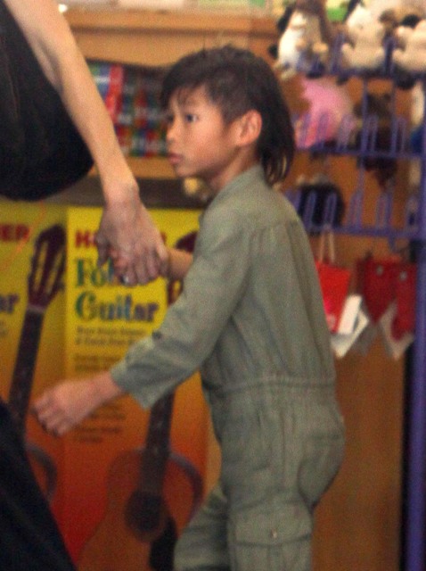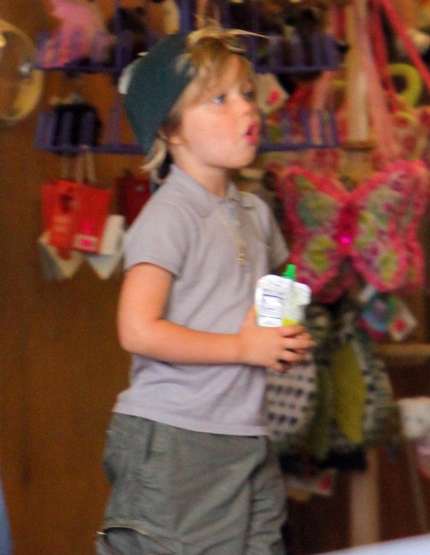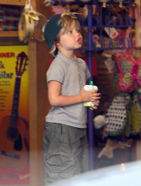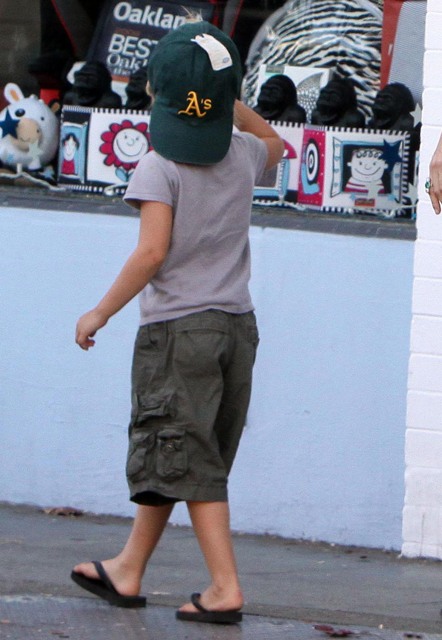 Until then, there’s the Chosen One and her adorable Oakland A’s hat turned backwards, kickin’ it in cargo shorts and flipflops. So f-cking cute. Unfortunately the paps couldn’t get any front shots of Miss Zahara. I want to see her negotiating with her mother about her toy selections. Pax seems to be working on that skill too.