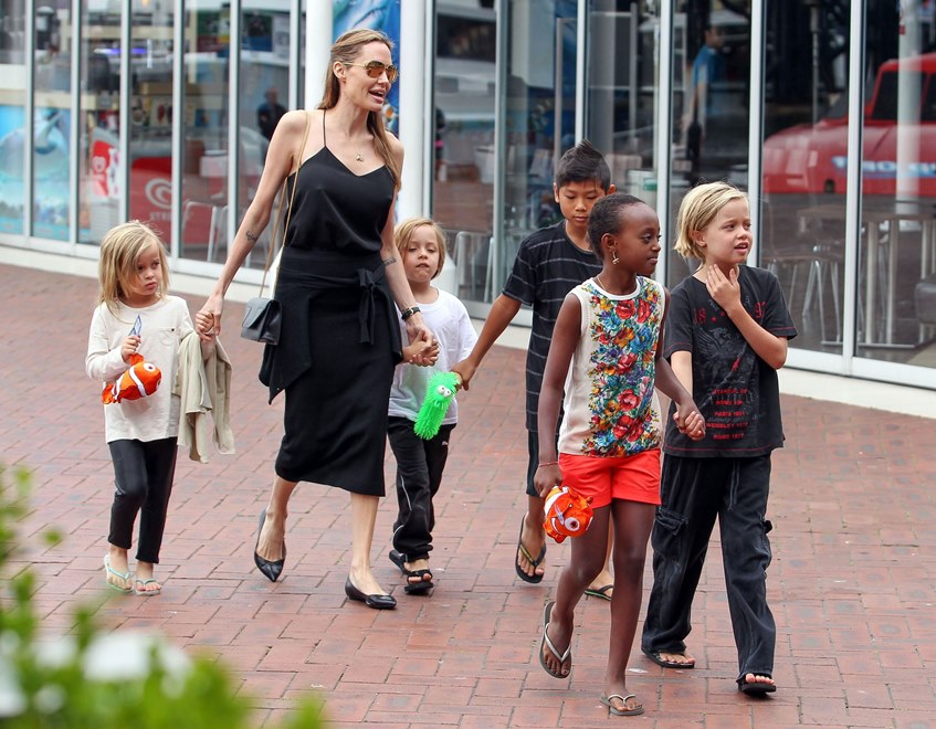 While Brad Pitt was in Toronto supporting 12 Years A Slave this weekend, Angelina Jolie had all the kids with her in Sydney while working on her new film. She took 5 of them to the aquarium. Maddox was missing, evidently needing a break from his younger siblings and their noise. Can you blame him? But I wish I could wear a pair of cargo pants as well as the young Chosen One Shiloh. Little Knox’s shoes appear to be on the proper feet this time. Flip-flops are so much easier to figure out, it’s true.