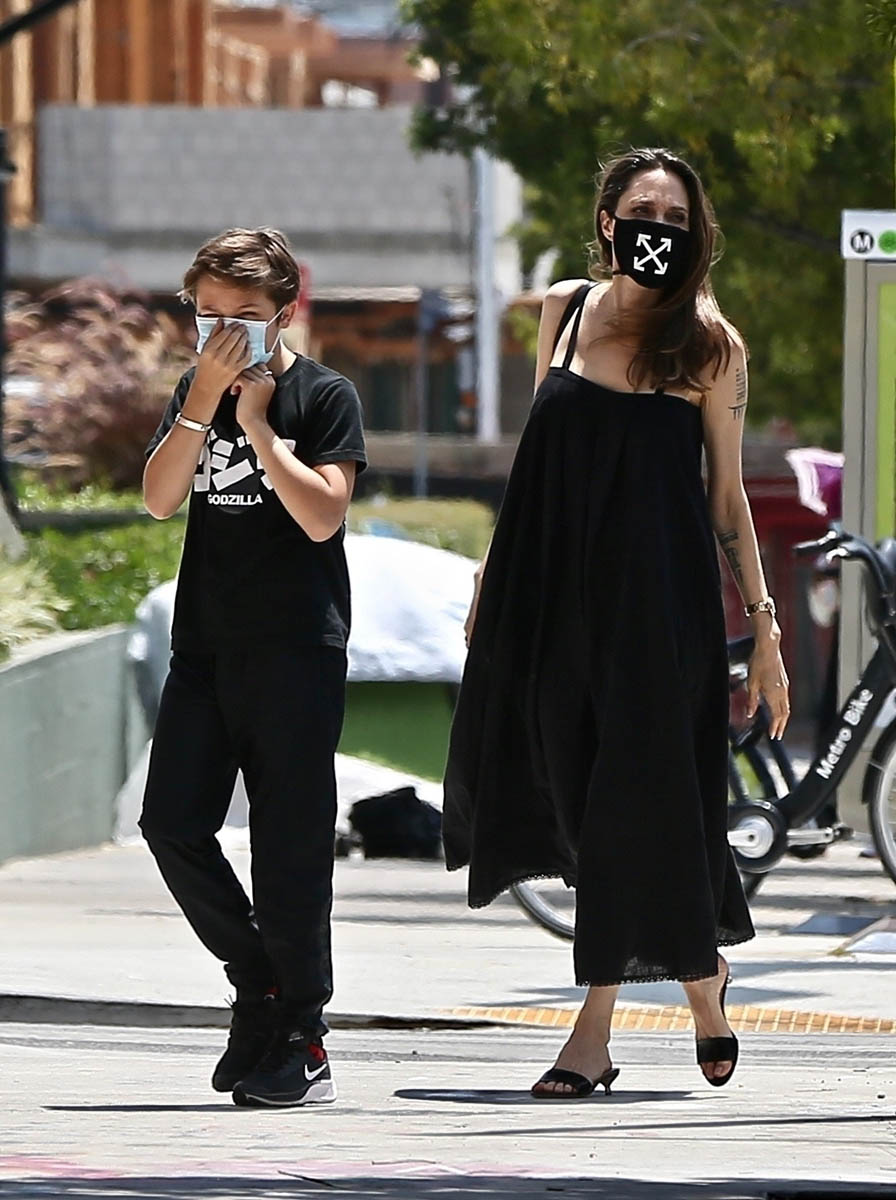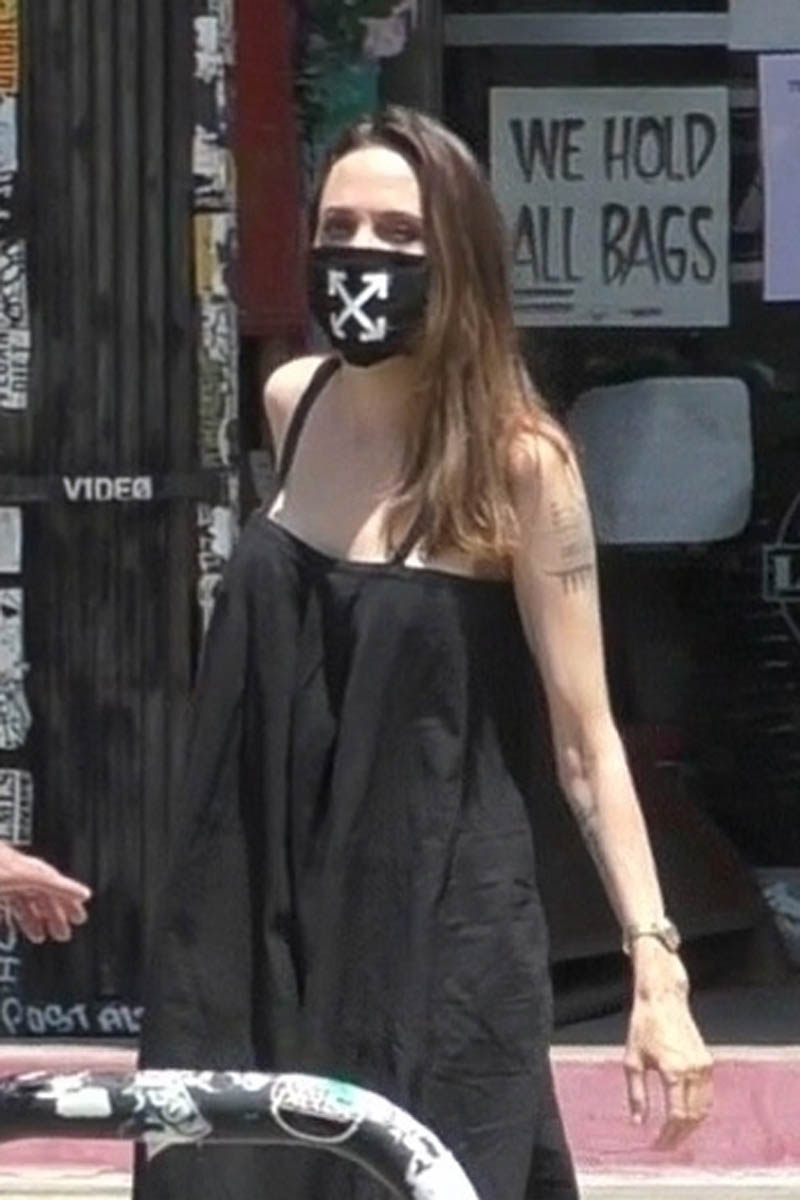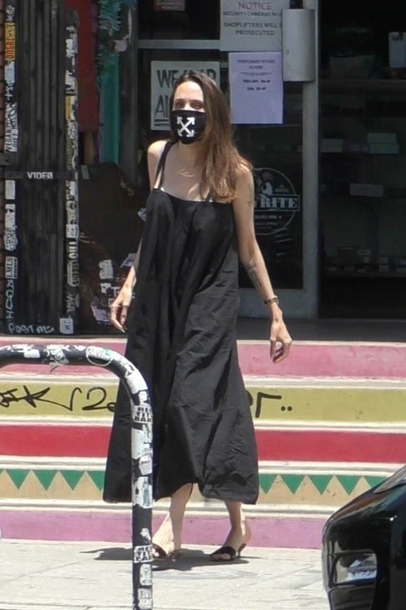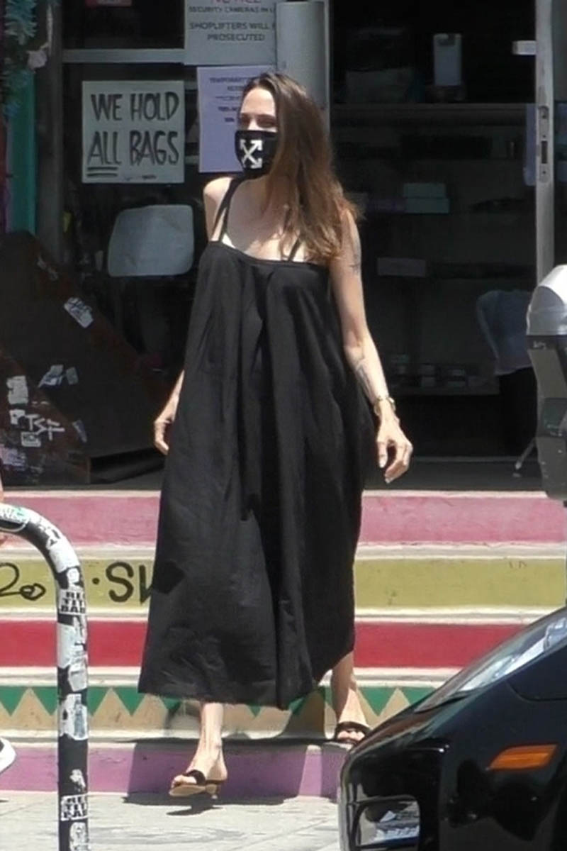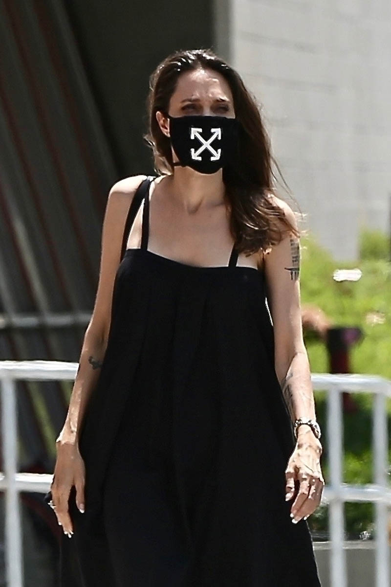 Anyway, back to Angelina looking good – is that weird, like to comment on someone looking good when their face is obscured by a mask, and the mask is being worn because there’s a global health crisis but the outfit is actually cute? I don’t know anything anymore.