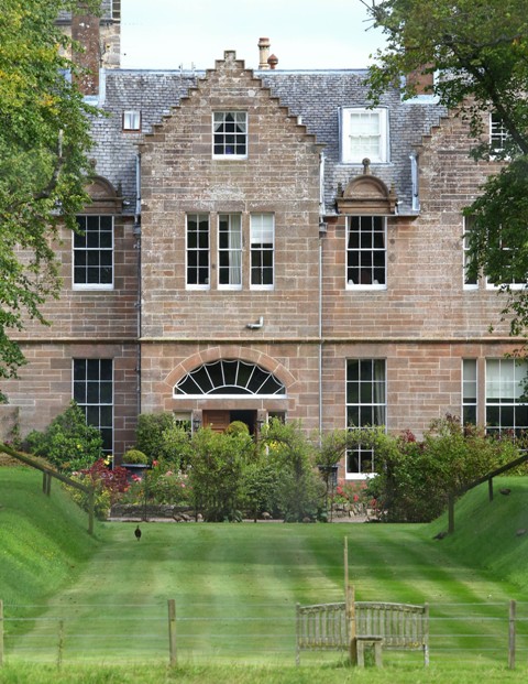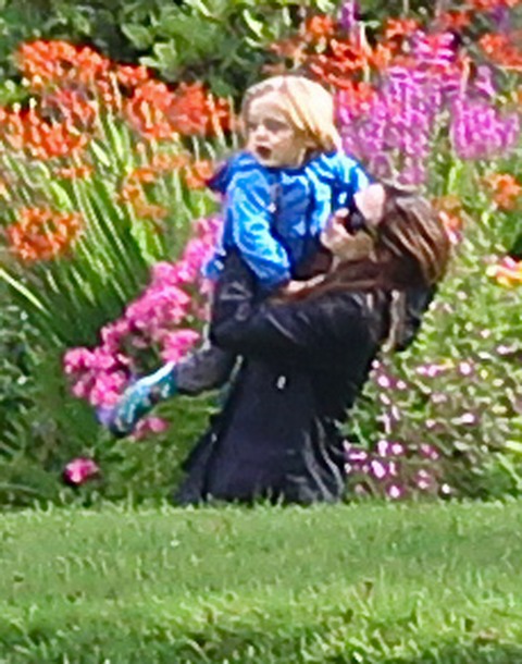 This is Angelina Jolie with her twins in Scotland today, about 40 minutes outside of Glasgow, enjoying the 10 acre Carnell Estate Mansion where they’re all staying while Brad Pitt shoots World War Z. It sleeps 20. And, as I noted the other day about the size of their entourage etc, they are probably using every single room. Can you imagine? What a production. Want to see what it looks like inside? Click here. Shiloh’s probably already taken possession of those antlers in the low ceiling dining room.