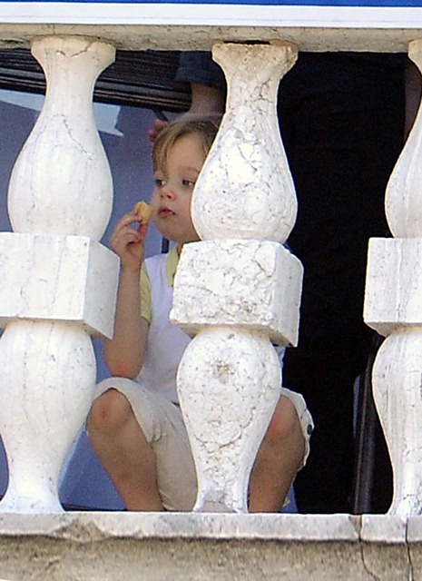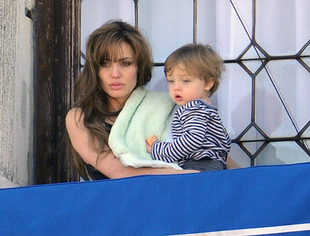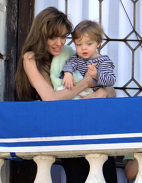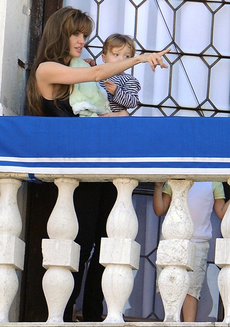 It’s the second post about them today but I had to because a few weeks ago some agencies identified Knox Leon Jolie Pitt as the Chosen One Shiloh Jolie Pitt and there was all this back and forth about whether or not it was KL or the Chosen and today Angelina stepped out on the balcony with both of them and this is the only reason I can tell them apart.