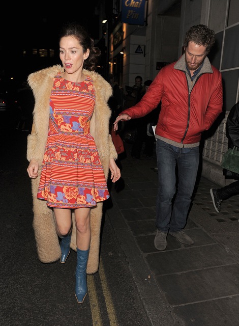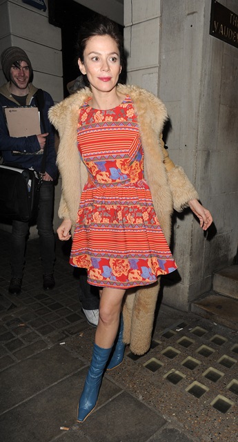 Anyway, I’m not in love with this dress, but maybe because it’s the boots. You can tell it’s an outfit built about the boots, and the dress was chosen accordingly, and if the boots were better, I suppose maybe the dress might be better but to me, though that blue is kind of interesting, I hate the shape of the toe. With the coat and all, the whole look is a little Try.
