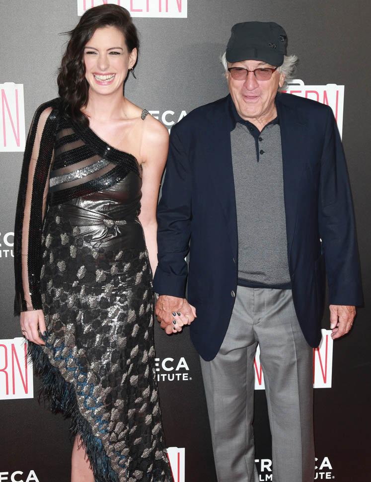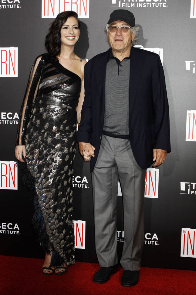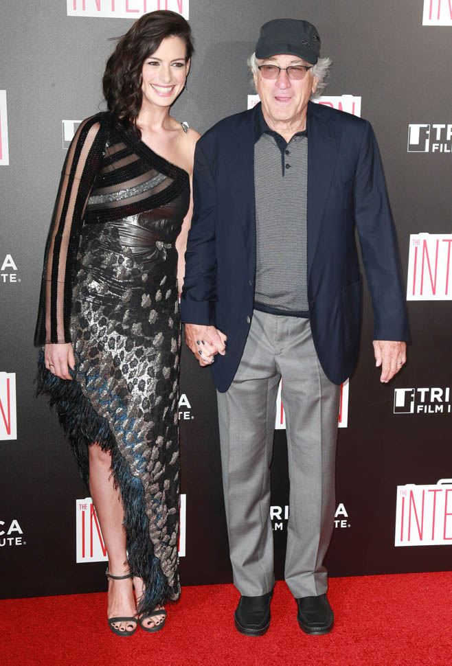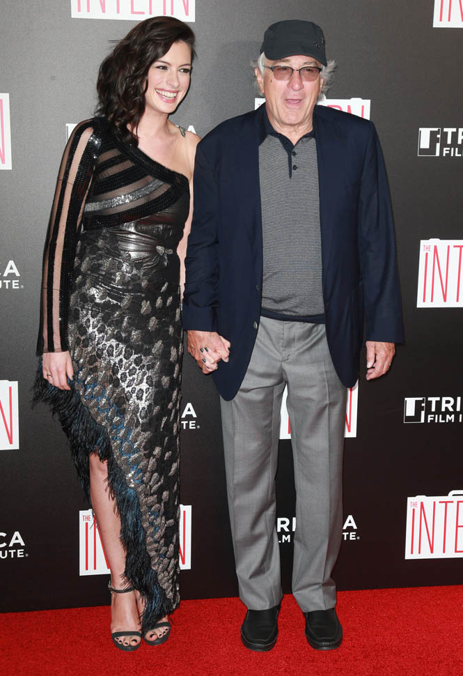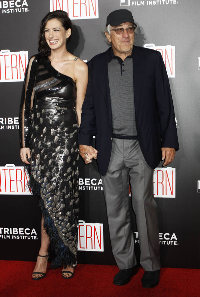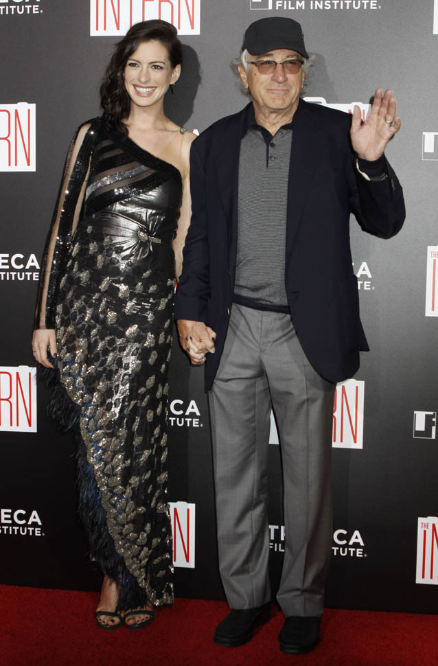 Nancy Meyers’s The Intern opens this weekend starring Oscar winners Robert De Niro and Anne Hathaway. Last night was the NY premiere. So far the reviews haven’t been great. They haven’t sucked, and Forbes says it’s “superb” but so far most critics seem to agree that the actors do the most they can with mediocre material, especially Annie, as always. Come on. She might be an eye roll to you but she’s good, isn’t she good? She’s always been good. And by all accounts she’s good in this, alongside a Robert De Niro who doesn’t phone it in either, which has been the knock on De Niro over the last decade or so. Although you shouldn’t ask him about that because he’ll walk out of the room.