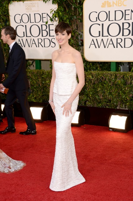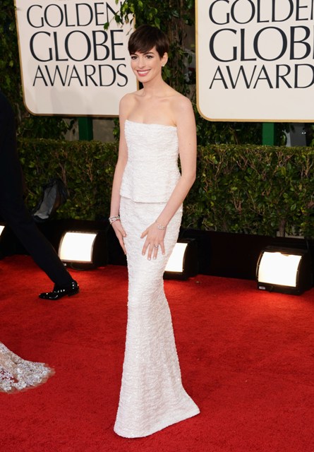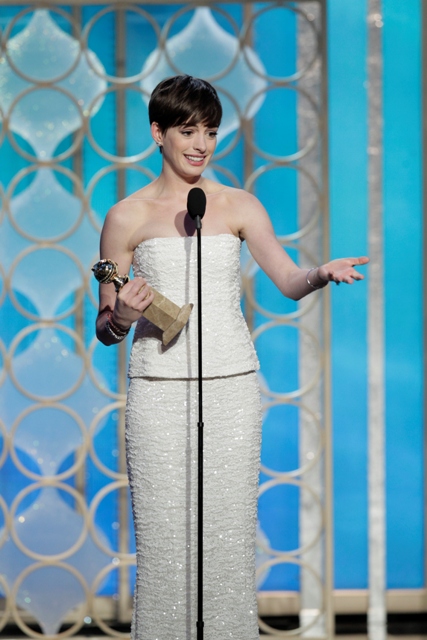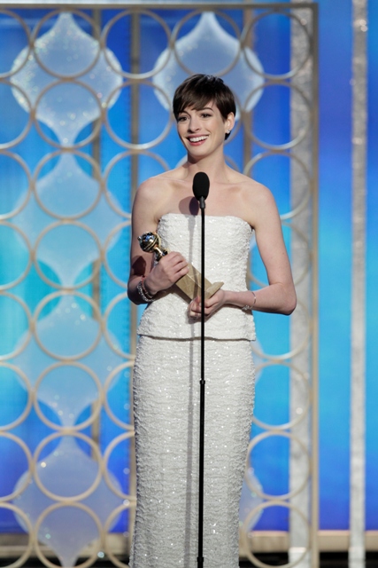 I don’t know why it has to be so hard. Anne Hathaway started the night off so strong: white dress, as is often her wont, cute hair, and the key to everything – Amy and Tina on her side with a joke early on.