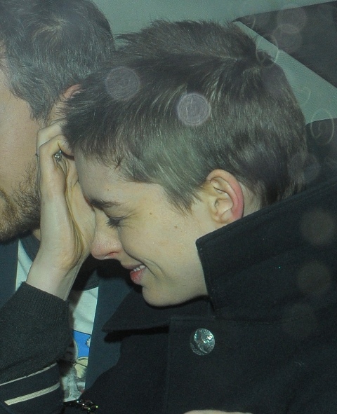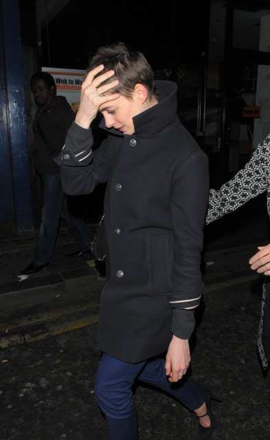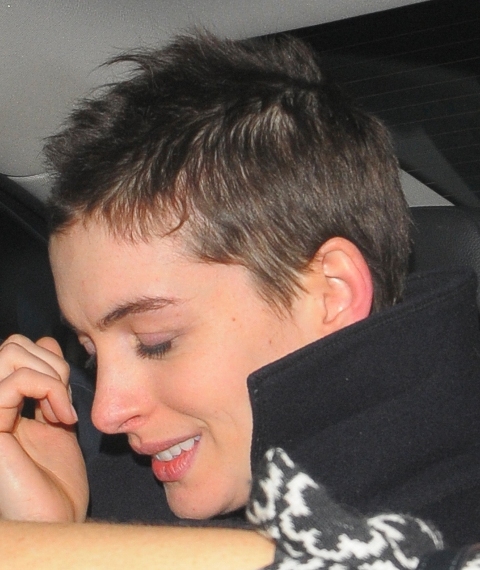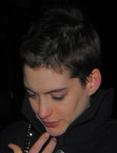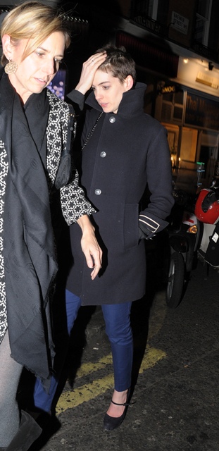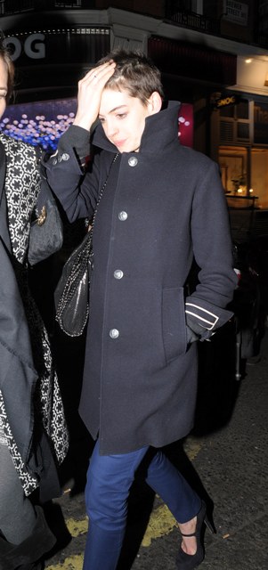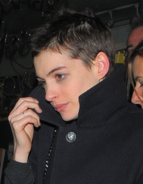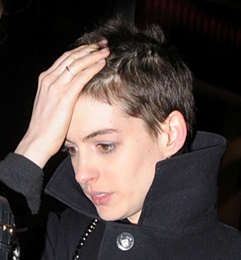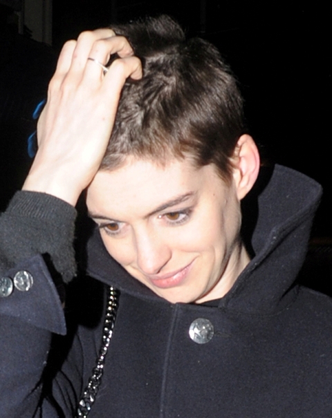 Here’s Anne leaving The Box in London the other night, photographed for the first time since she cut it for Les Miserables. And it flatters her very much, don’t you think? Oh to have soft fine hair like that that doesn’t grow upwards but close to the scalp.