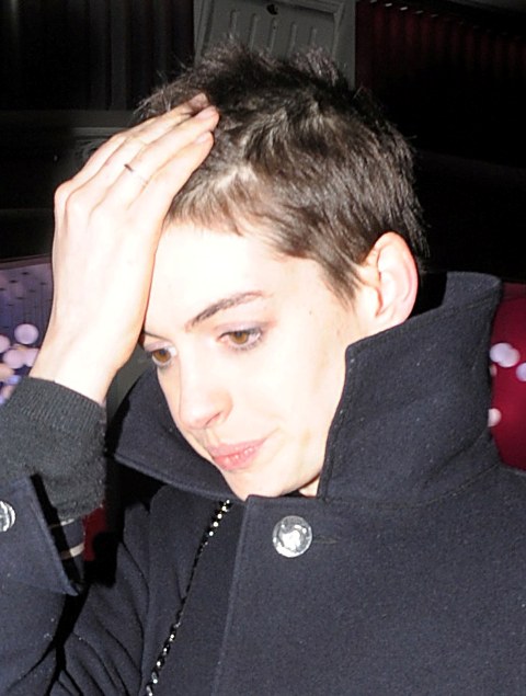 I mean, dude, if you don’t want to be seen, if you wanted it to be kept a secret, don’t go to The Box on a Saturday night, God. Would you please let me compliment you without having to roll my eyes at you? So if it’s not about not wanting it to get out, what is it all about? Is Anne Hathaway allowed to be “shy” about not having long, dark, flowing rivers cascading over her shoulders? Or is it more like, “oh poor me, I suffered so much with the chop, and it really made me uncomfortable, but these are the places I’m willing to go in pursuit of my craft”. I often wonder how often actors have genuine emotions.