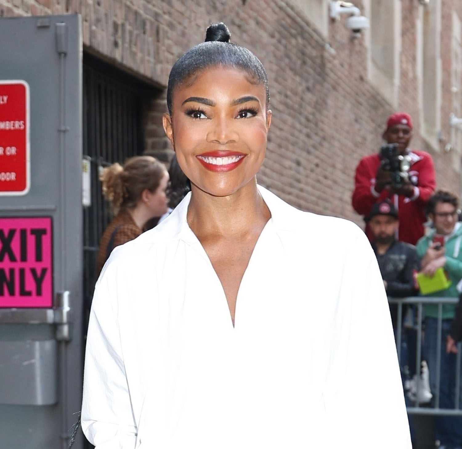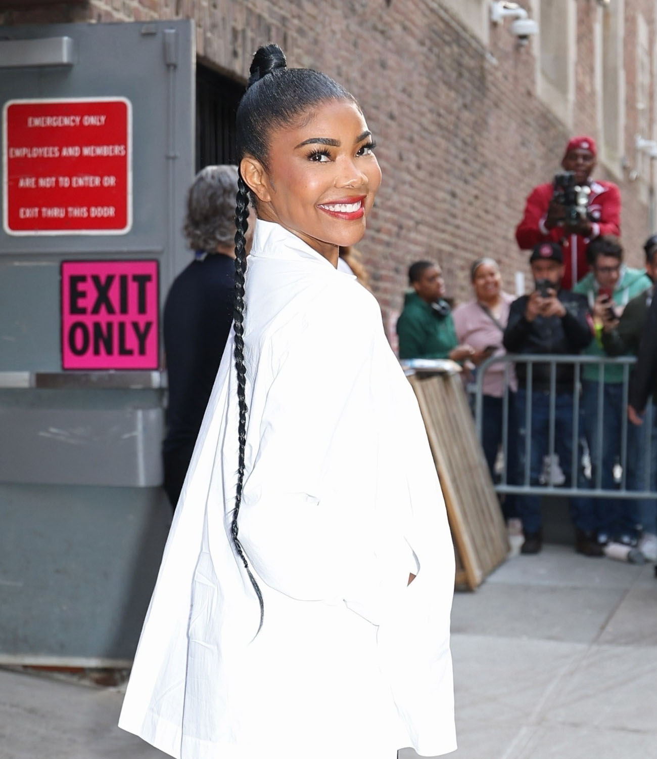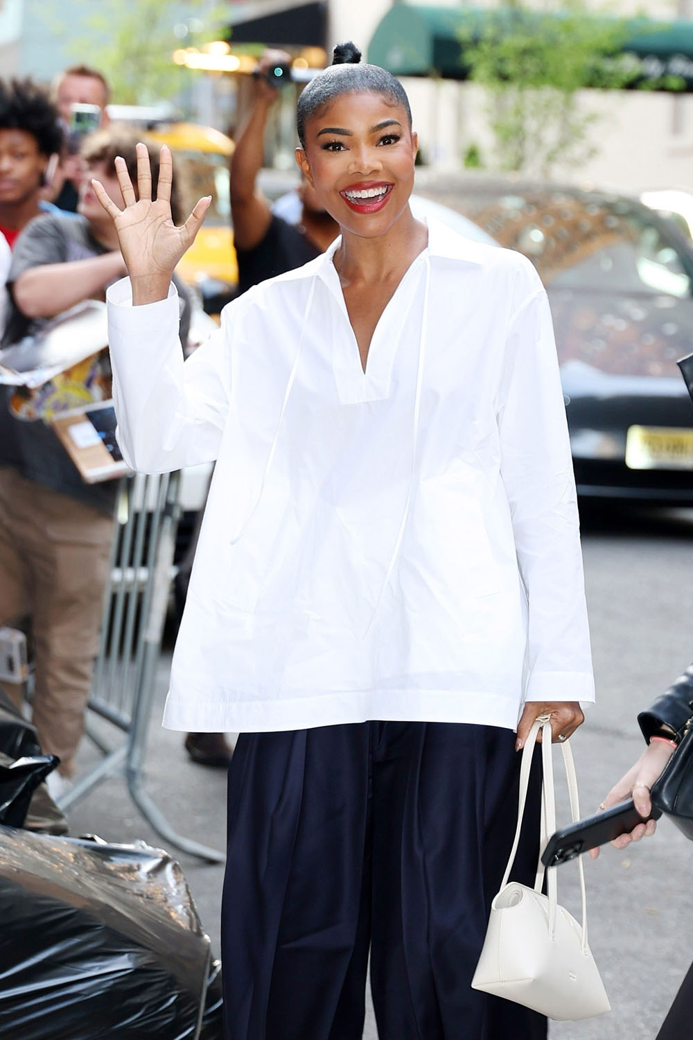 But also let’s not sleep on Gabby’s look from yesterday. She said she only had 30 minutes to get ready and was in such a rush but this fit is giving prepared and perfect. Loose but structured white shirt that’s kinda like a chef’s jacket over black culottes and an excellent braided pony, chic AF.