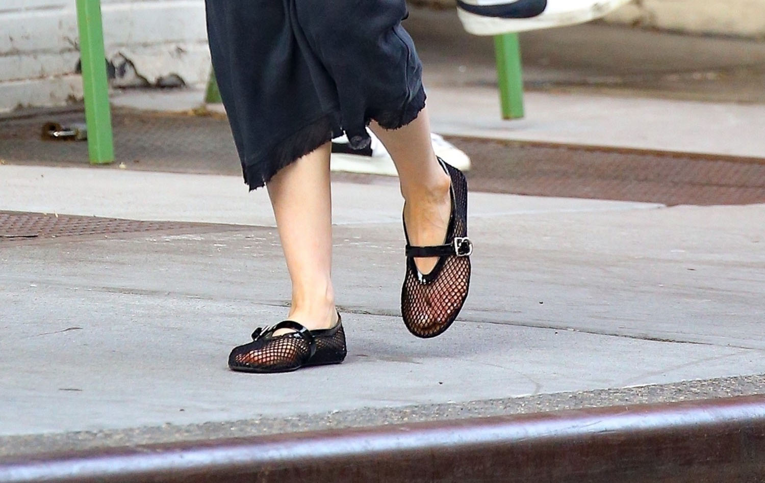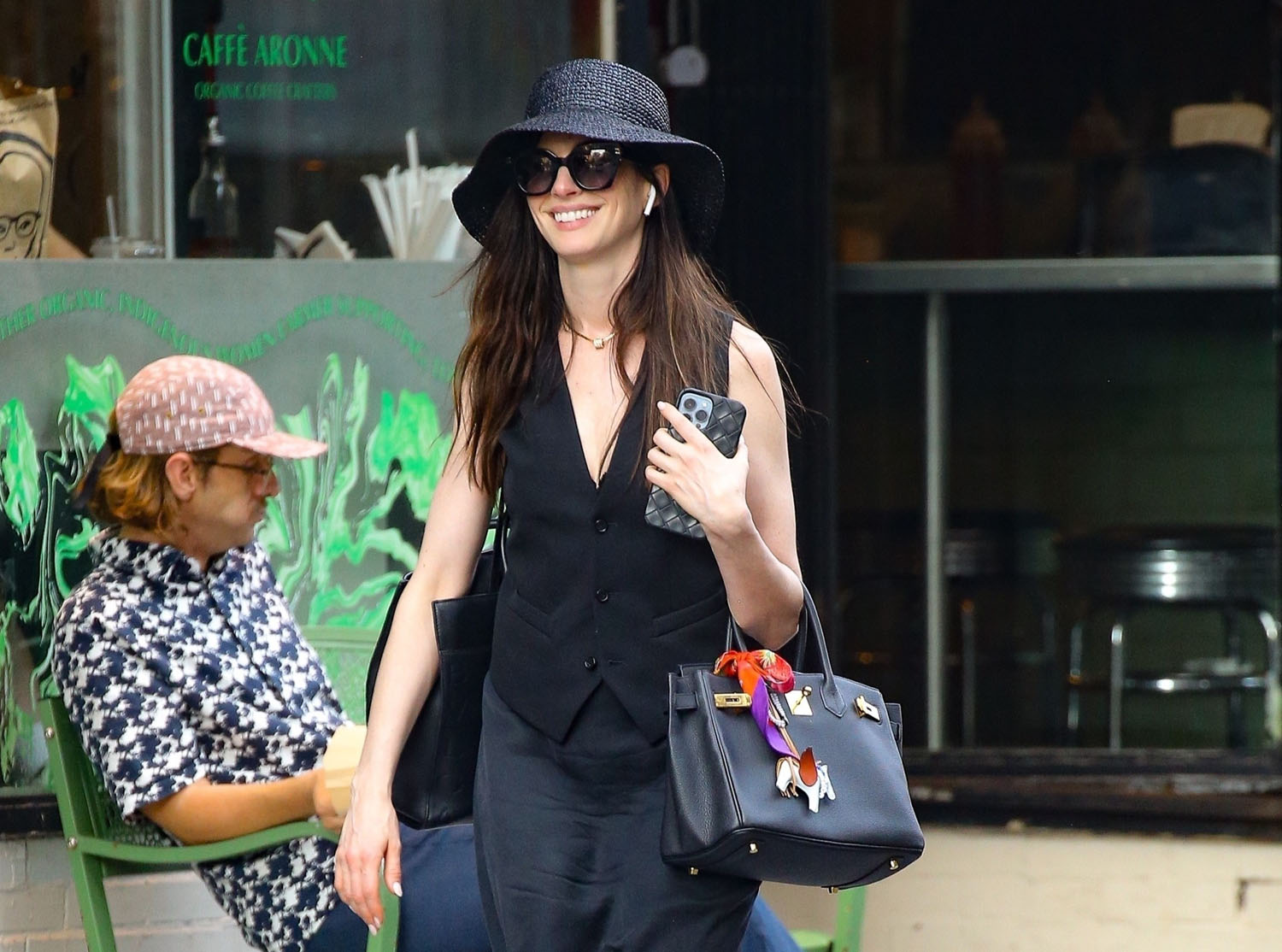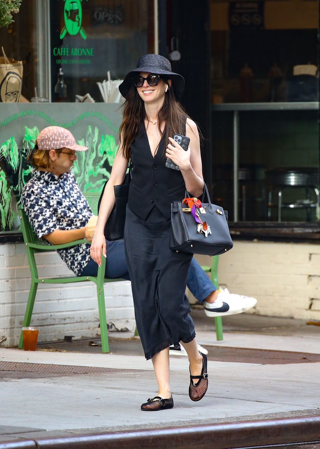 Here she is in a very Anne Hathaway outfit with the floppy hat and those f-cking mesh sandals that are the shoe of the season. It’s not going to be me… but everyone else is all over them.