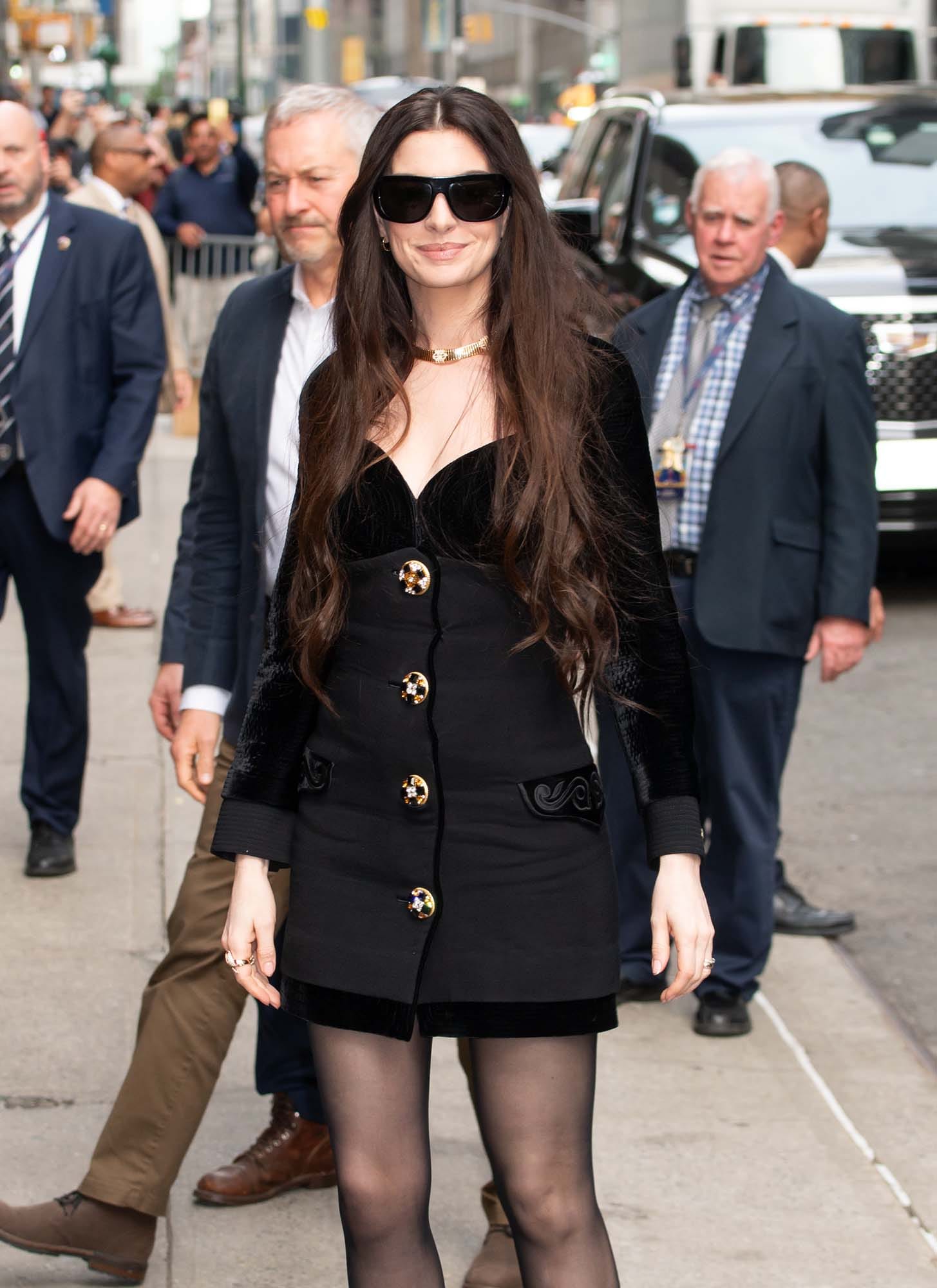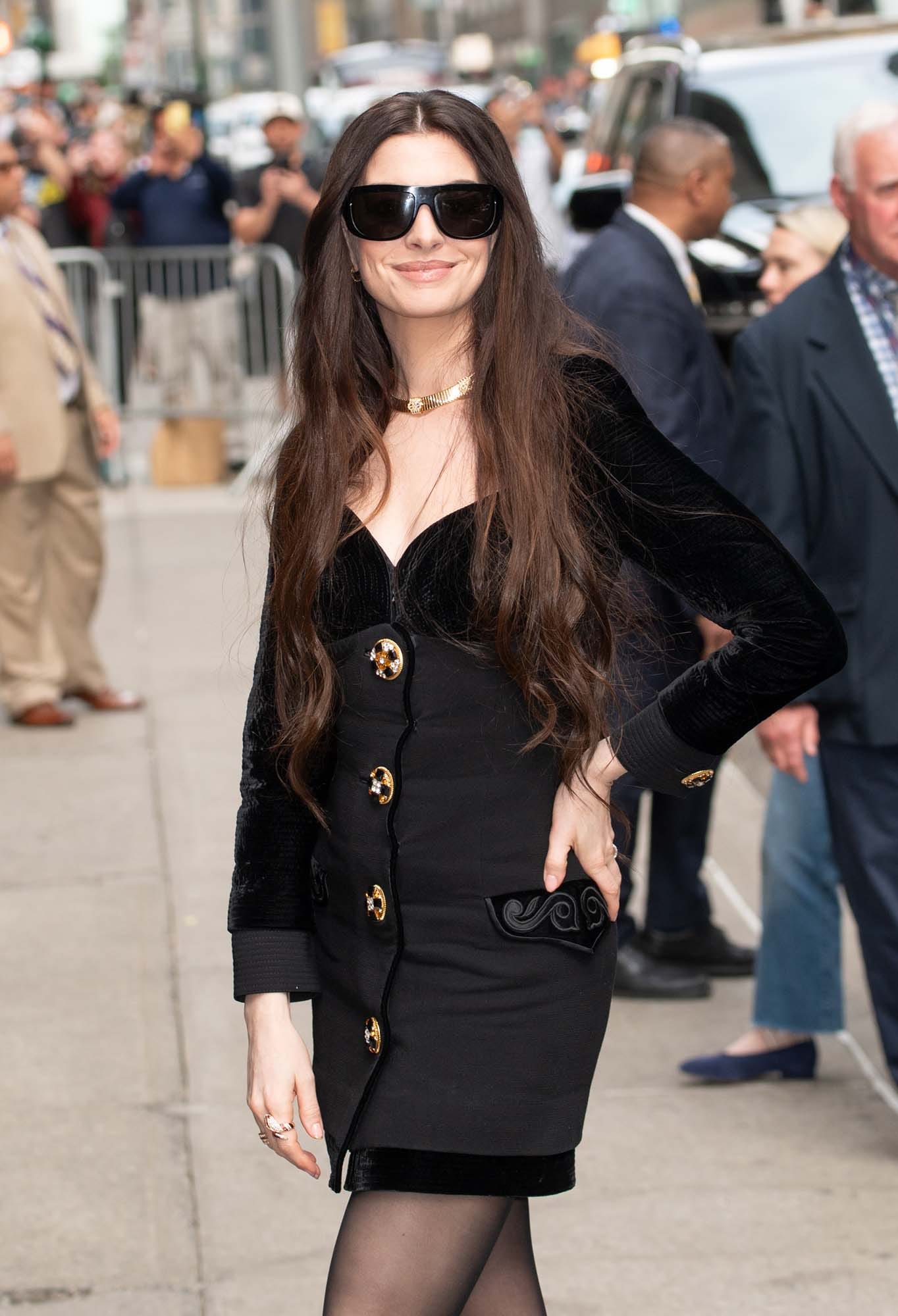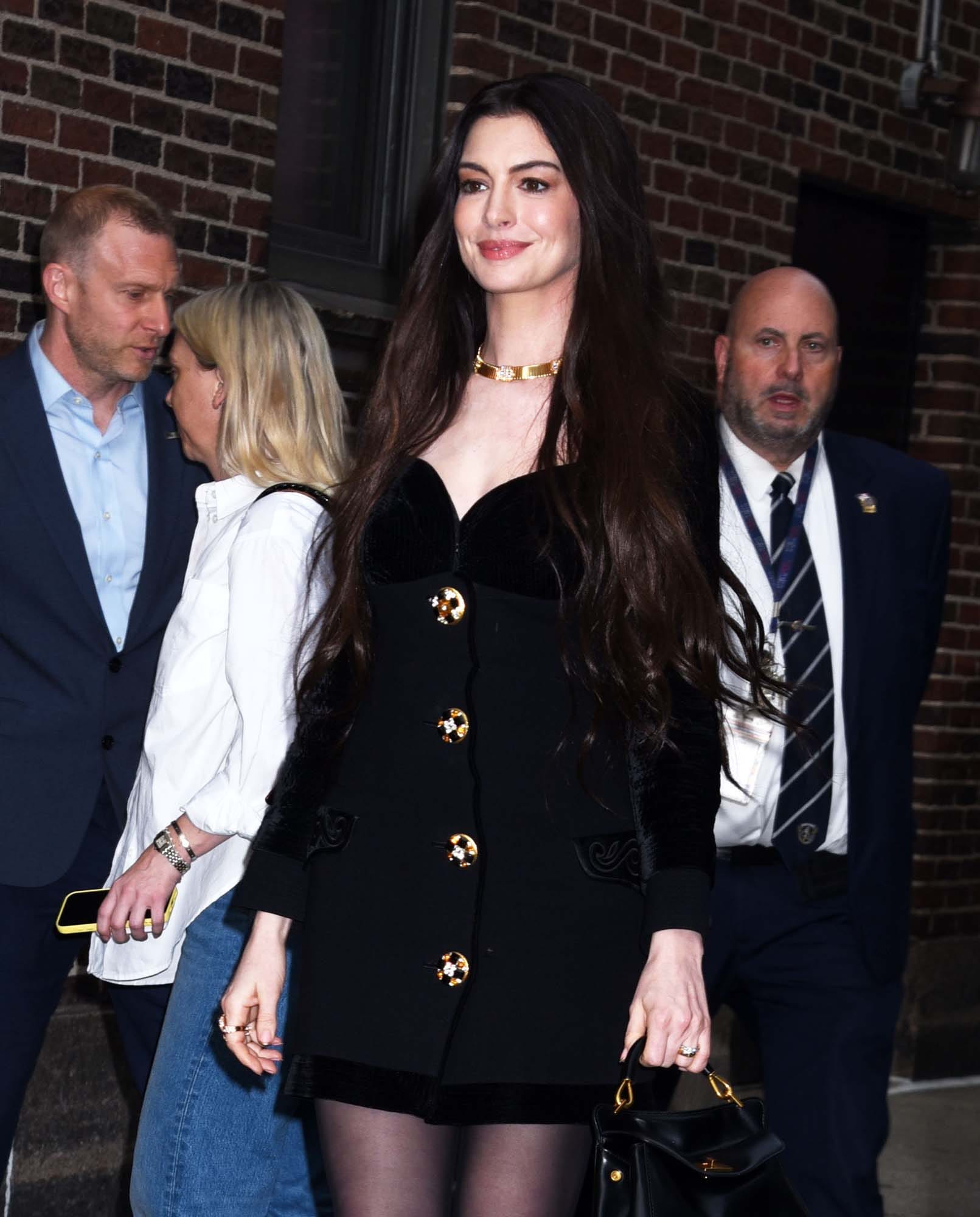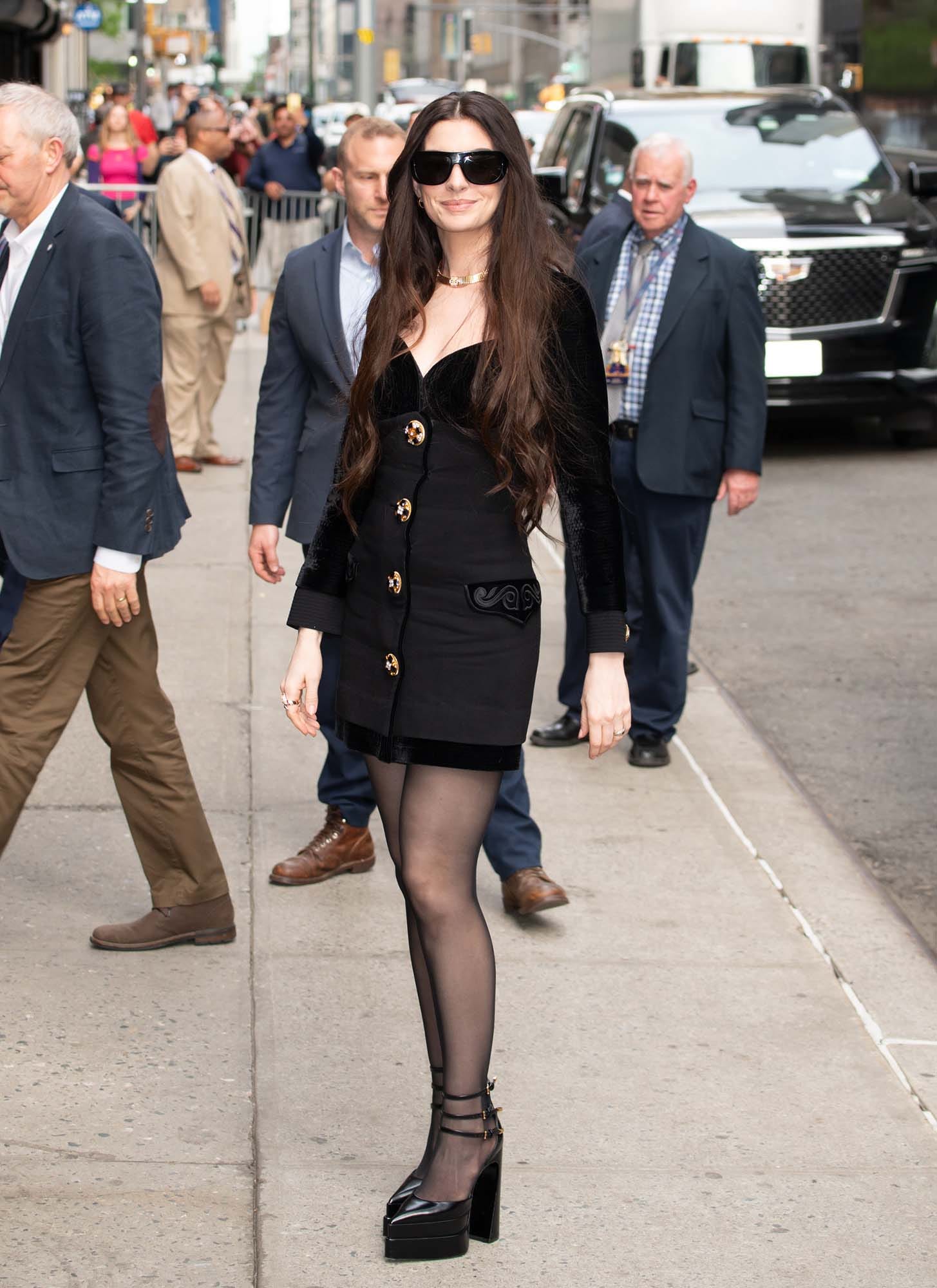 Anne Hathaway at The Late Show with Stephen Colbert in NYC, April 15, 2026