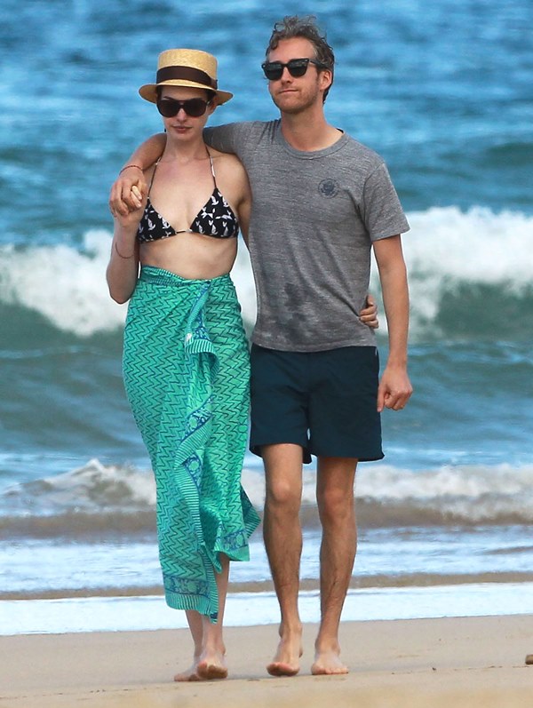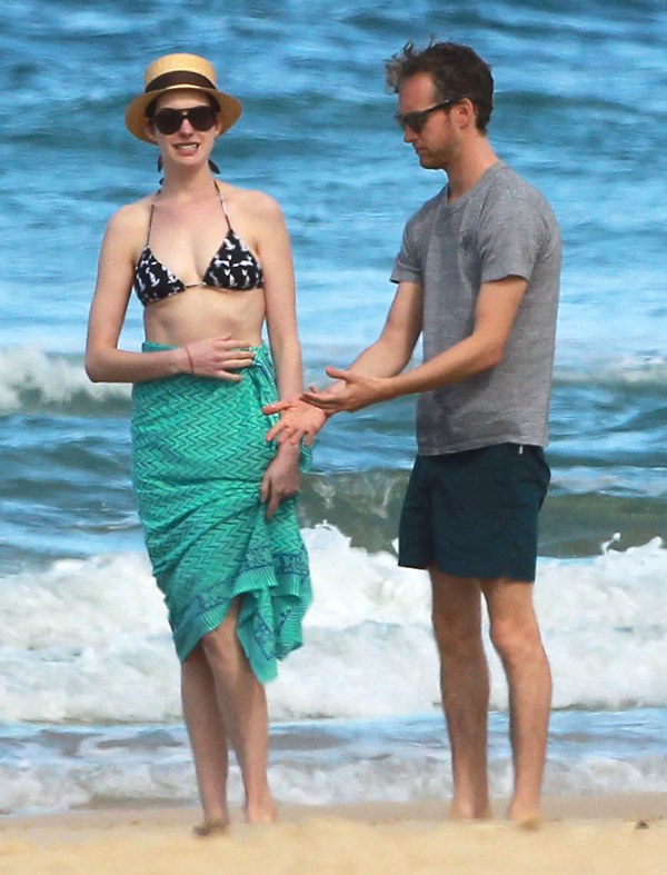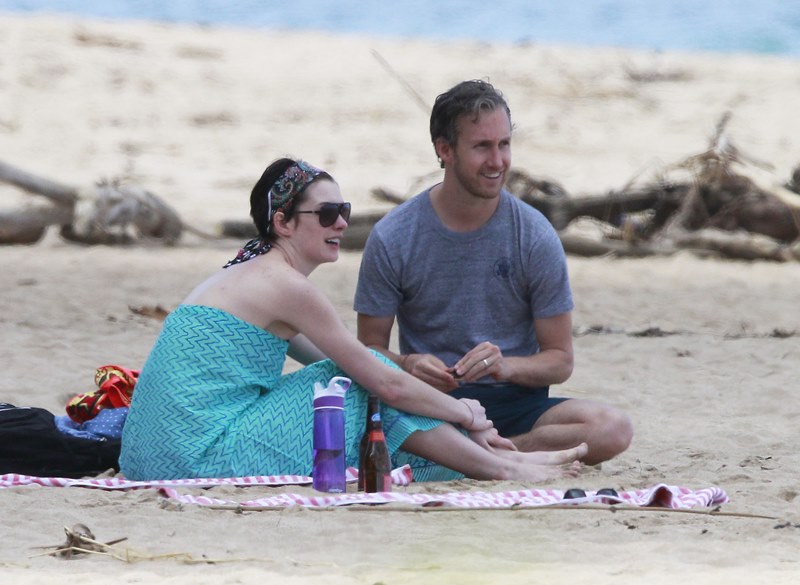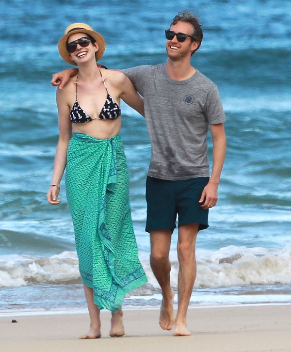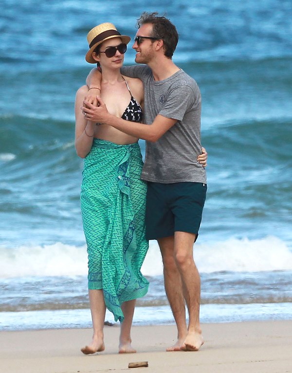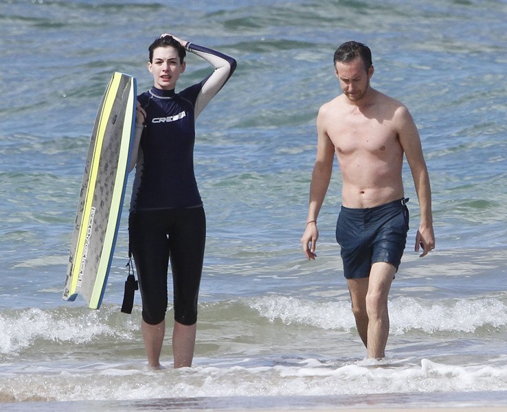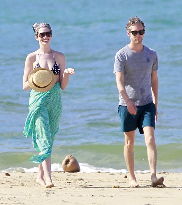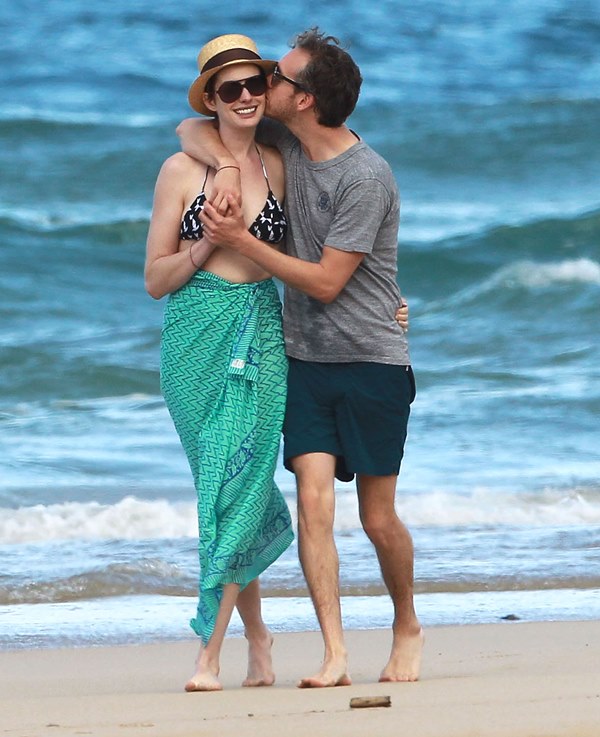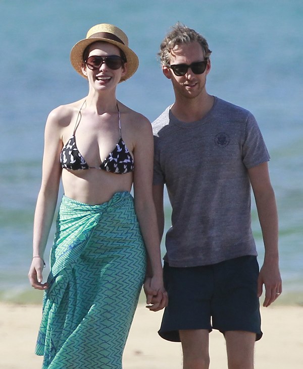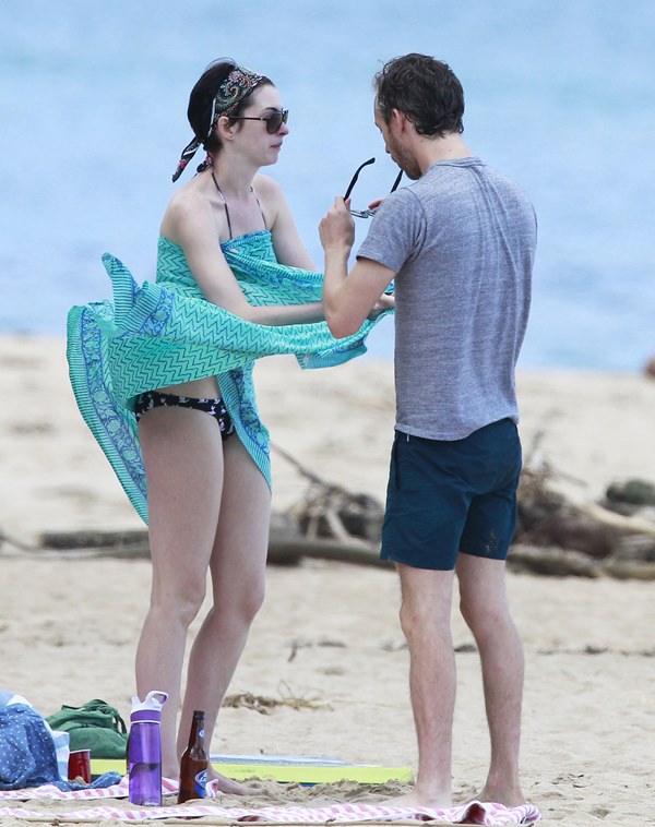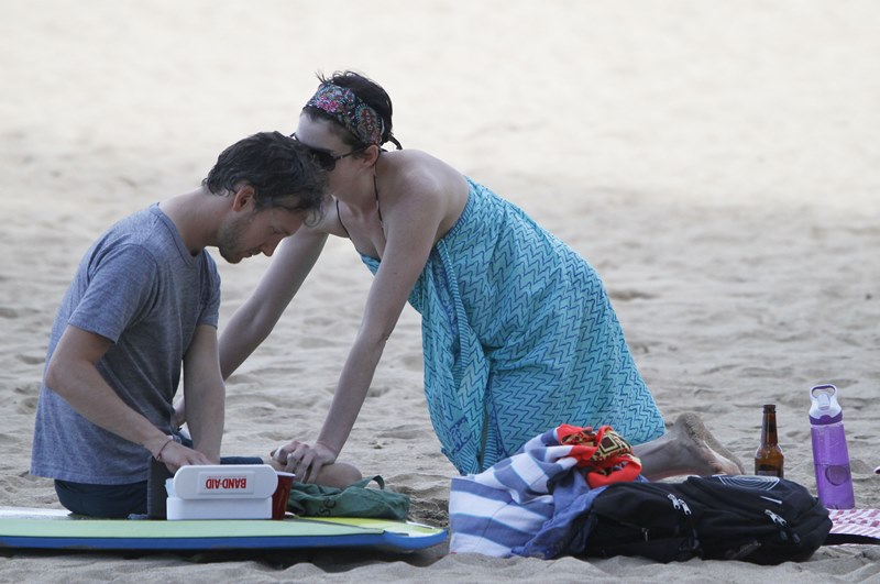 Anne Hathaway and Adam Shulman are on holiday in Hawaii. Somehow she hurt her foot. So when she came back to shore, her husband cleaned it for her by sucking on a toe and putting on a band-aid. Dude, that’s love. My husband wouldn’t do that for me. He hates my feet. I hate his feet too. His toenails are vile. So no, I wouldn’t do it for him either. I would sell jewellery, anything, to hire someone to put him on a stretcher and take it to get treated, but I would not put my mouth on his foot.