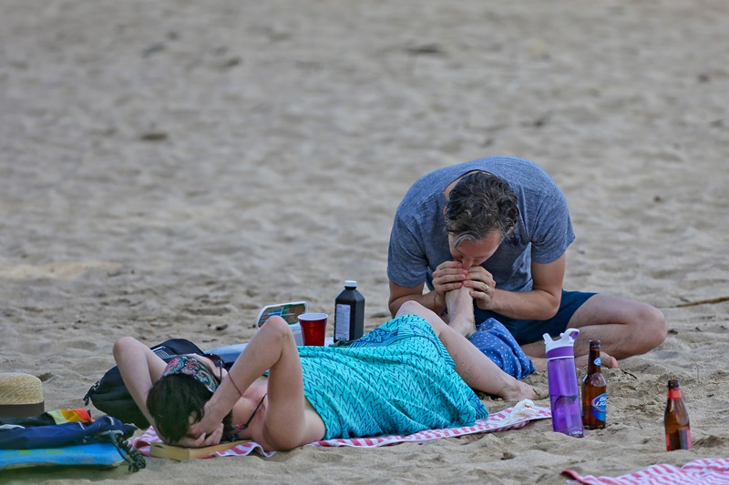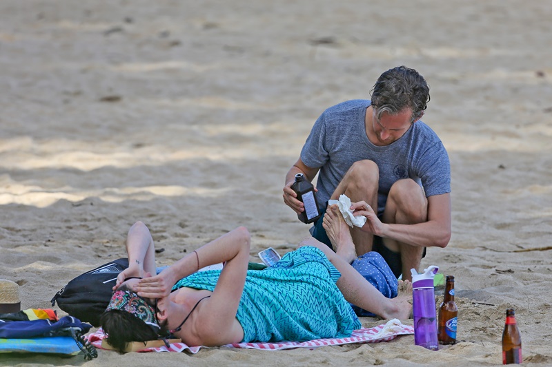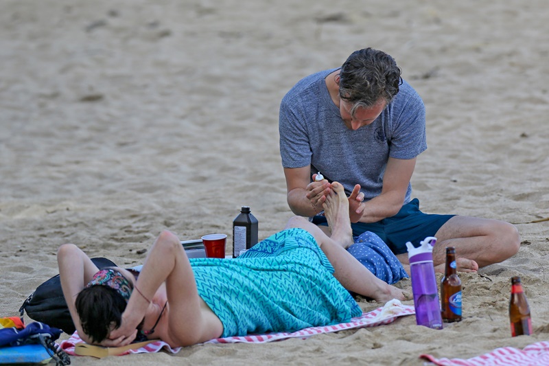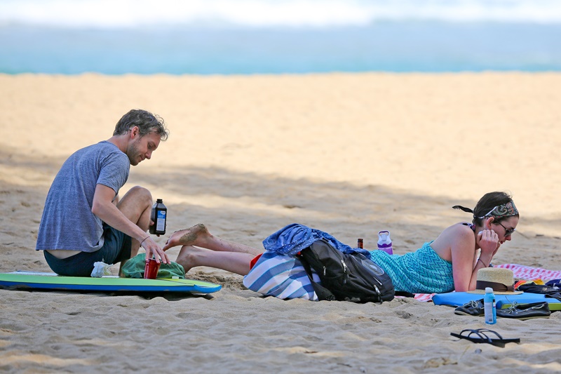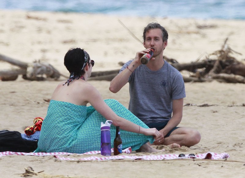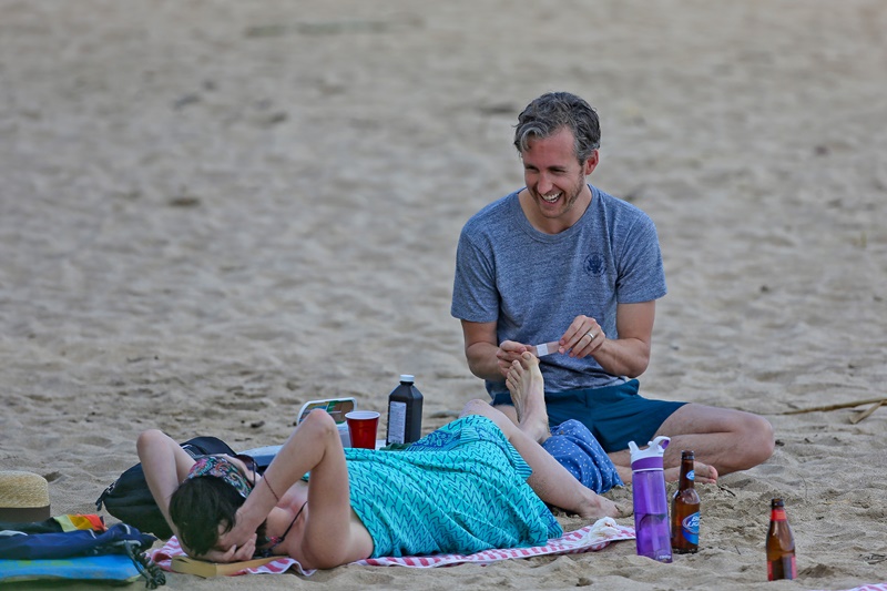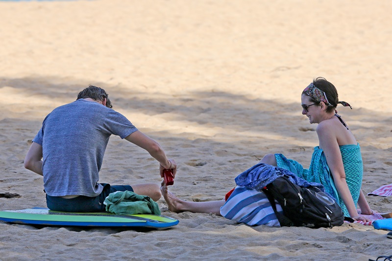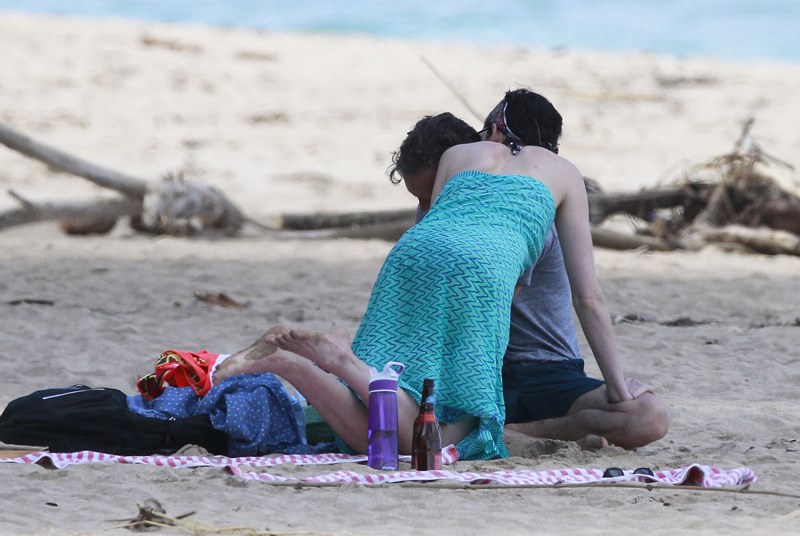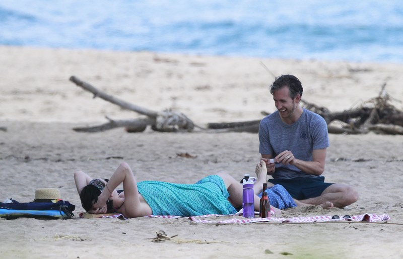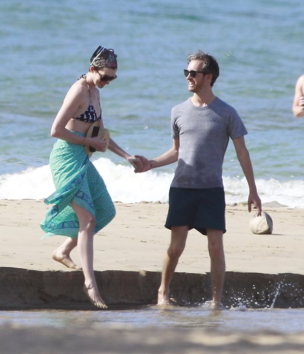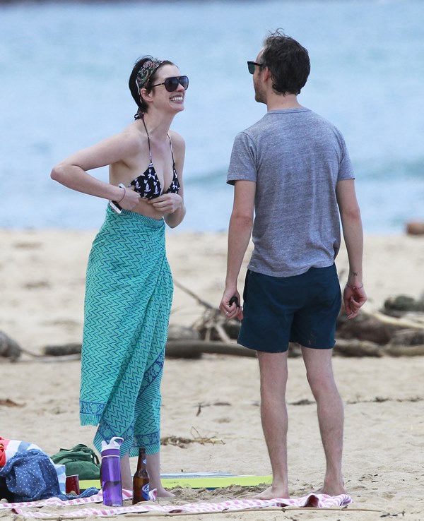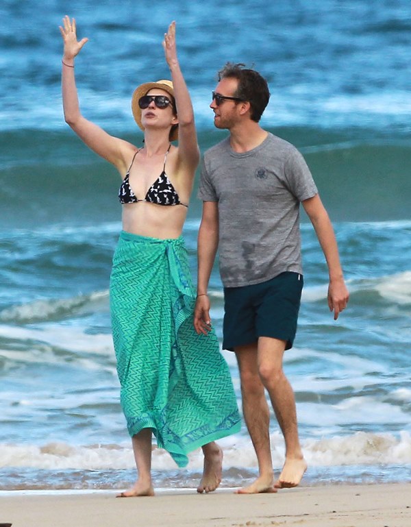 Anne Hathaway and Adam Shulman are on holiday in Hawaii. Somehow she hurt her foot. So when she came back to shore, her husband cleaned it for her by sucking on a toe and putting on a band-aid. Dude, that’s love. My husband wouldn’t do that for me. He hates my feet. I hate his feet too. His toenails are vile. So no, I wouldn’t do it for him either. I would sell jewellery, anything, to hire someone to put him on a stretcher and take it to get treated, but I would not put my mouth on his foot.