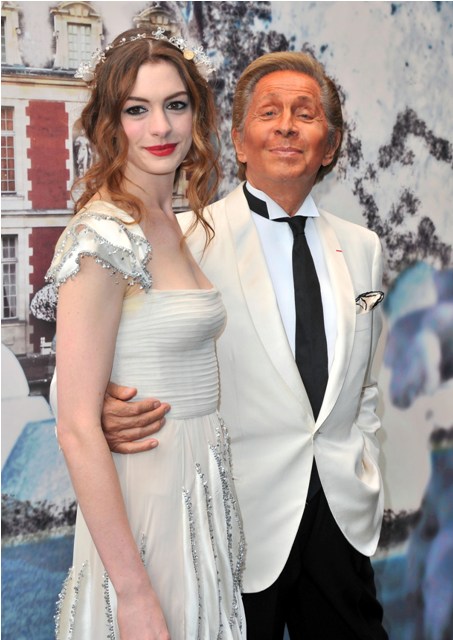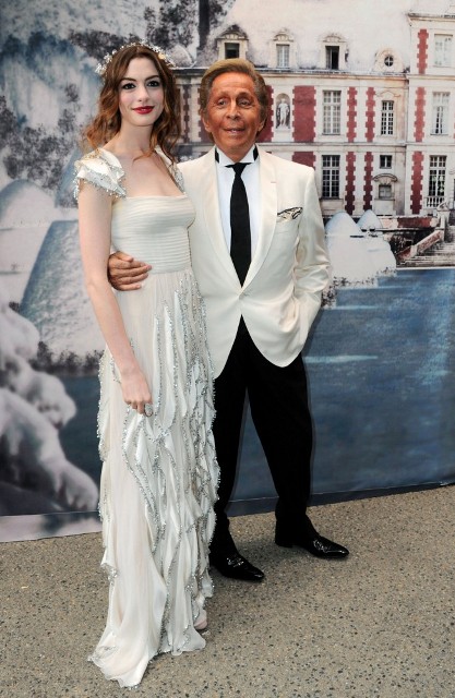 It's just that...when they put the face glove on you, and then the helmet, and the viser comes down, you can't breathe! There's no fresh air! And if you're claustrophobic, which I think I've just developed, it's ...not fun. Anyway, I made it, and didn't pee myself or puke, and now it's on to Anne Hathaway in Paris last night with Valentino hosting a charity benefit wearing what could totally be one of the most beautiful wedding looks I've ever seen.