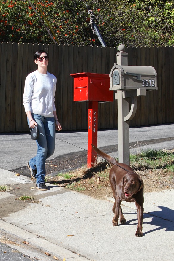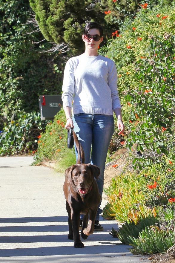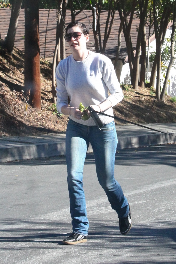 Here’s Anne Hathaway going for a walk with her dog Esmeralda yesterday in LA. It’s almost been a year since Annie won her Oscar. She’s kept a pretty low profile since then. Still working steadily but much less visible than she was during the campaign. Evidently, when she’s not campaigning, she doesn’t want to be photographed. Because after picking up Esmeralda’s sh-t, she left the bag on a pap’s windshield.