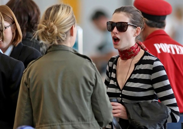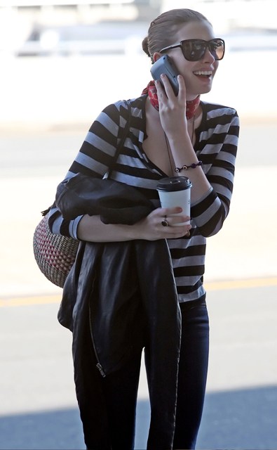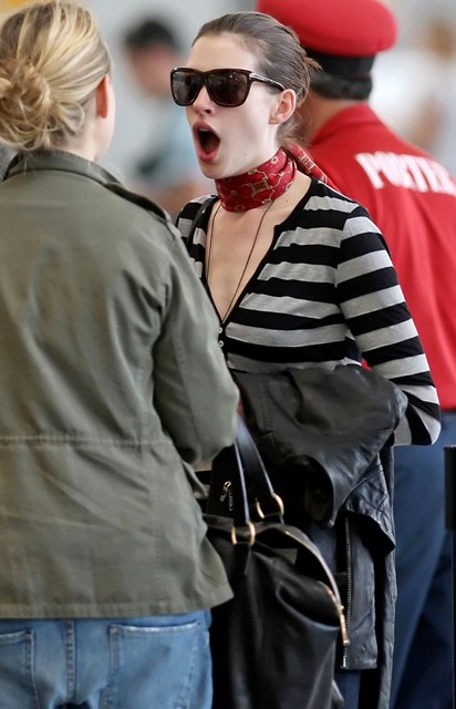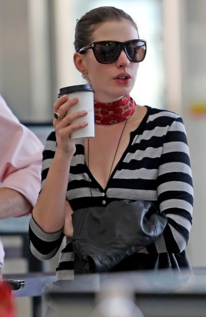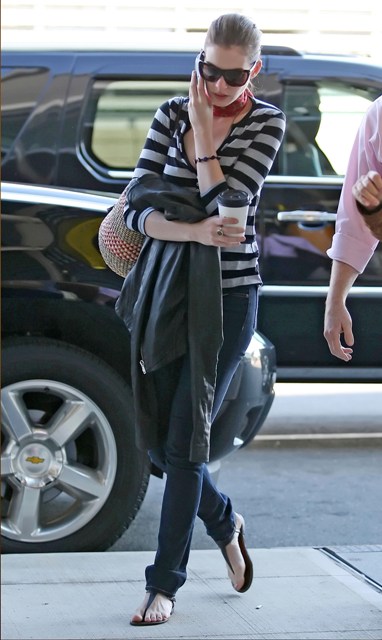 Having said that, am all over her travel attire. Stripes. Love stripes. She looks great in stripes. And the glasses cover the squirrel eye – nice. And her skin looks clean and fresh and healthy, even though like all of them she smokes like a fiend.