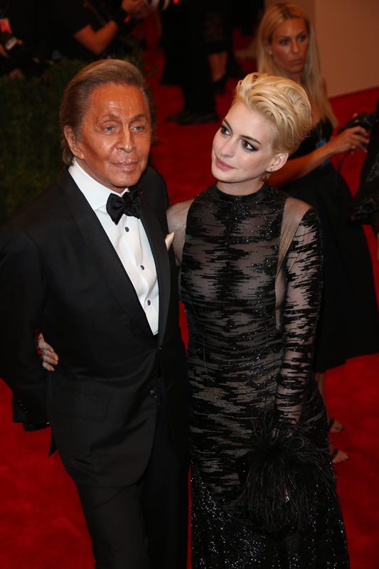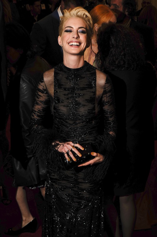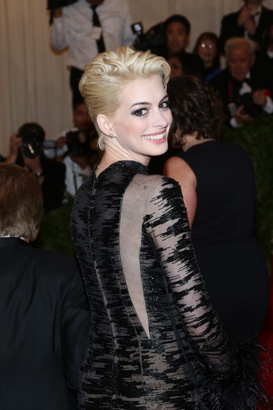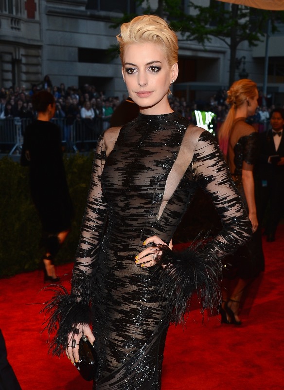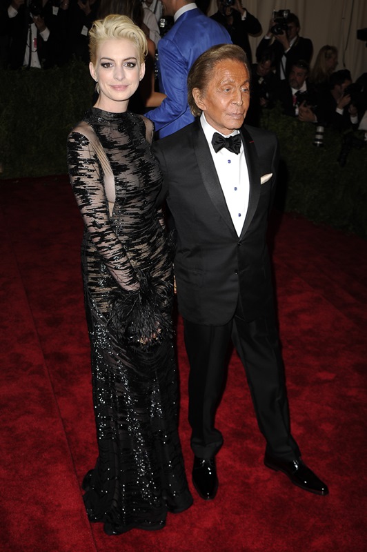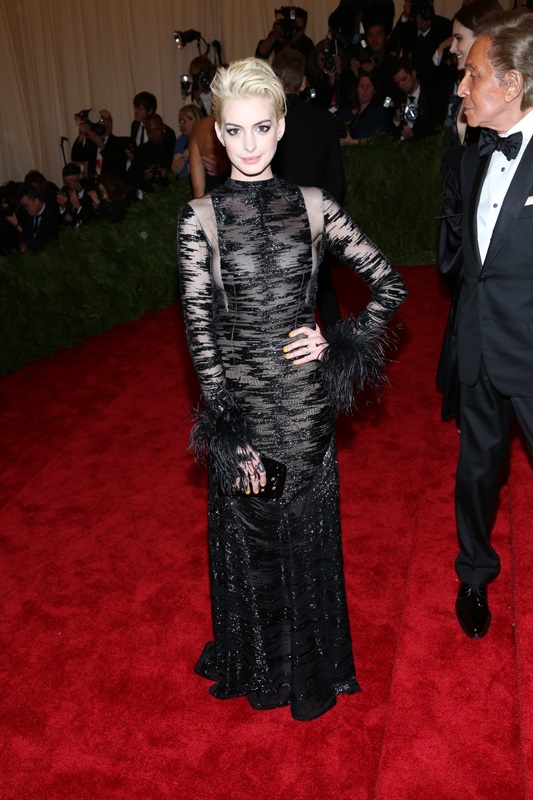 First -- Anne Hathaway, no Annie here. This is how you come back from pink Prada nipples at the Oscars -- in an exquisite vintage Valentino with strategic sheer side breasting that isn’t at all low classy. And brand new blonde hair. Which totally works on her. Because it ages her. And you need that maturity and suggested experience in a gown like this. It’s not a gown for a girl. There’s a certain... Sharon Stone quality to Anne here, non? The blonde actually makes the dress purr. Selena Kyle then, as opposed to Fantine. OK. I’ll take it.