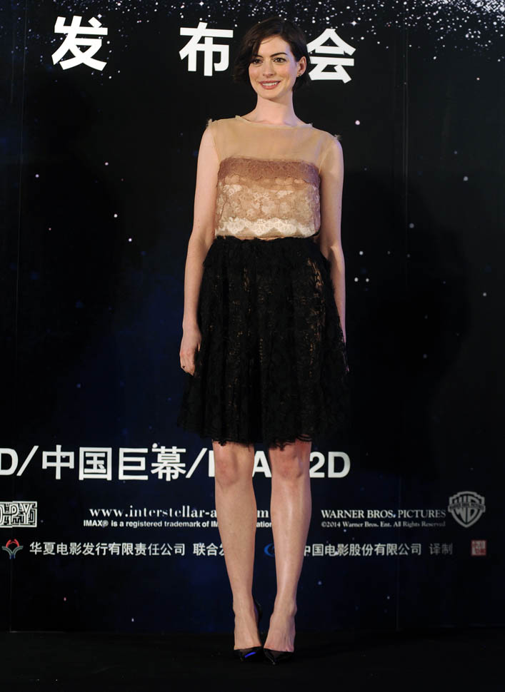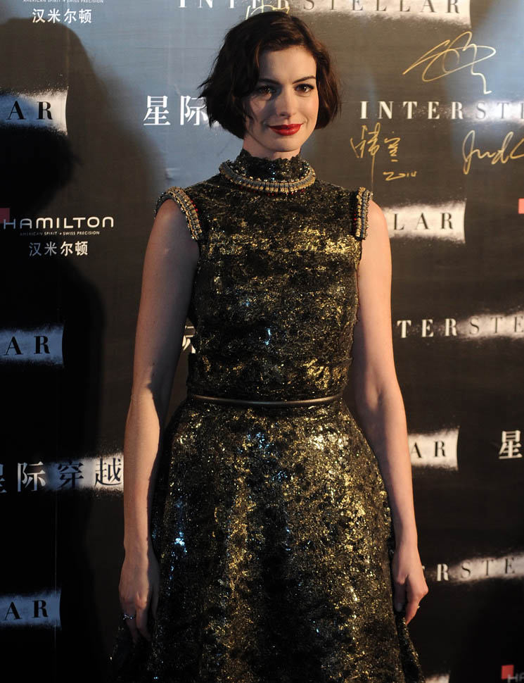 The sequined blouse and black skirt for the presser is OK. The high neck, floor length, Elizabethan-ish gown at the premiere is spectacular. I LOVE how the bob looks on her right now. It’s such a great length for her face.