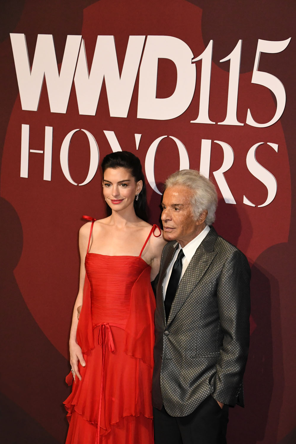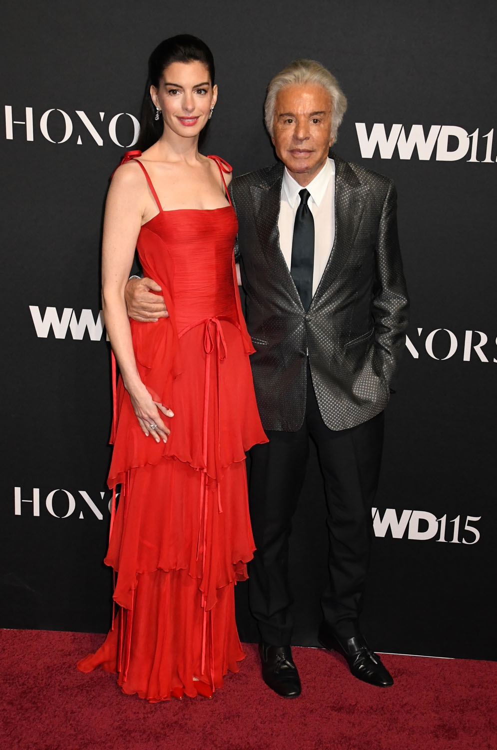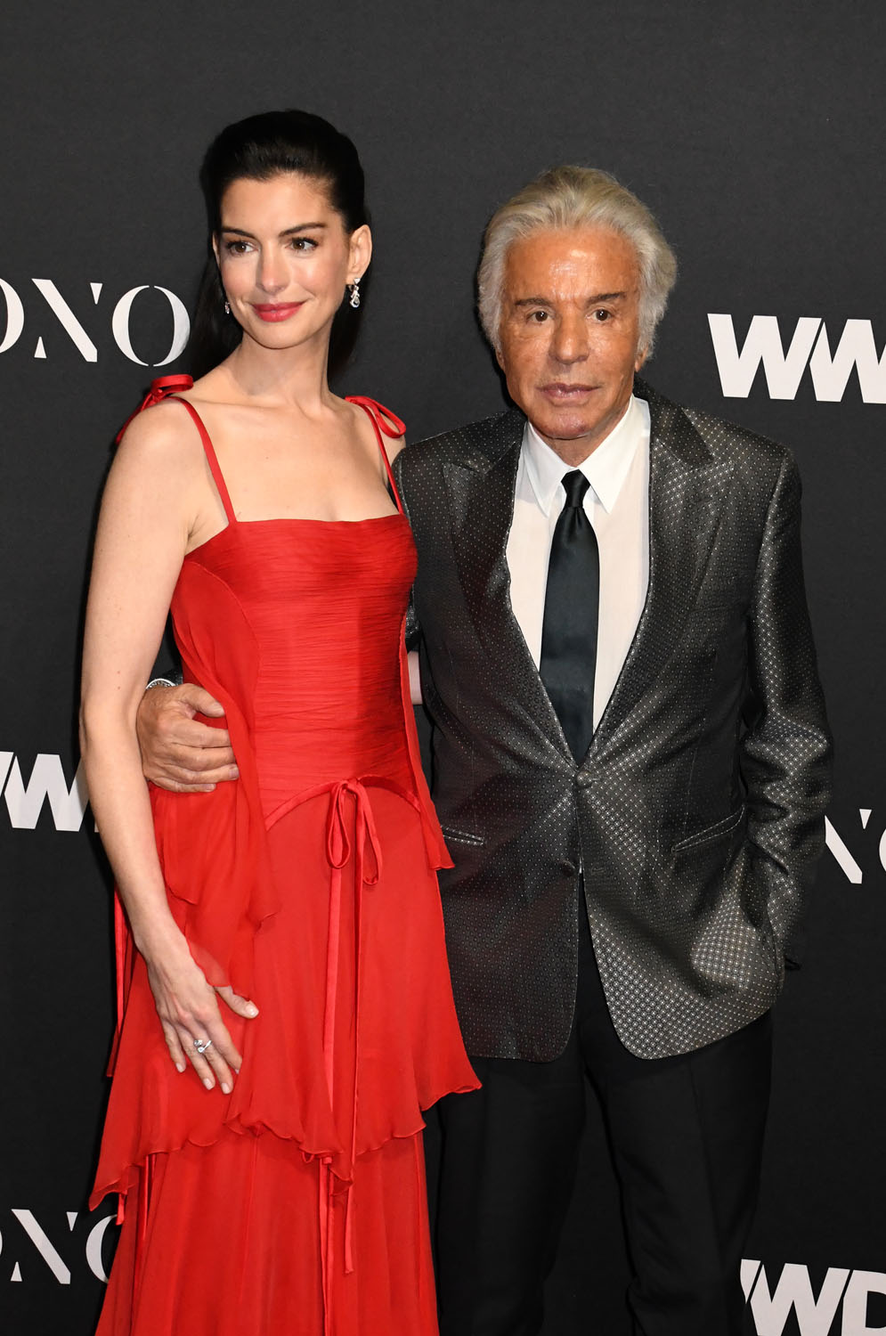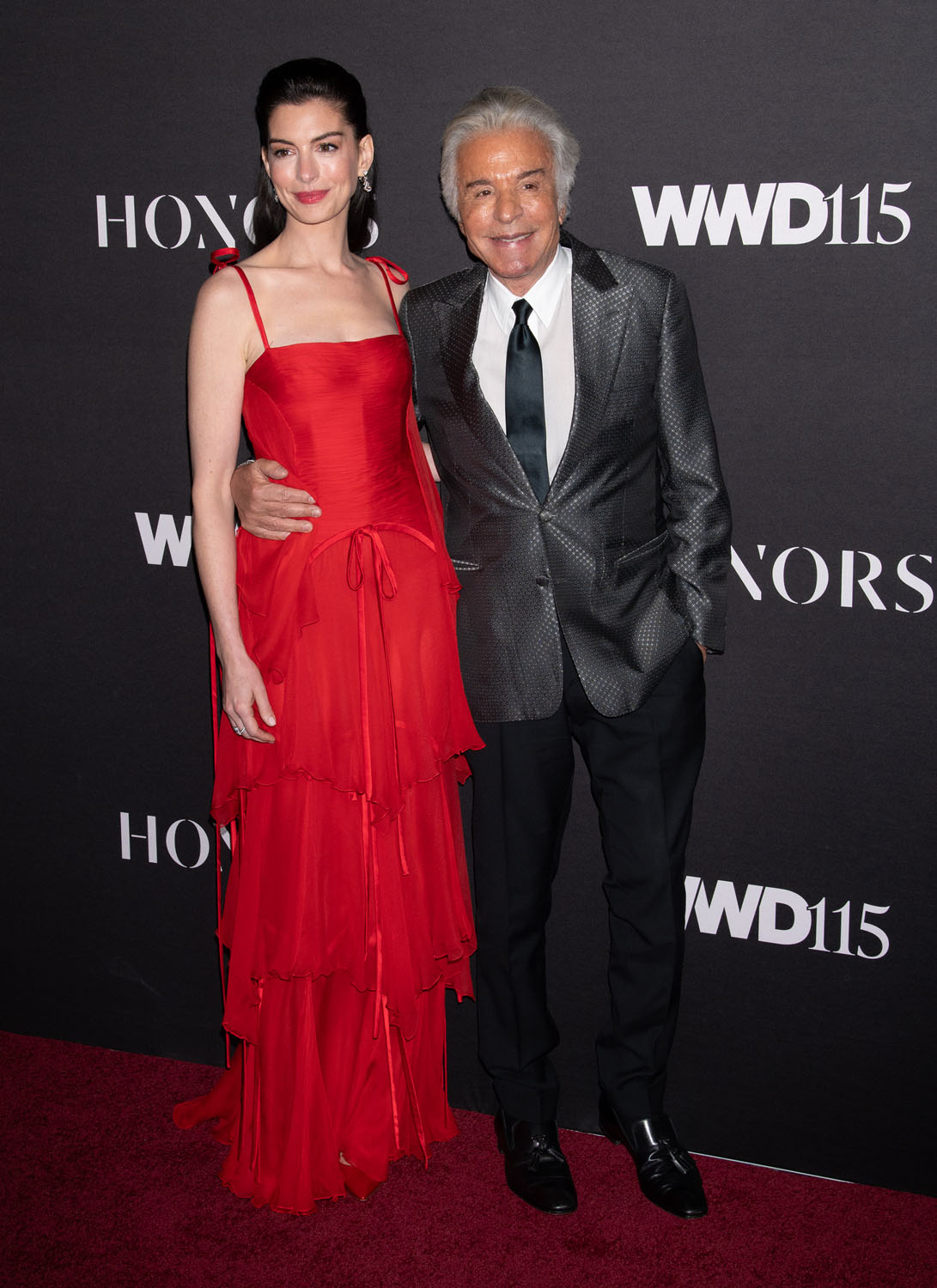 Valentino Garavani and his longtime partner Giancarlo Giammetti were celebrated for their contribution to fashion last night at the WWD Honors event in New York. Valentino is now 93 years old and does not step out in public anymore so Giancarlo was there with Anne Hathaway, a longtime friend of both and the house.