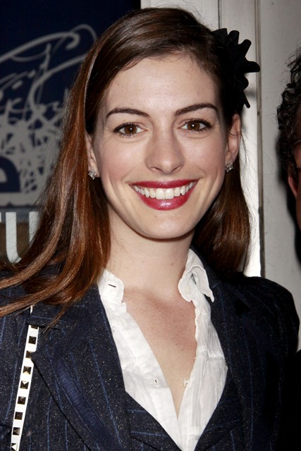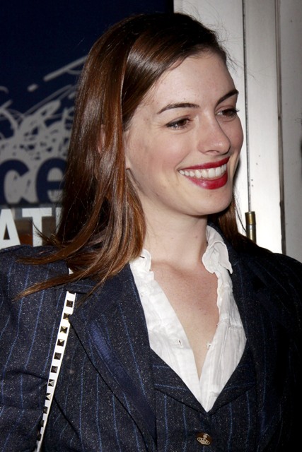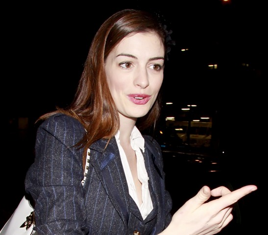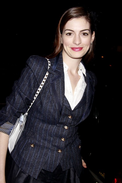 While her Love & Other Drugs co-star is in LA under the microscope for his recent dalliance with Taylor Swift, Anne Hathaway was spotted in New York last night at the opening of the off Broadway production of Angels in America: A Gay Fantasia on National Themes. She was accompanied by her boyfriend Adam Shulman who’s pictured in one of these shots behind her near the cab. I love what she’s wearing.