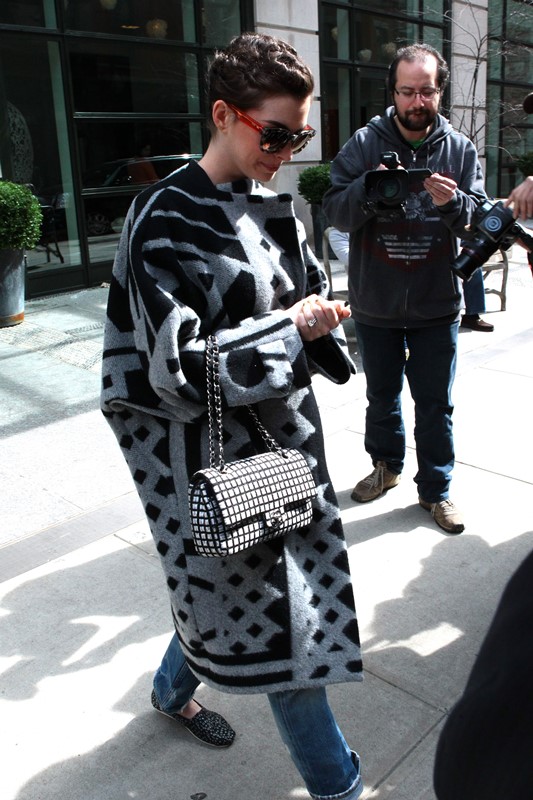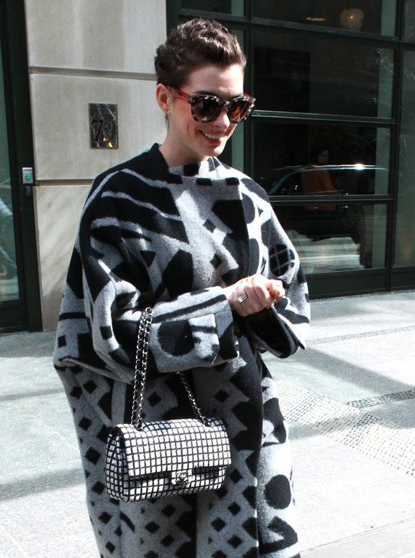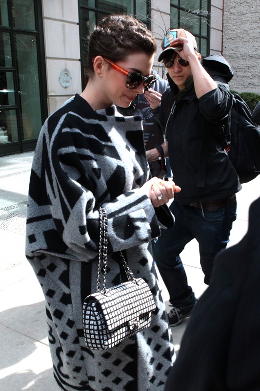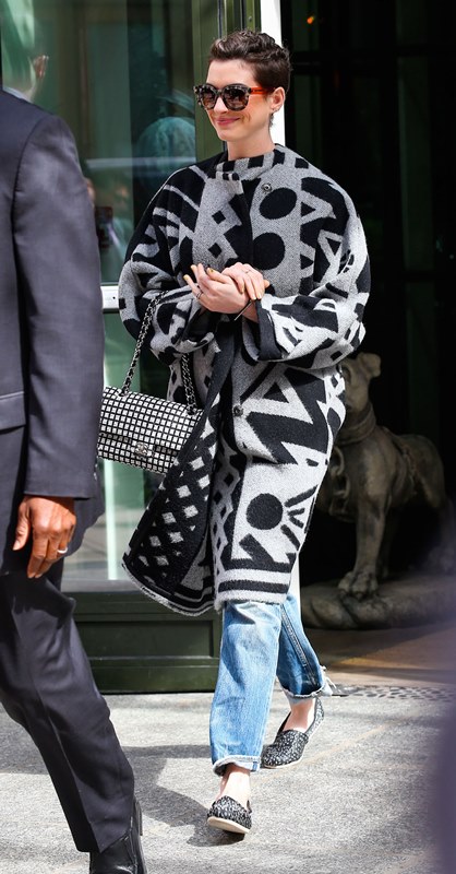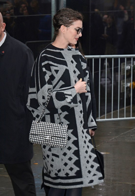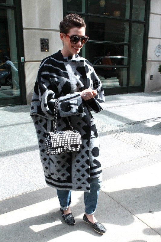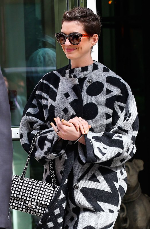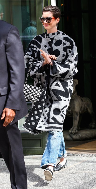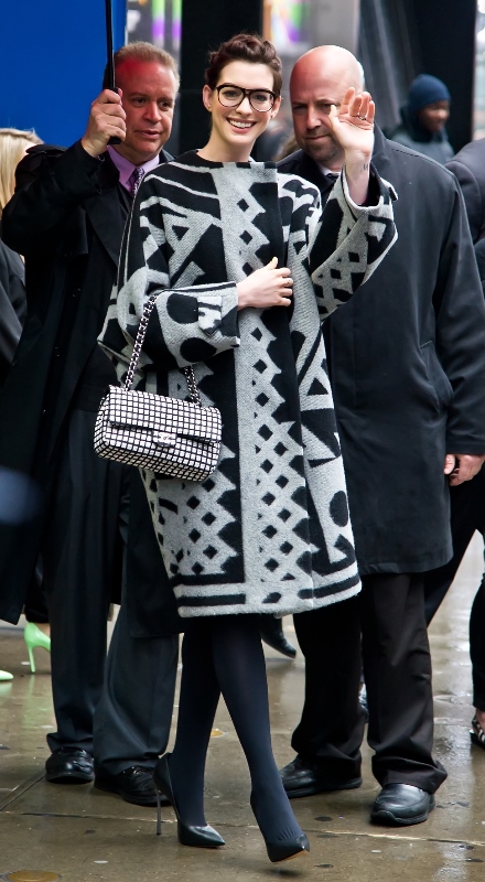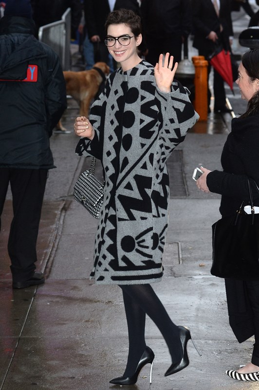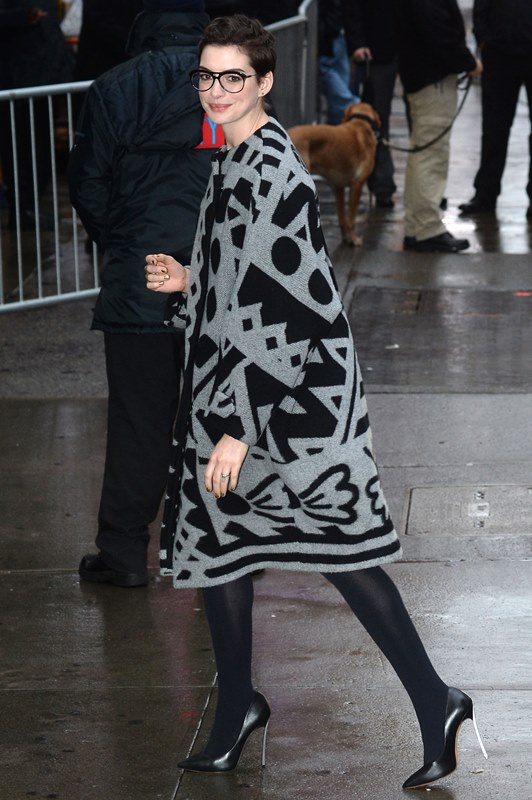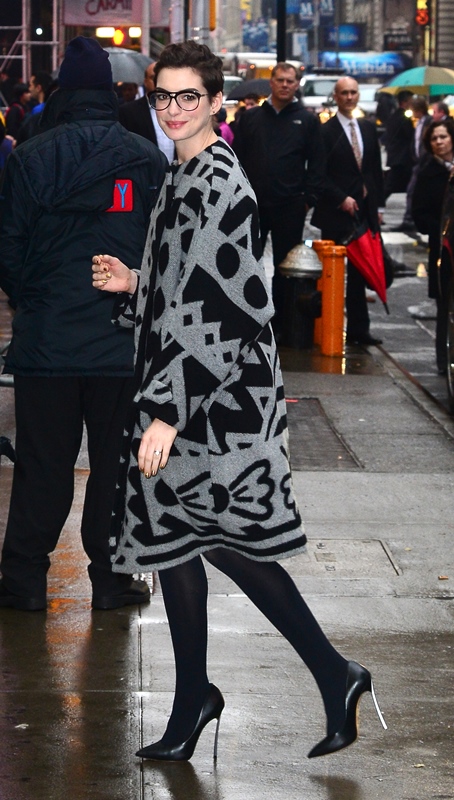 First of all, this sweater coat that she’s been wearing around New York. And those awesome twists they’ve been putting in her hair. That’s funky fresh, right? Hair imagination makes me so happy. And so do those white pumps she’s wearing on Fallon.