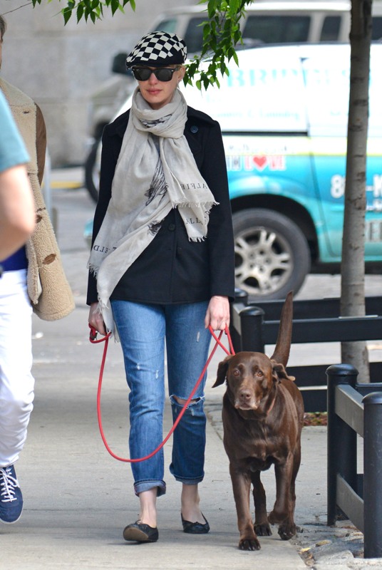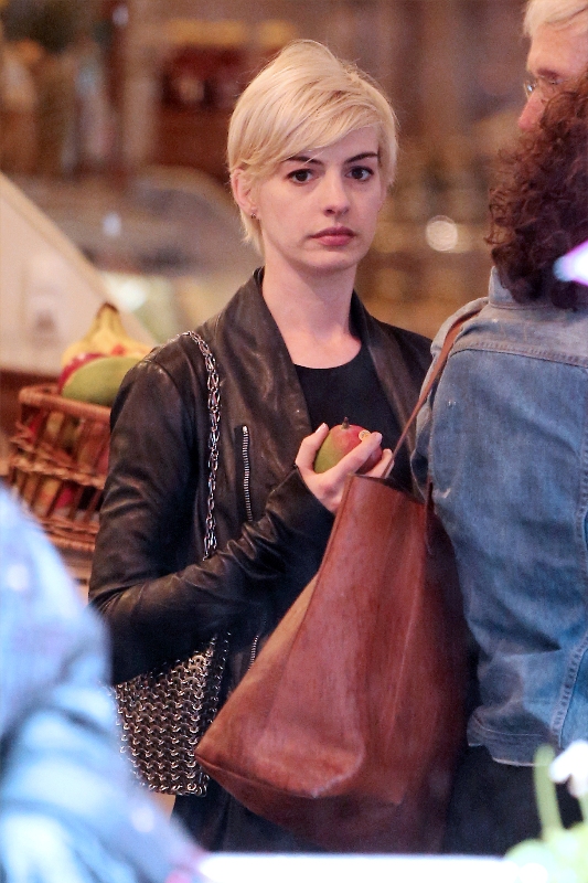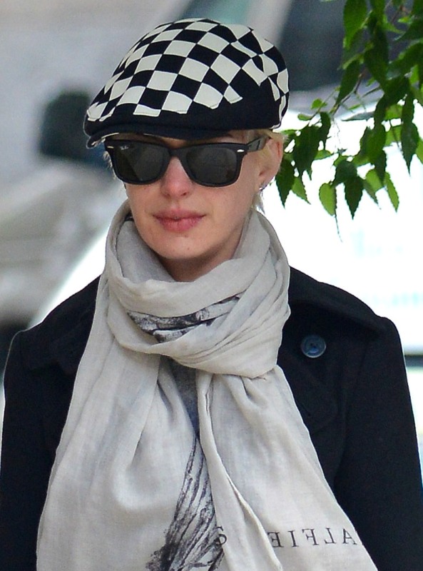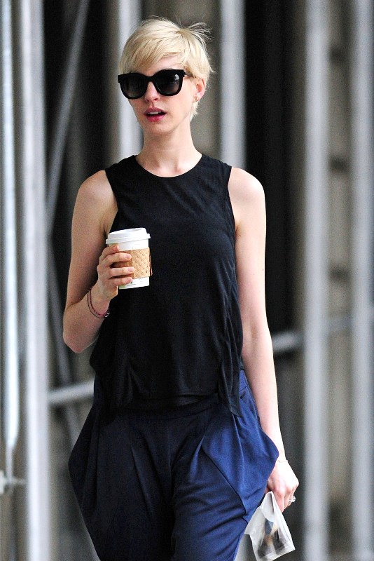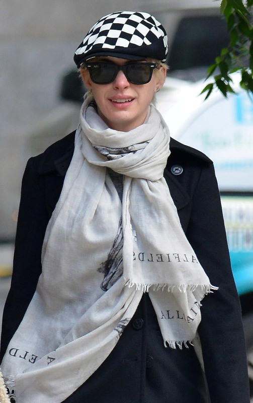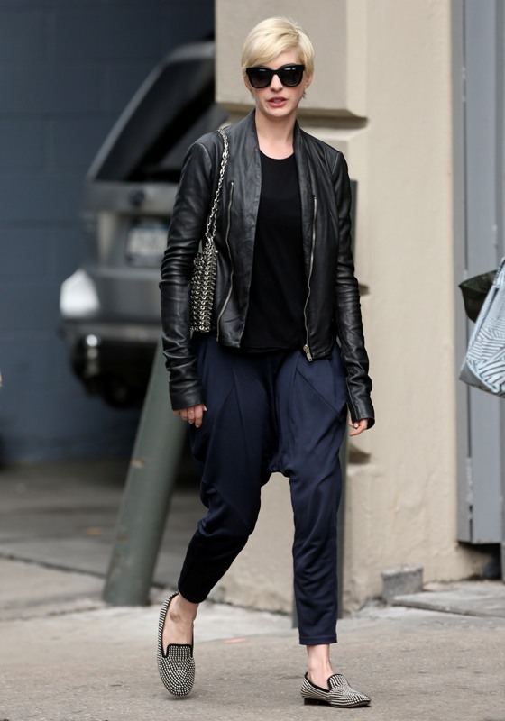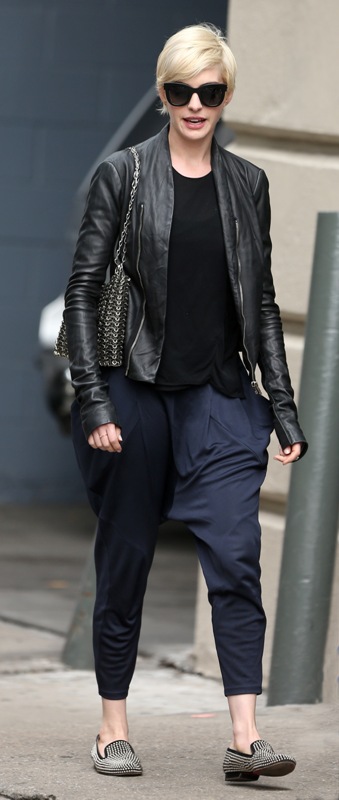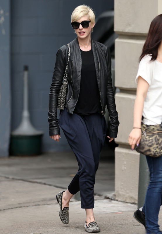 Various photos of Anne Hathaway in New York are attached. Hard to miss her now when she’s so blonde. And when she covers her blonde head with a cap, it’s black and white checked situation that’s not exactly inconspicuous either. That’s a great faux leather jacket she’s wearing in some of these shots. But what about the pants? The hammer pants with the flaring hips?