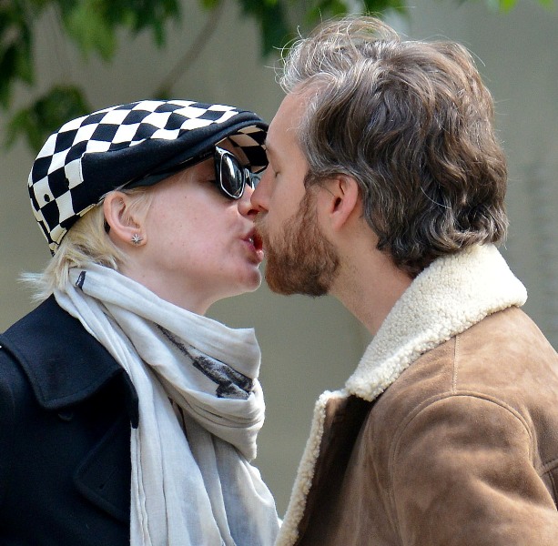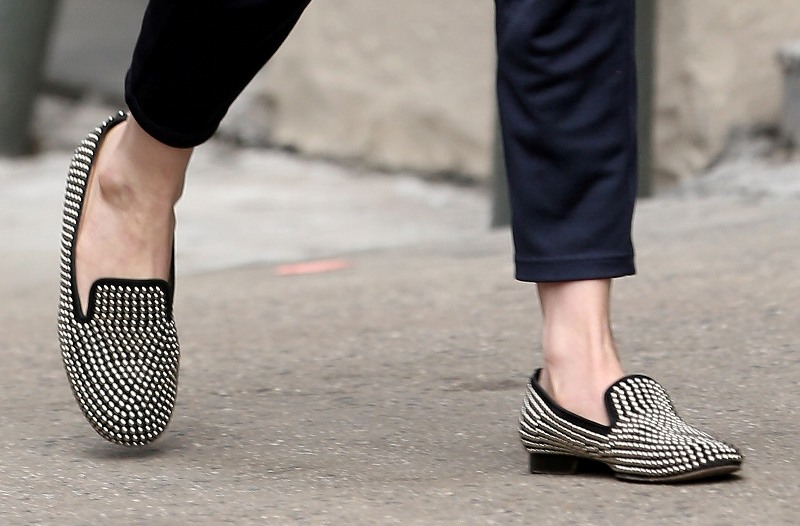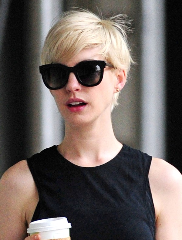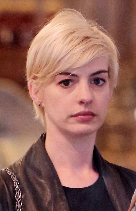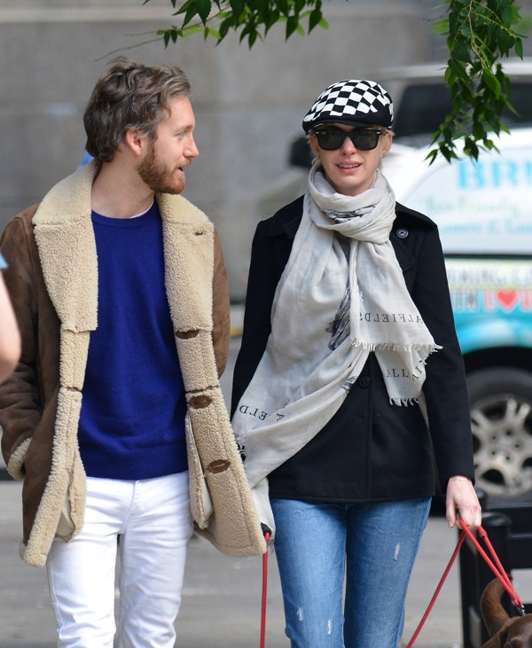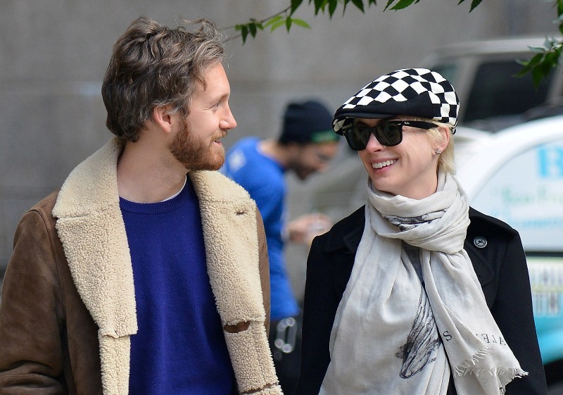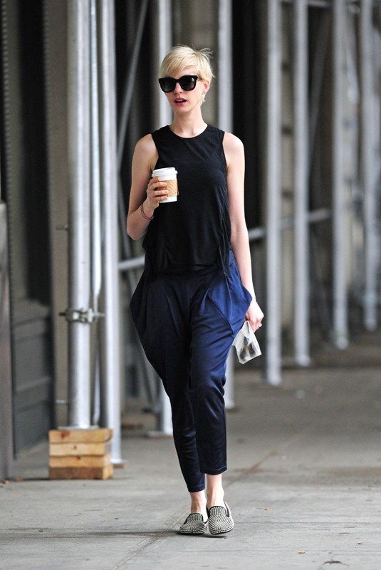 Various photos of Anne Hathaway in New York are attached. Hard to miss her now when she’s so blonde. And when she covers her blonde head with a cap, it’s black and white checked situation that’s not exactly inconspicuous either. That’s a great faux leather jacket she’s wearing in some of these shots. But what about the pants? The hammer pants with the flaring hips?