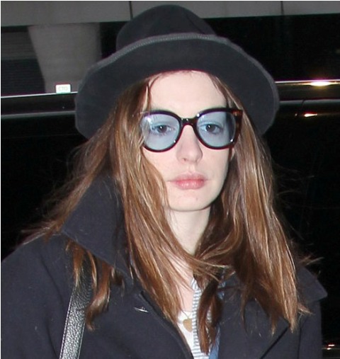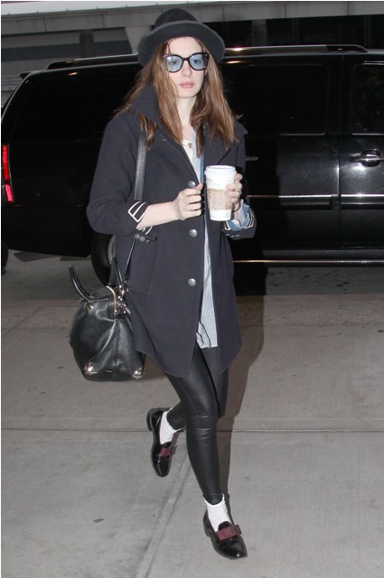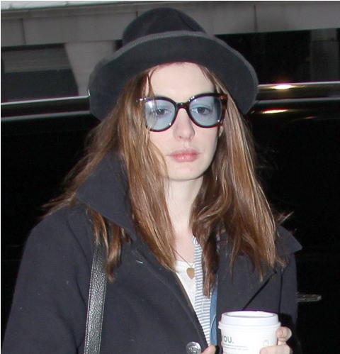 Oscar co-host Anne Hathaway flew from NYC to LA today, was photographed arriving at JFK airport. I guess you could say she’s not Posh. She wanted to be comfortable. Didn’t want to stomp around in Brian Atwoods through the terminal. But if that were the case, why not sweats and Uggs?