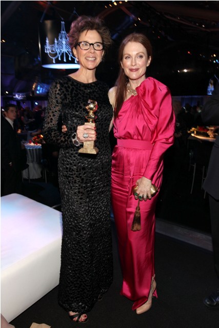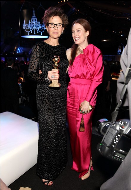 If you’ve seen The Kids Are All Right you know that that script was good and all, but the movie was made based on the relationship between Annette and Julianne and their utterly believable characters and partnership. So it’s amazing to hear that they were two of the driving forces behind it, that Julianne fought to have it made where she needed it to be, or where Annette did (…?) The power of a good girl friendship is that I forgot about that thing that Moore draped on her body – and so did Bening. They give the impression of an older and younger sister duo – standing to the side when Kids won, so delighted, in that awkward little hug.
