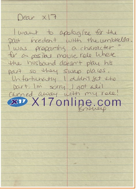 The latest offering is a gem – Britney’s thinly veiled jab at Kevin Federline via “apology” note to X17 in reference to the time she shaved her head and attacked them with an umbrella: