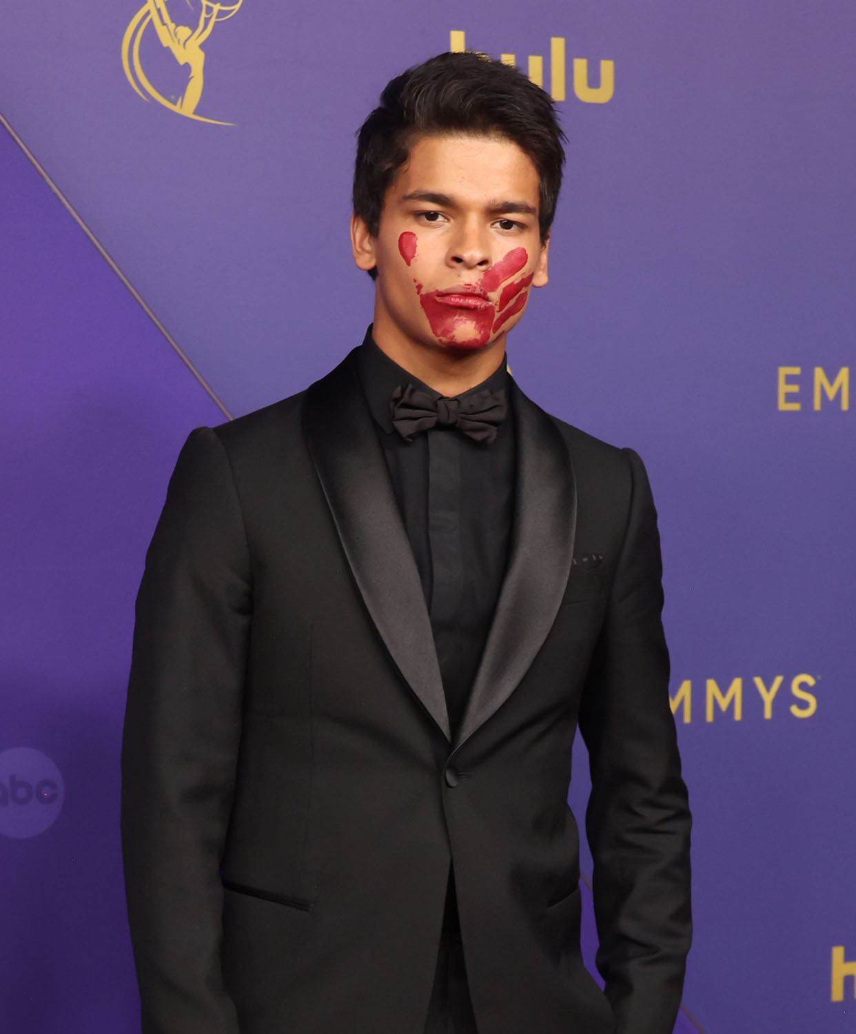 Also, D’Pharaoh Woon-A-Tai, a first-time nominee for Outstanding Lead Actor in a Comedy Series, showed up in a classic black-on-black tux (by Emporio Armani), but with a red handprint across his mouth. It’s a symbol of solidarity with the Missing and Murdered Indigenous Women of North America. You can learn more about MMIW and how to get involved at Native Hope.