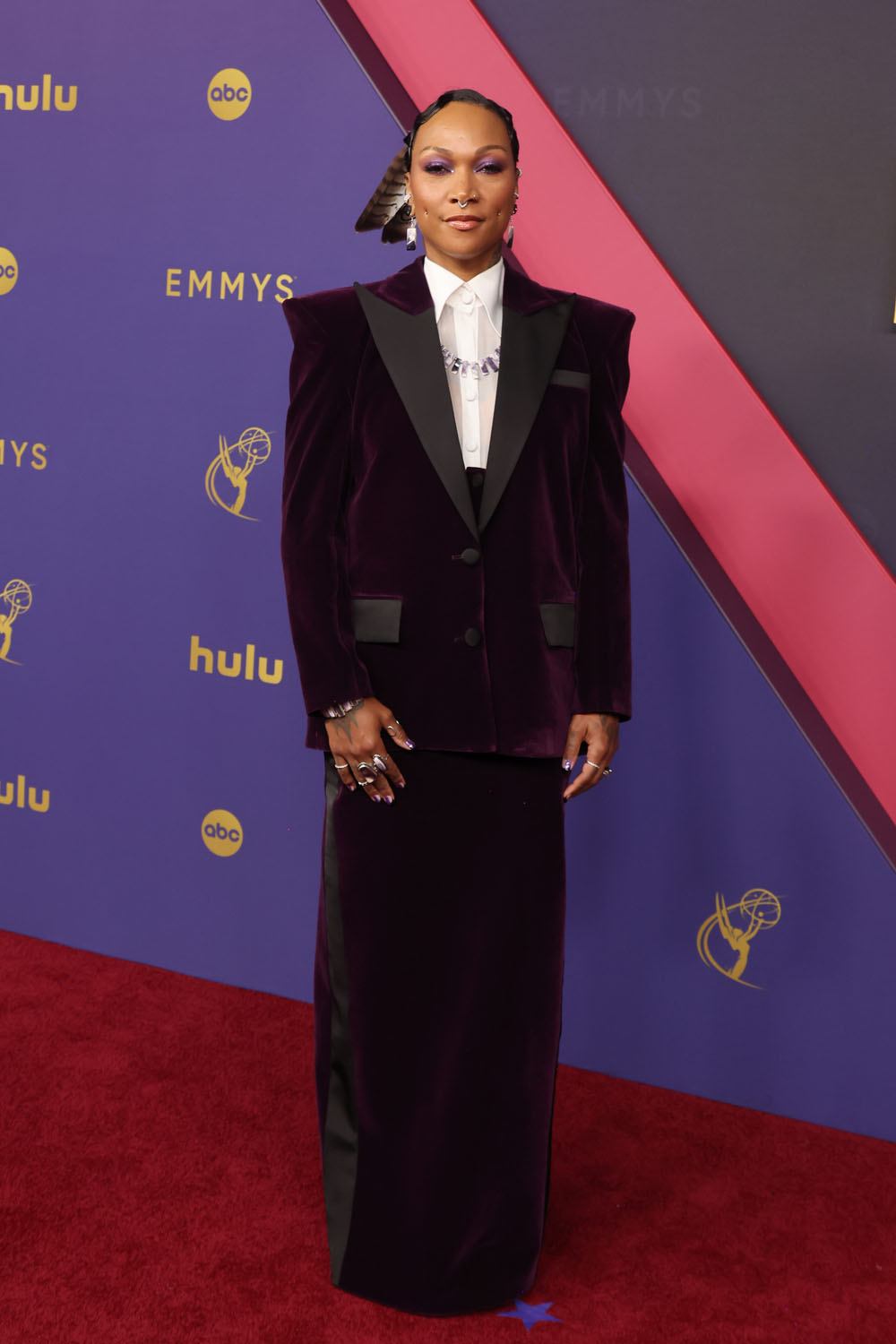 And then there is Kali Reis, boxer turned actor and also a first-time nominee for True Detective: Night Country. She wore a deep purple tuxedo skirt/suit, with the color signifying wampum used by the Northeast Woodland Tribes (Reis is from the Seaconke Wampanoag tribe).