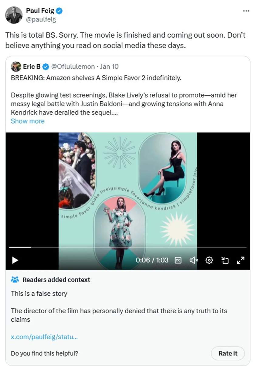 Another Simple Favor ends another dumb rumour