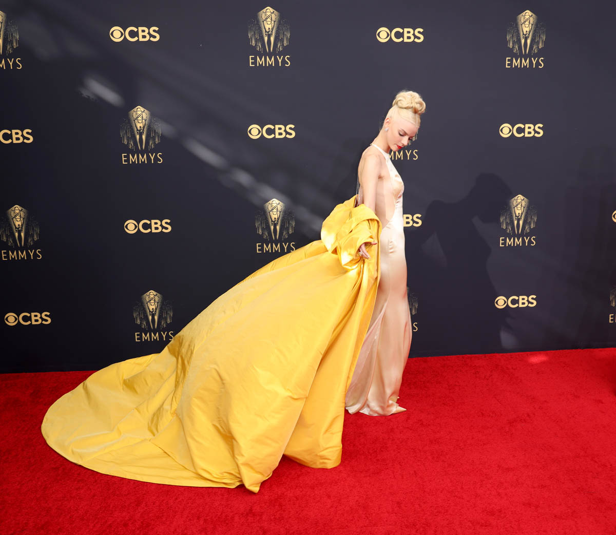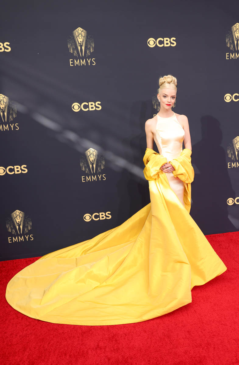 Anya Taylor-Joy has rapidly become a red carpet star, delivering one stunning look after another aided by her stylist, Law Roach, and the Emmys were no different. She showed up in a pale-yellow Dior gown with a bright yellow cloak which was ALL DRAMA. She wore a similar Dior ensemble to the Golden Globes, and while I give the edge to that dress—that shade of emerald!—her Emmys gown stood out the most for me. The bright yellow is on trend for the night without being exactly in the trend, as the dress itself is a pastel. And the fit! Is that dress just fully taped to her? I want to understand this engineering! The rest of the look is flawless, too. The jewelry is Tiffany, of course, as ATJ is a brand ambassador. And the hair is perfect old-school glamour, and the red lip is on point. Here’s how much I like this whole look—I don’t really even like the color yellow, and I love this.