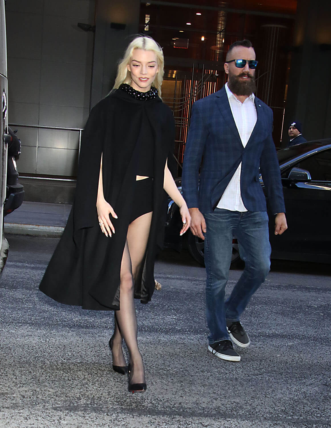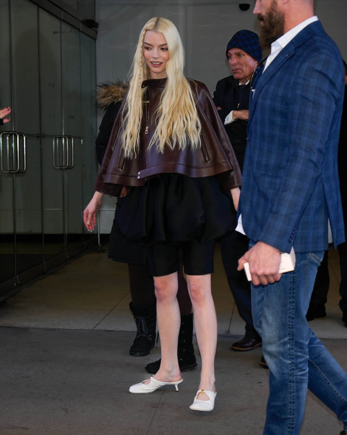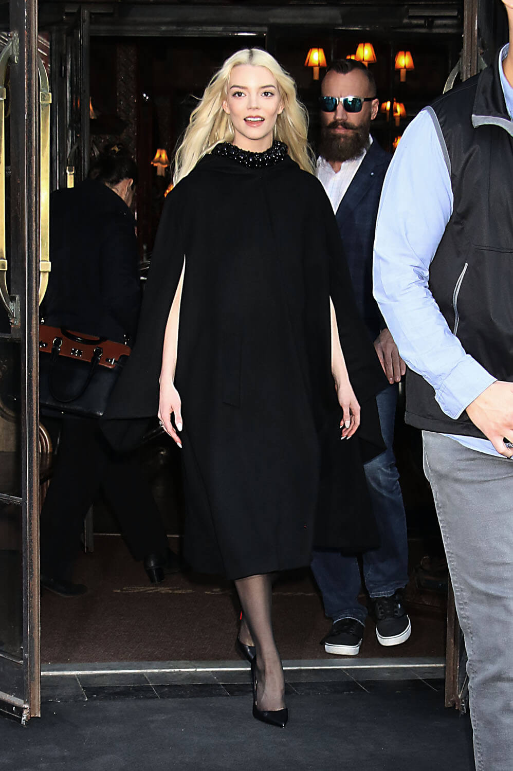 Now, back to Anya’s promotional wardrobe. There was a black cape over booty shorts and a crop:
