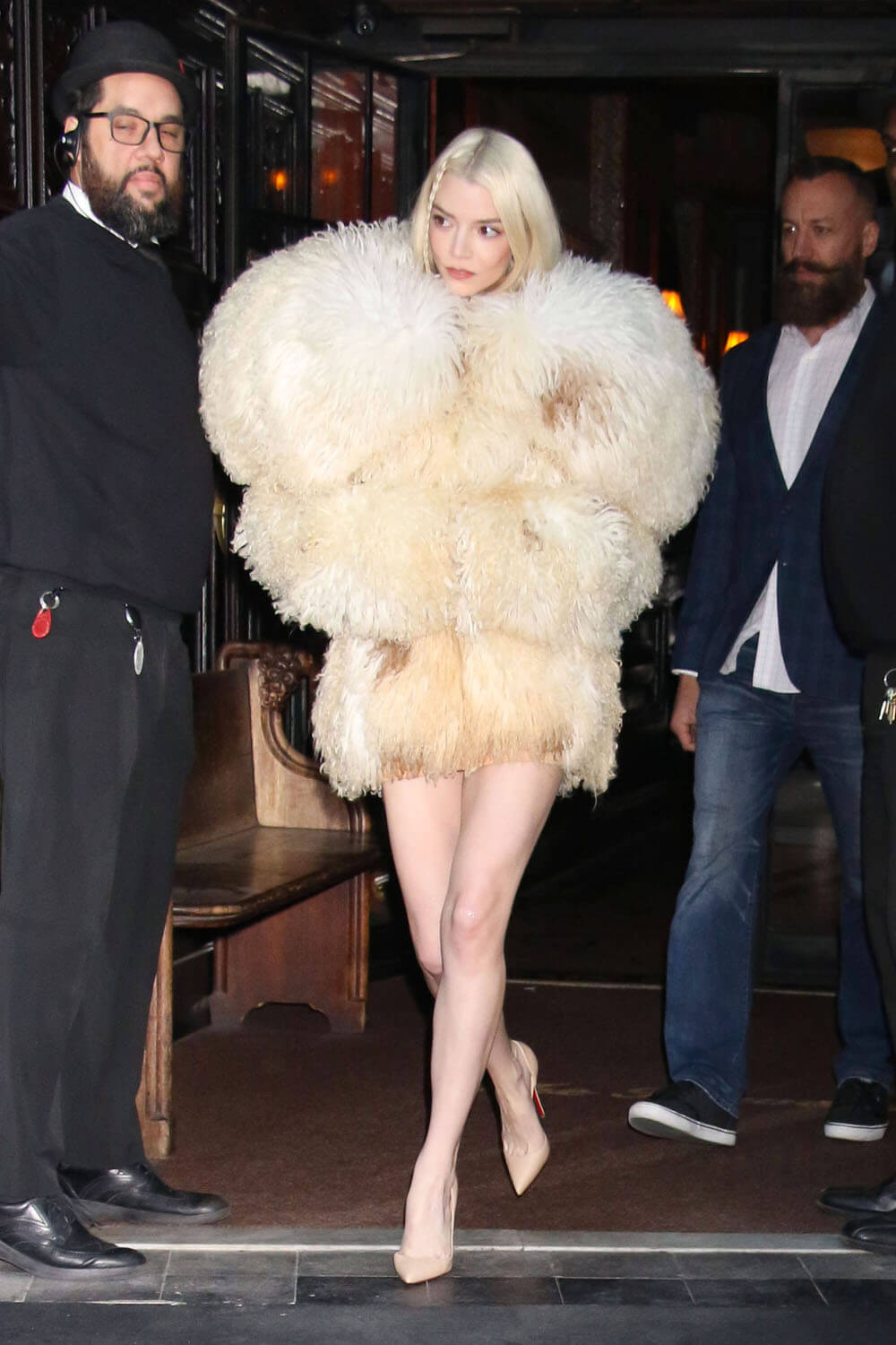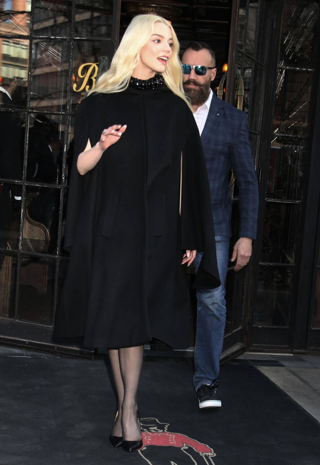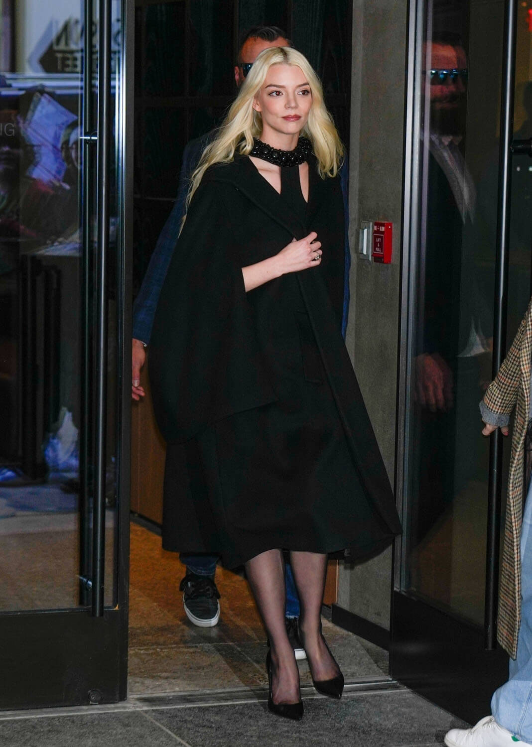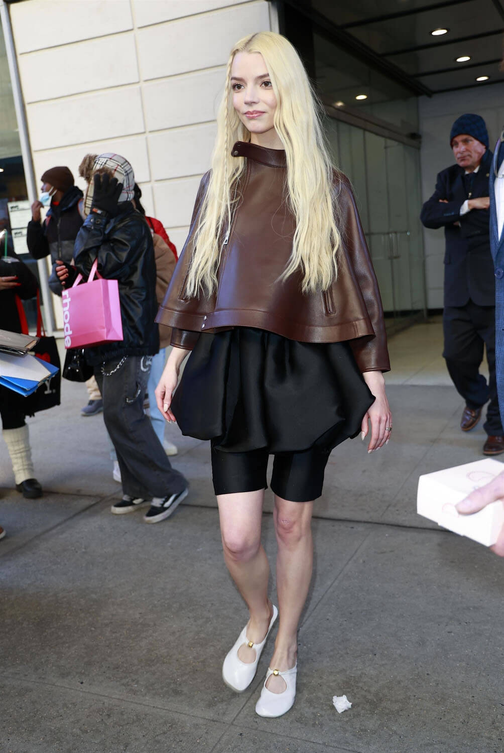 Now, back to Anya’s promotional wardrobe. There was a black cape over booty shorts and a crop: